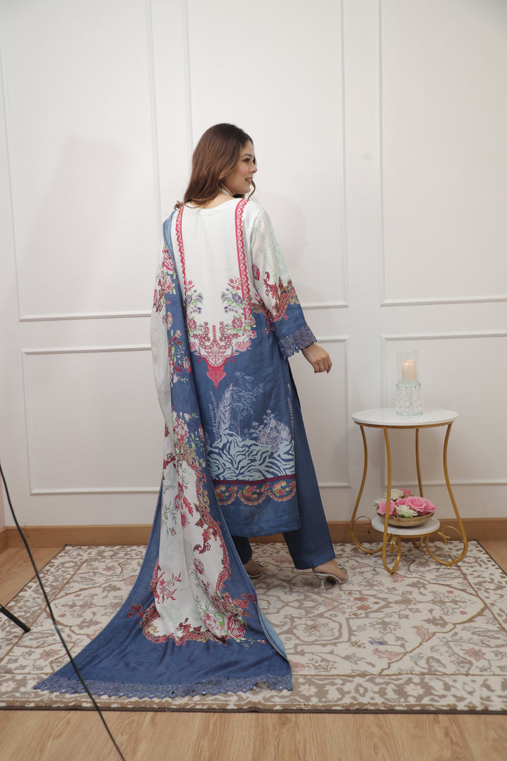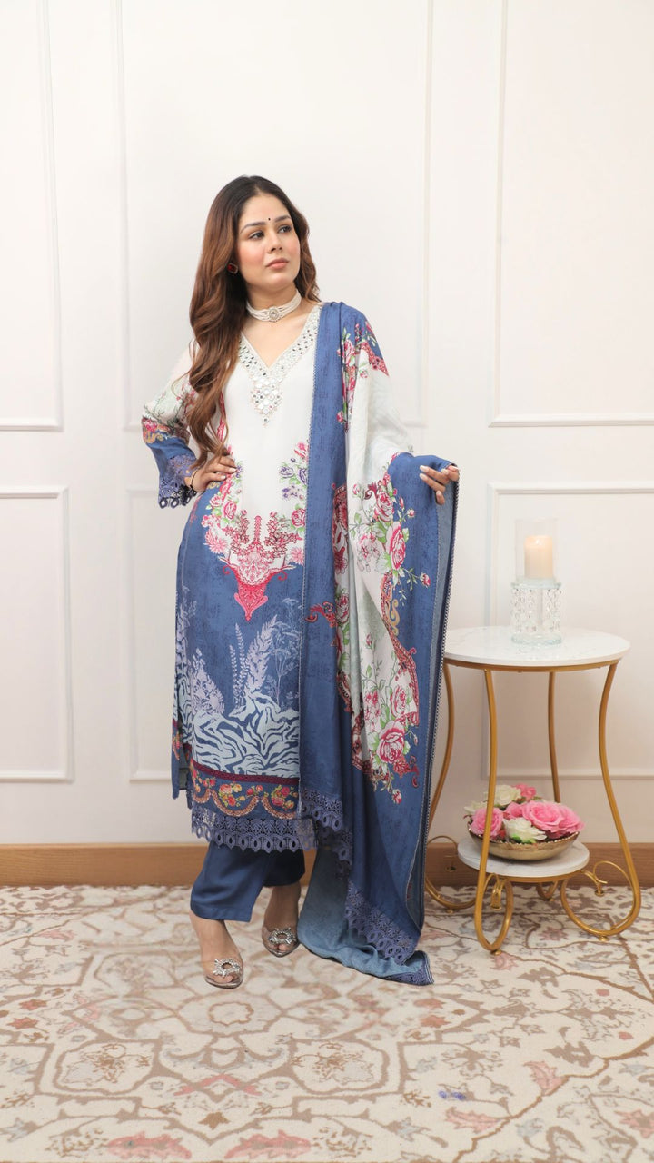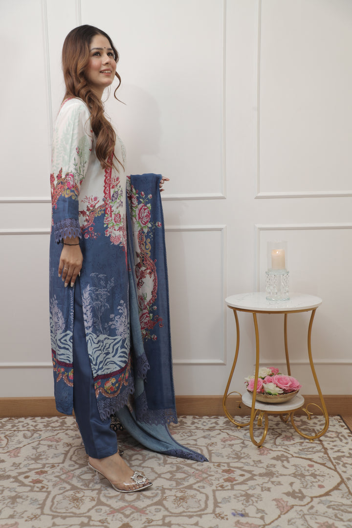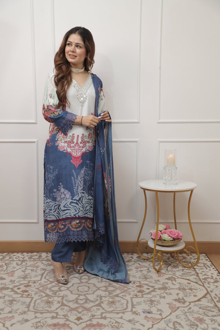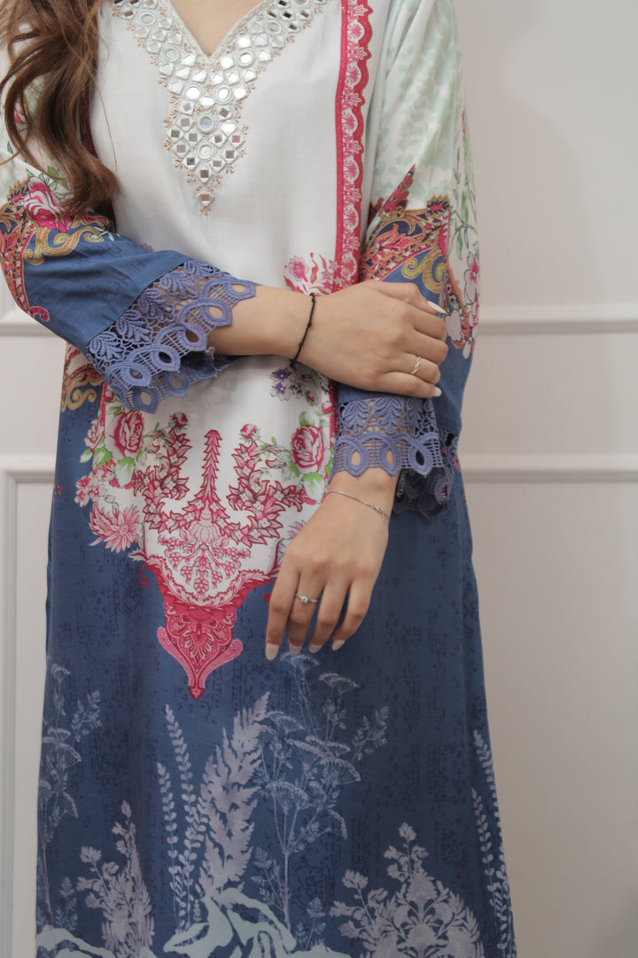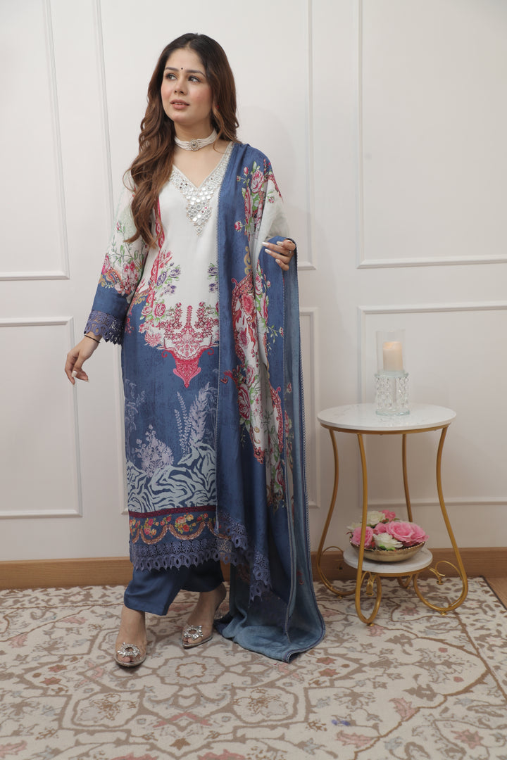 Straight Suit with all over digital print, mirror work, thread work and hand work on the shirt with lacework on the hemline and sleeves with lacework on digital printed dupatta