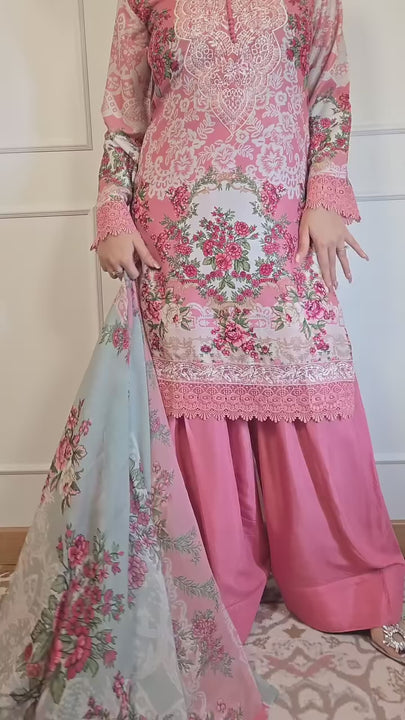 Suit with all over digital print with patching work and handwork on the neckline, hemline and sleeves shirt paired with beautiful Farshi Salwar and beautiful digital printed dupatta