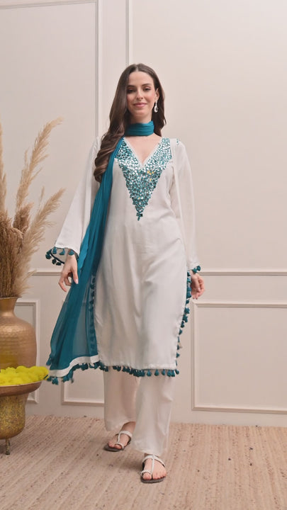 Description:- Straight shirt with beautiful hand embroidered neckline with real mirrors and beautiful tassels on the edges of the shirt paired with pants and contrast dupatta tha has beautiful tassels border all over the dupatta.Along with potli with real mirror and beautiful tassels on it.