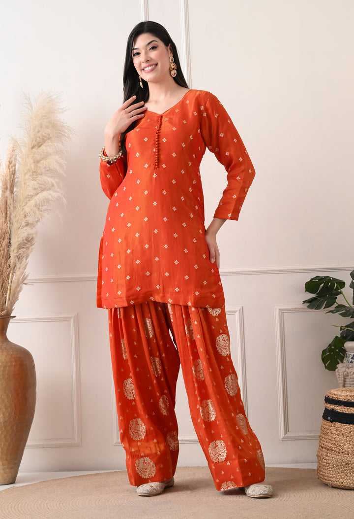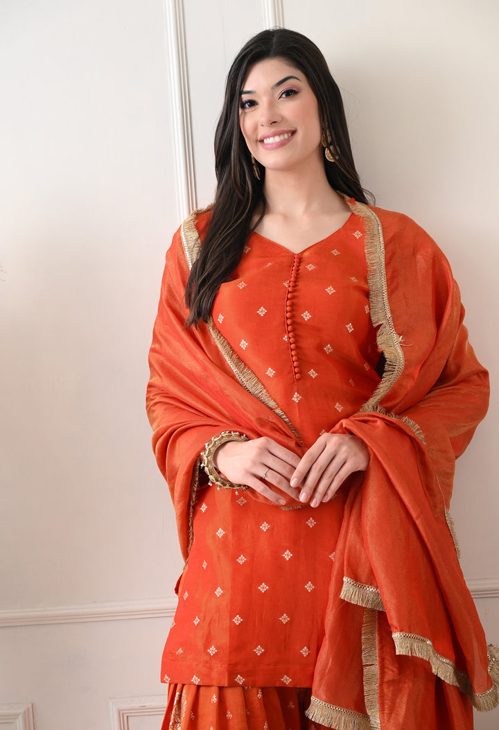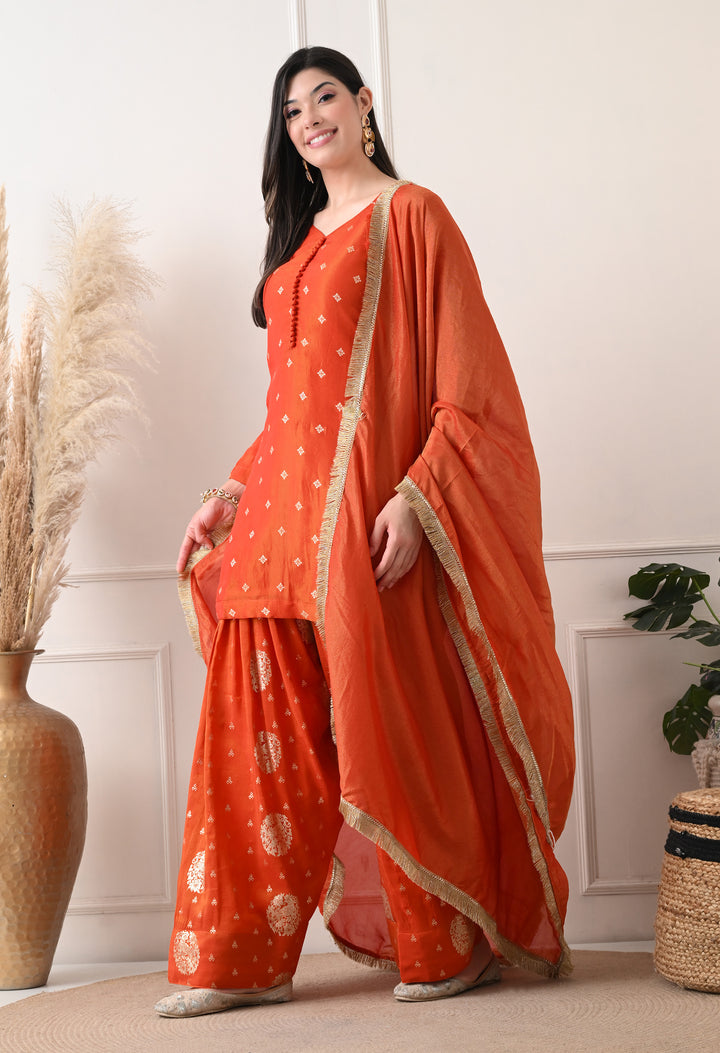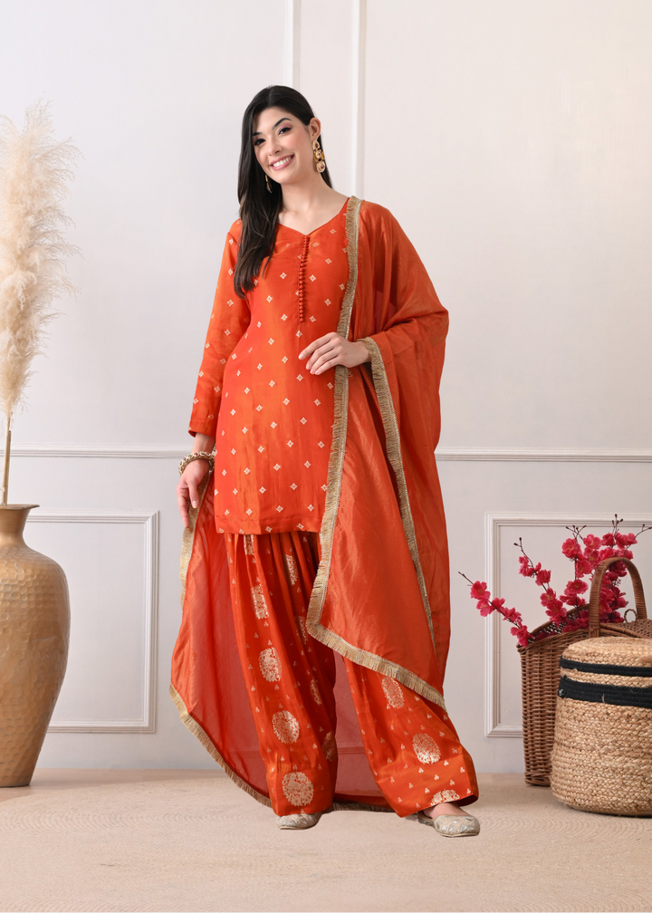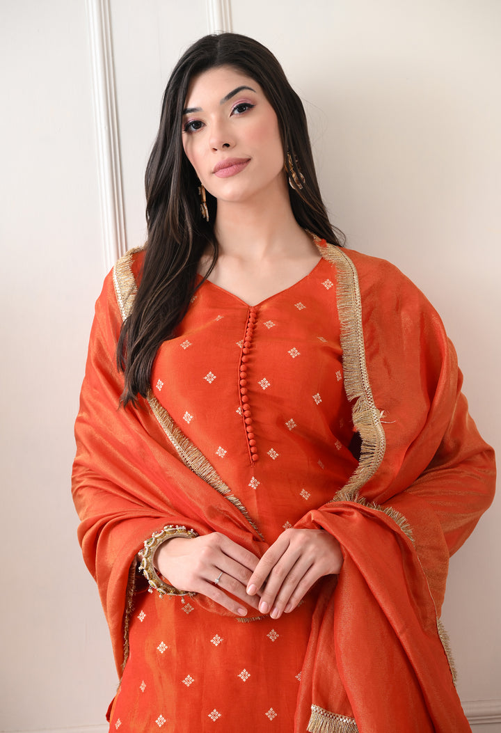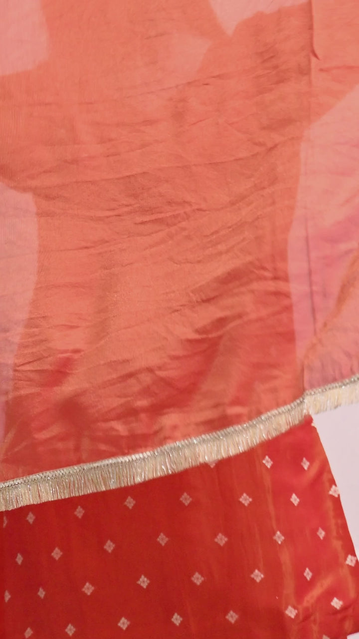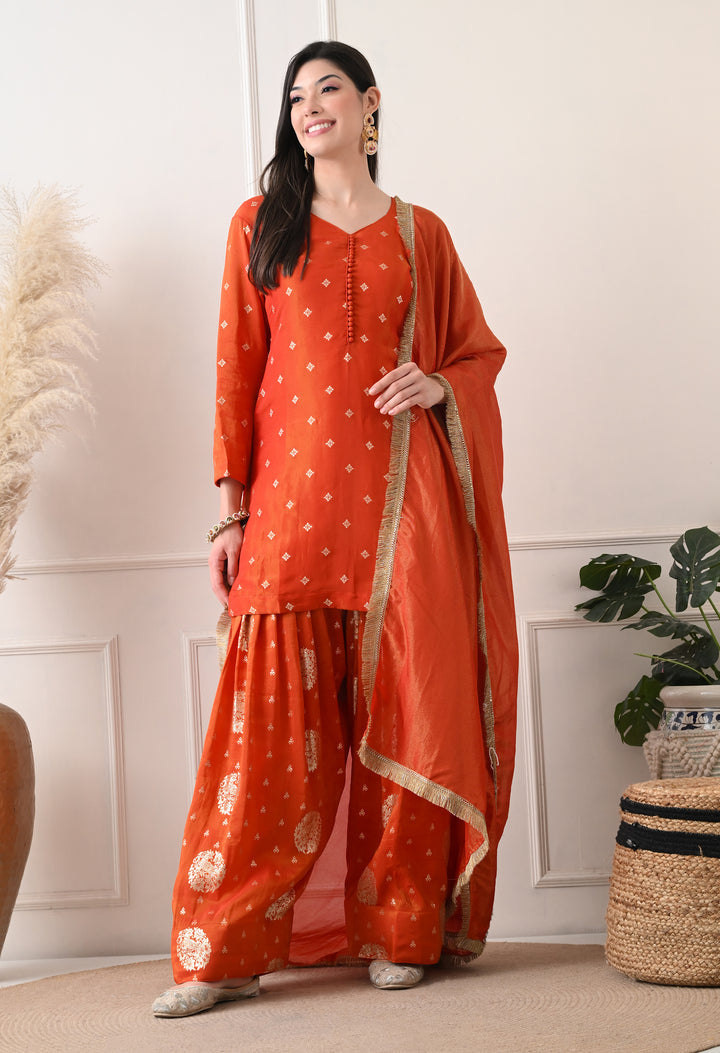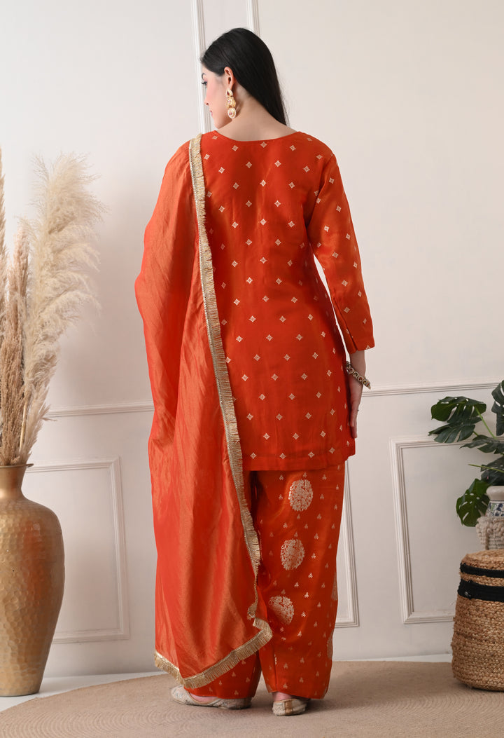 Beautiful Banarasi suit with all over weaving on the shirt paired with banarasi farshi salwar and lacework on dupatta