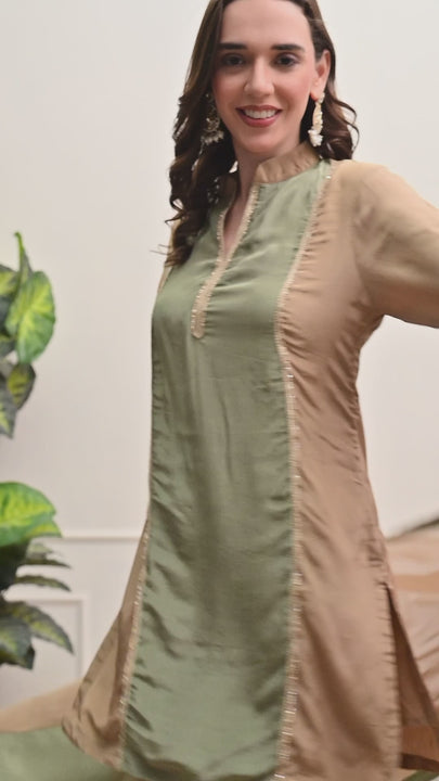 Two coloured suit with lace work on suit and farshi salwar and beautiful double coloured dupatta