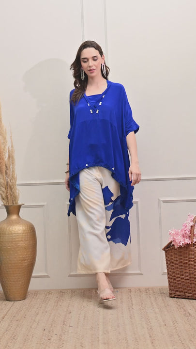 A cut top with beautiful buttons and lace work on the hemline of the top with contrast divider with beautiful digital print