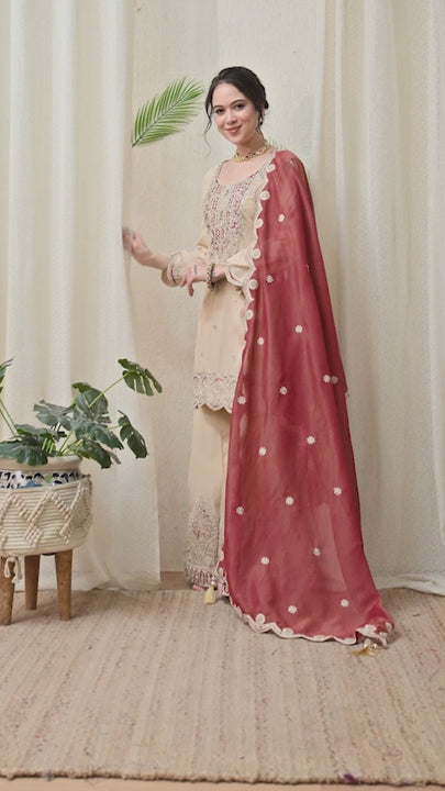 Description:Beautiful shirt with hand embroidered zari and zardozi work Moti work Sippi work and mirror all over the shirt with gharara with beautiful embroidery all over it and cutwork at the bottom of shirt and sharara . Along with contrast dupatta with border and tassels all over .