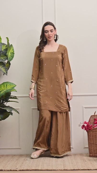 Suit with hand embroidered booti all over shirt with beautiful lacing on Sharara along with pure organza dual tone dupatta