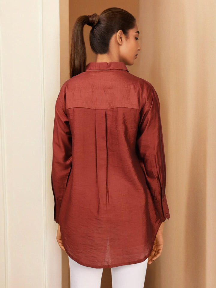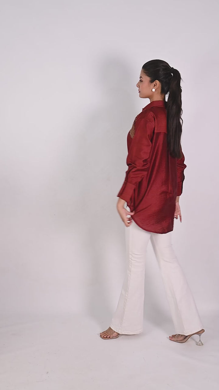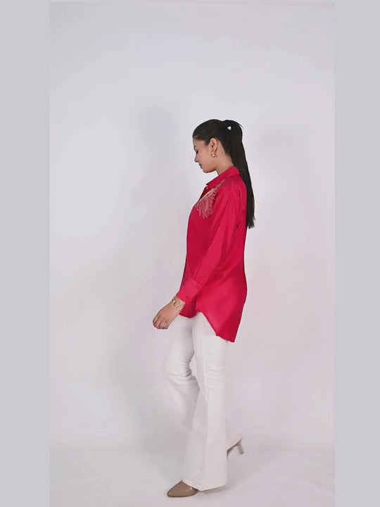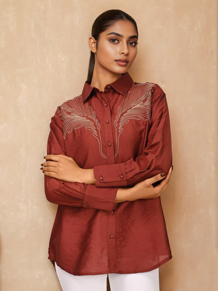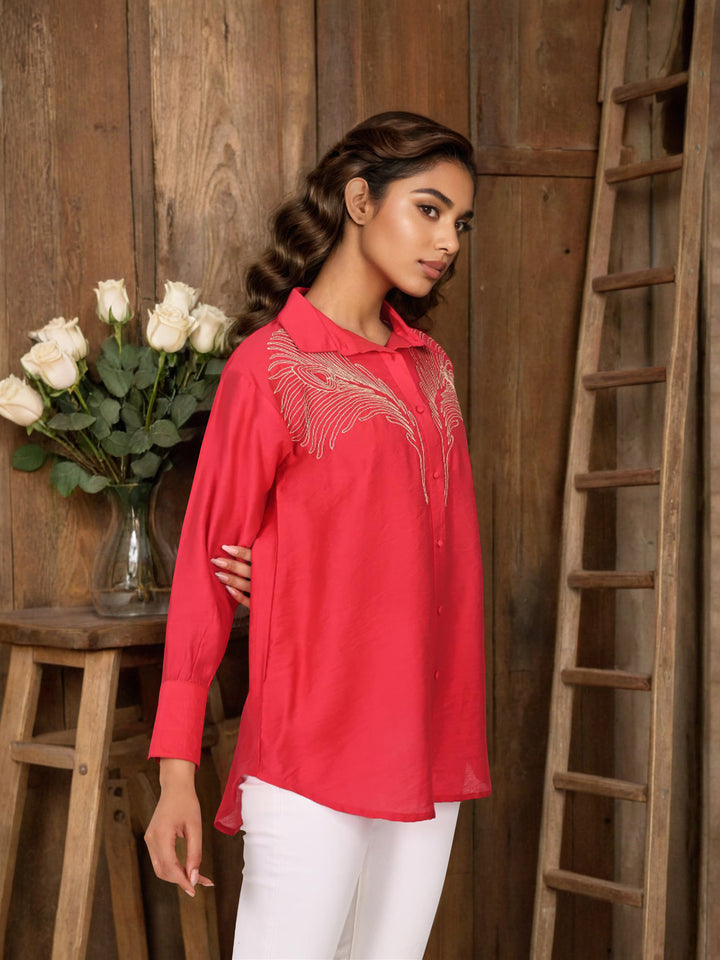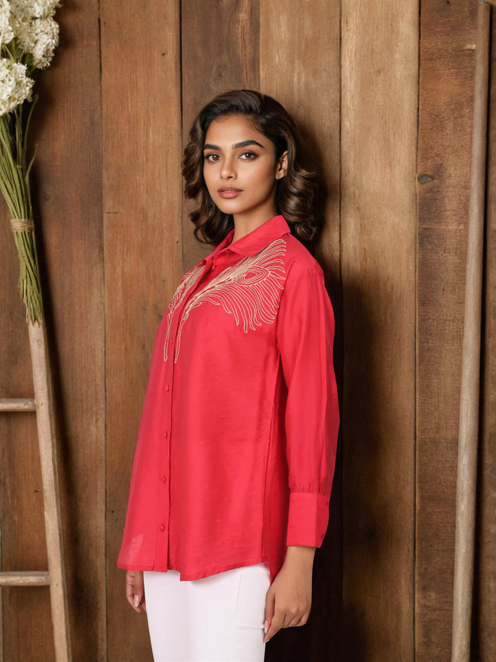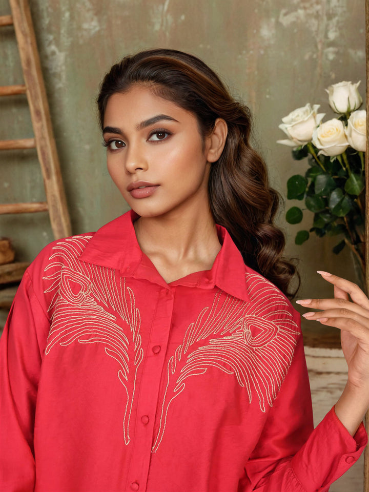 A bold crimson button-down shirt featuring delicate feather-inspired embroidery in soft golden tones. The shirt is styled with full sleeves, buttoned cuffs, and a relaxed fit, making it both comfortable and graceful.