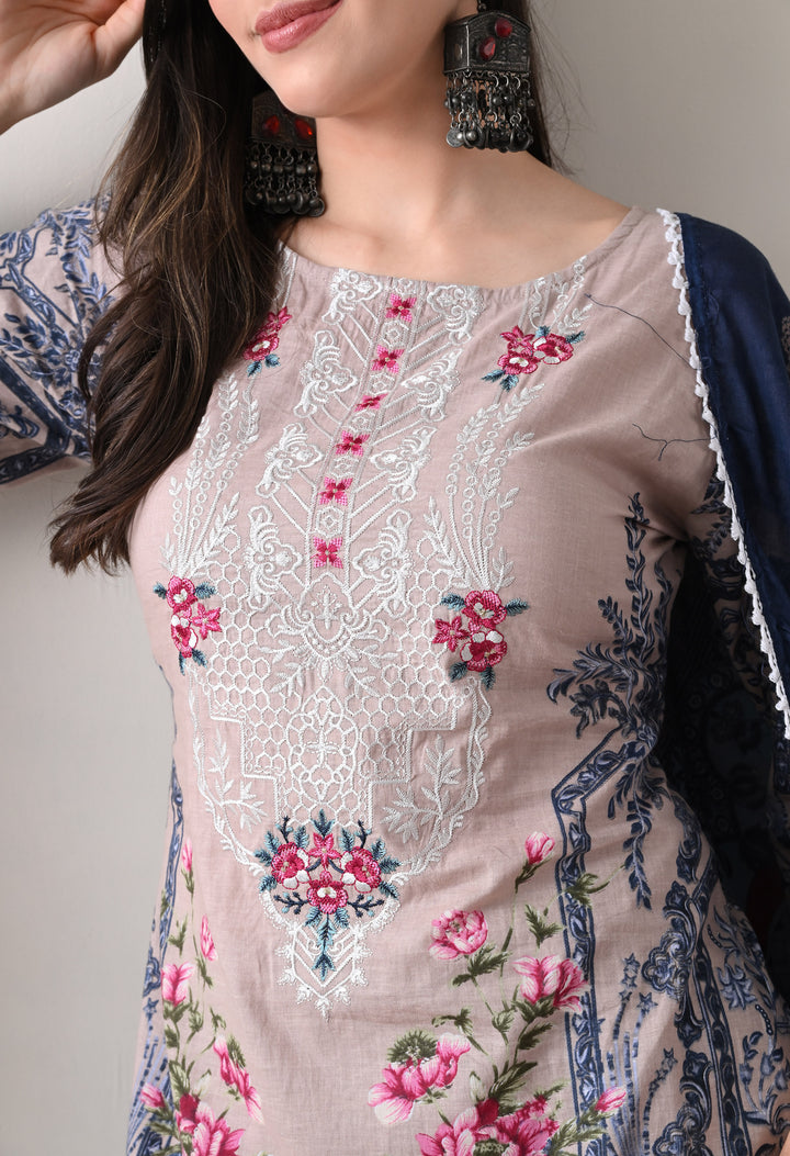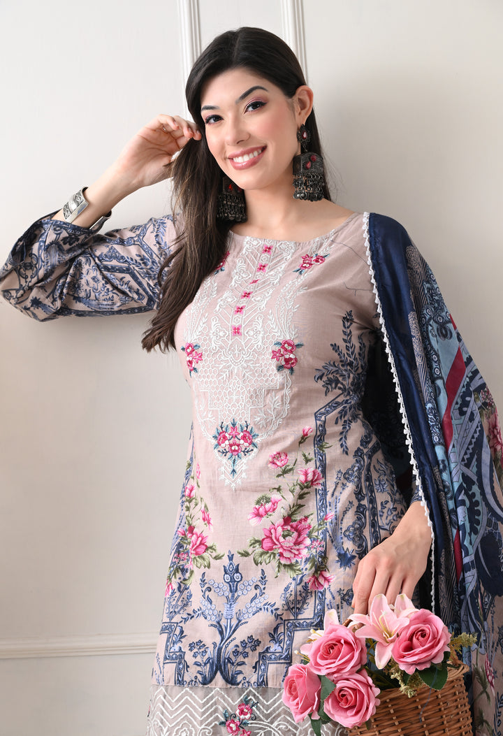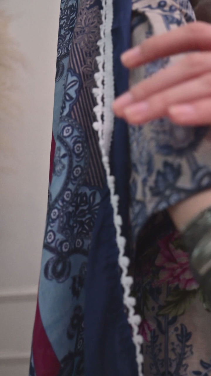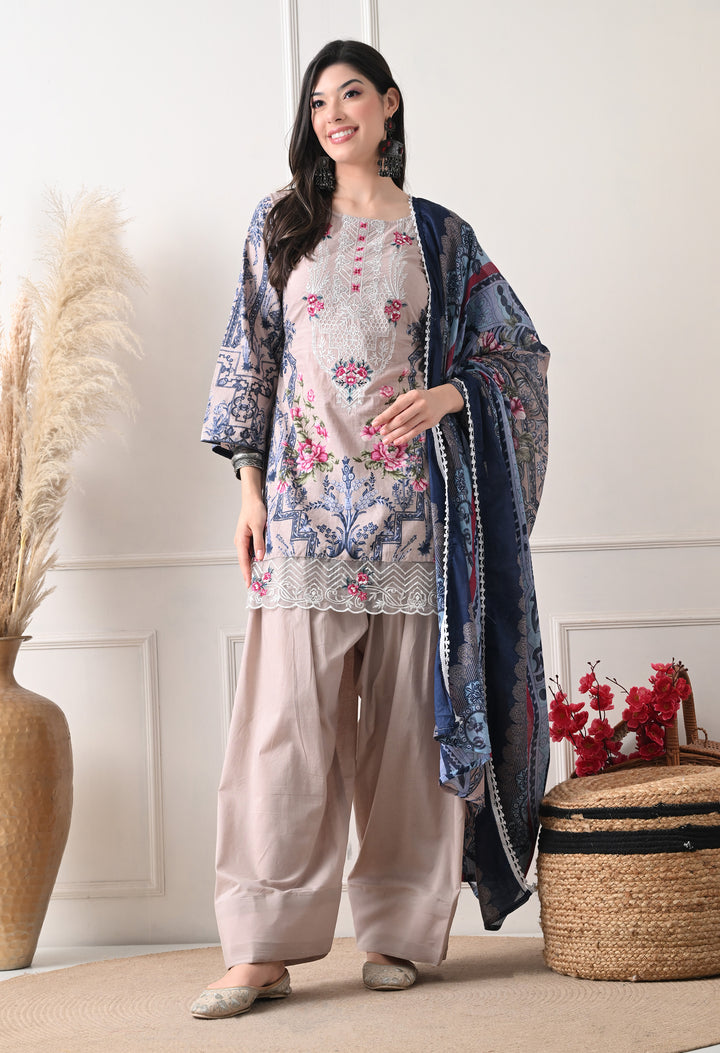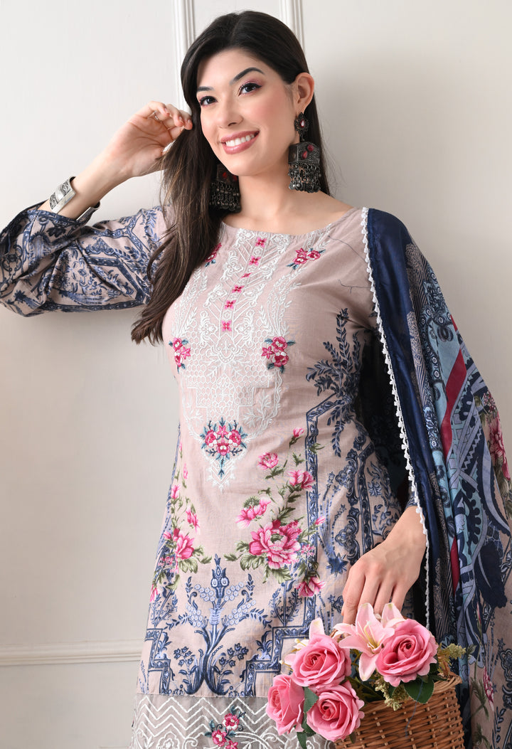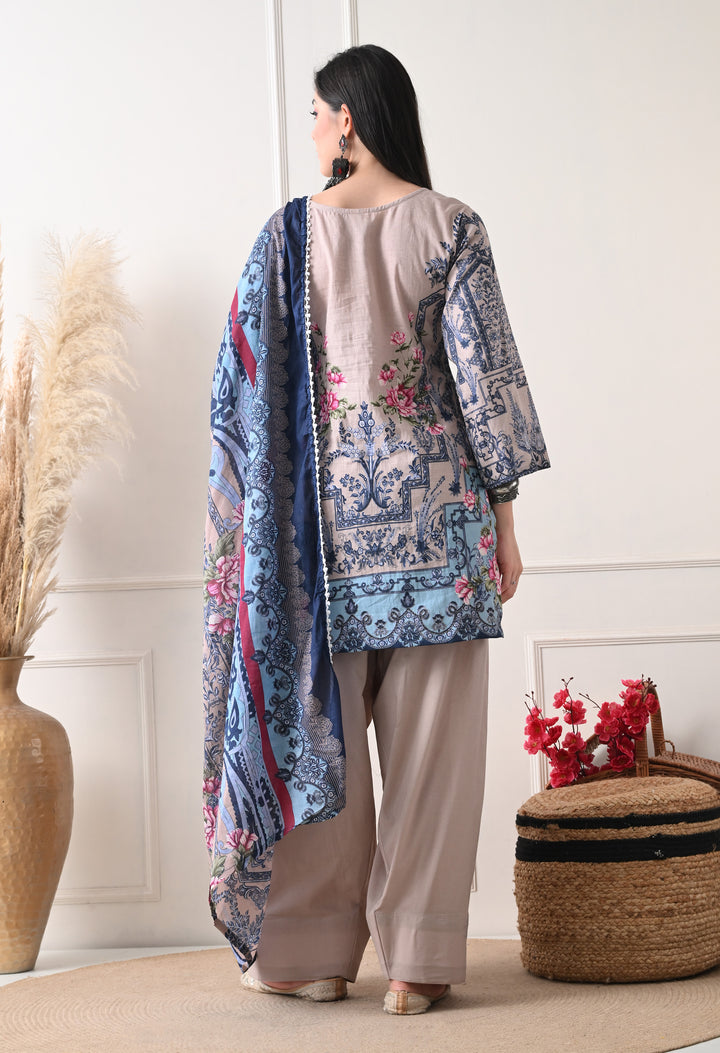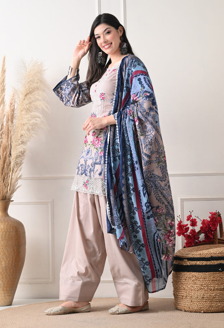 Pakistani Style Farshi suit with all over digital print and lacework on the shirt paired with farshi salwar and digital printed dupatta