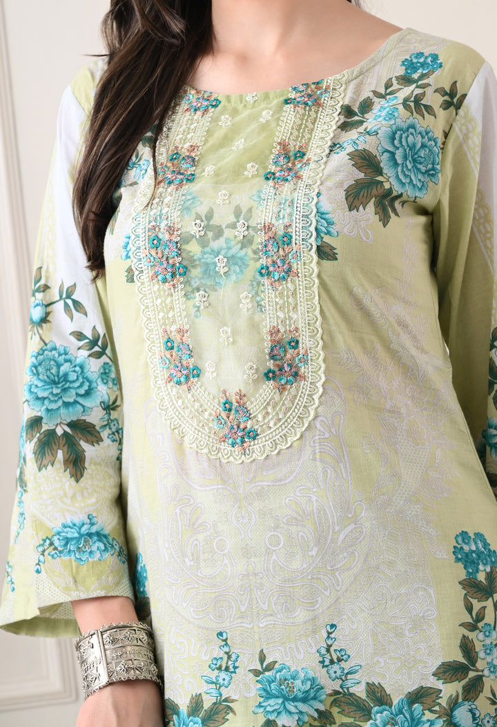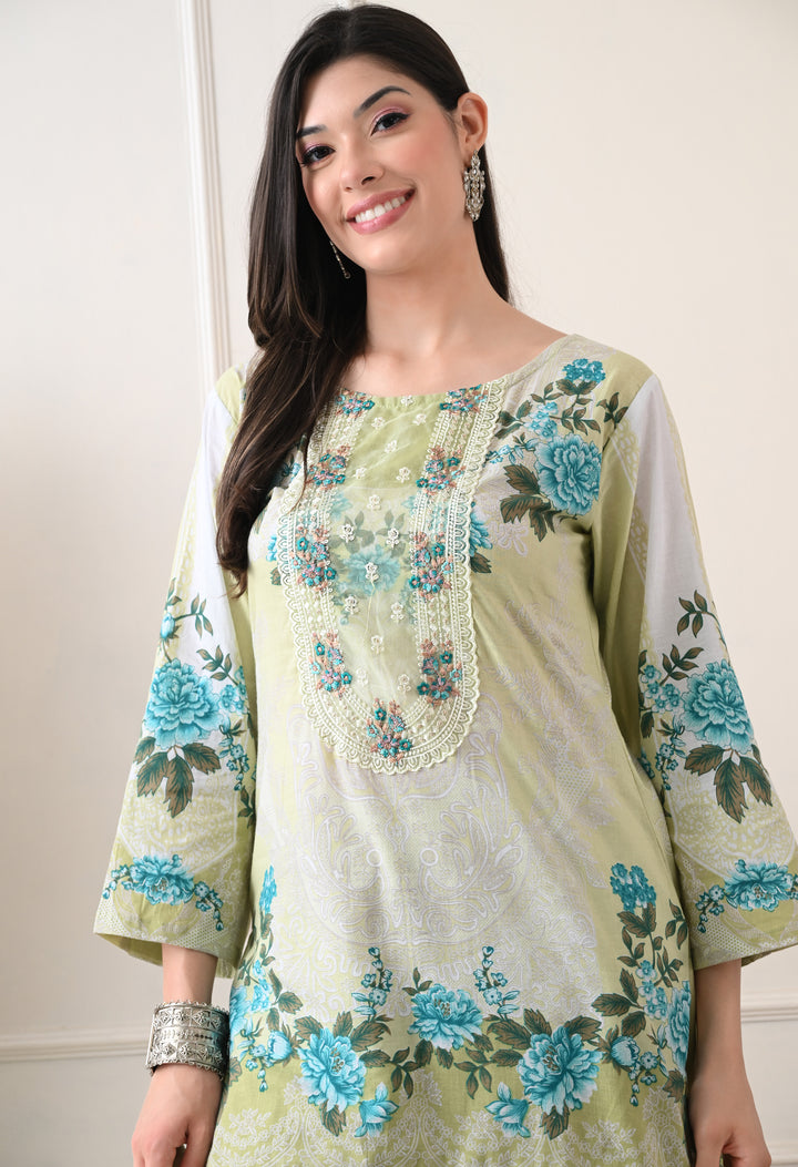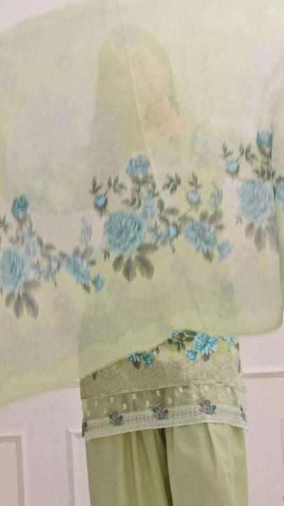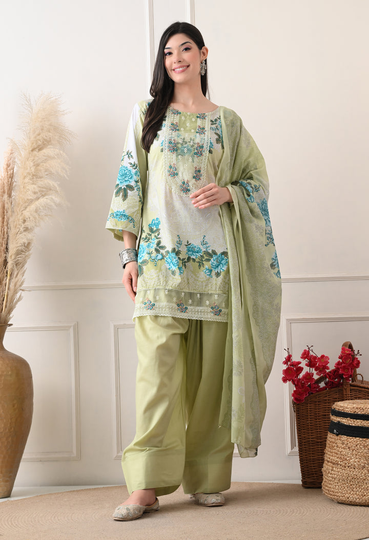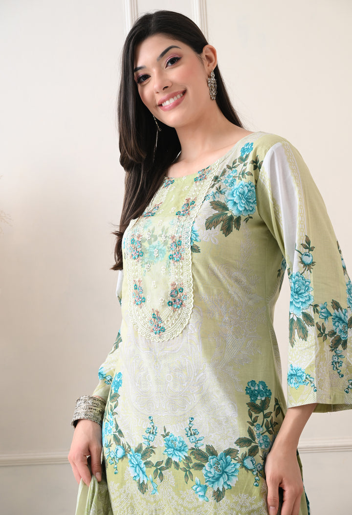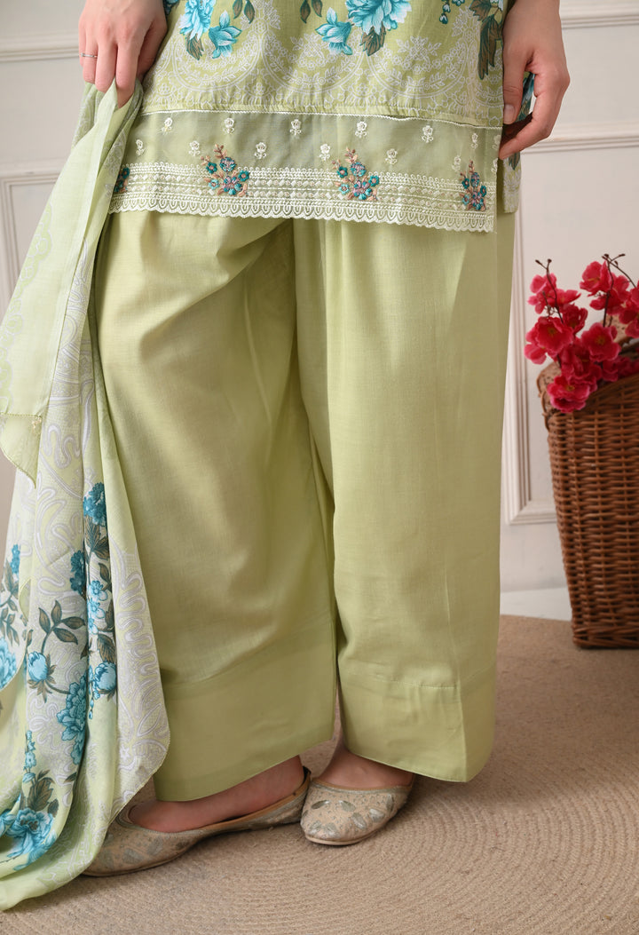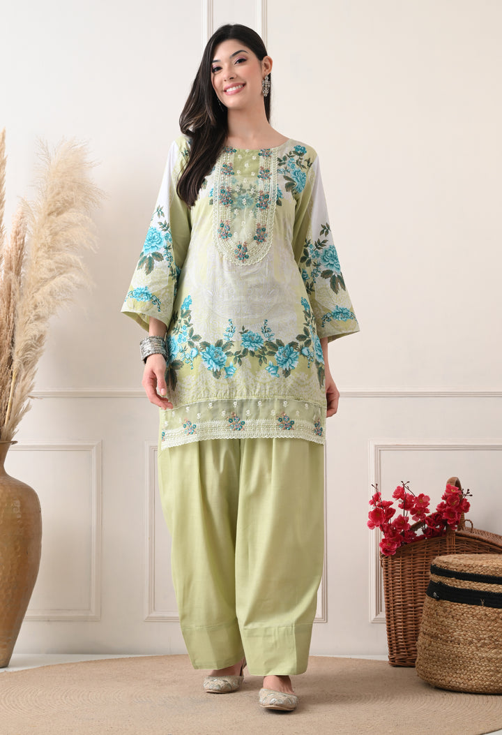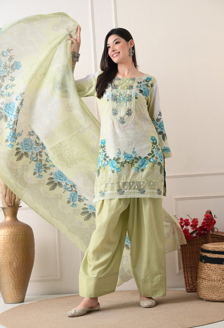 Pakistani Style Farshi suit with all over digital print and lacework on the shirt paired with farshi salwar and digital printed dupatta
