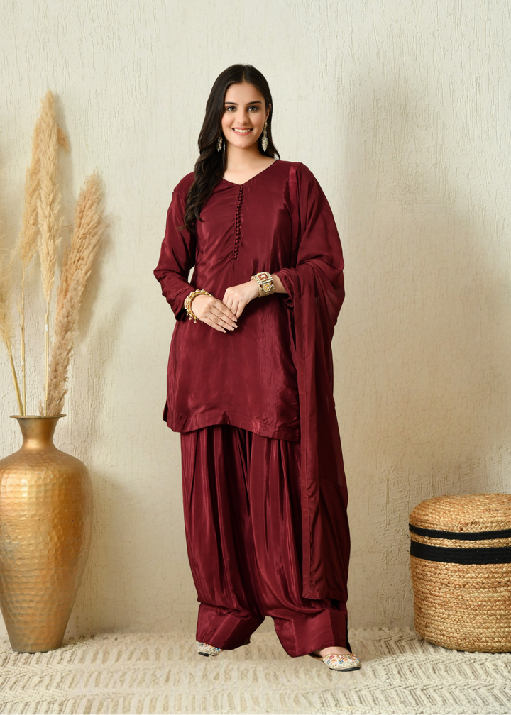 Suit with Polti buttons on the neckline paired with Farshi Salwar and beautiful dupatta