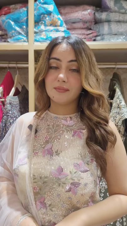 Suit with all over digital floral print, moti work and handwork on the shirt and Sharara with border on net dupatta