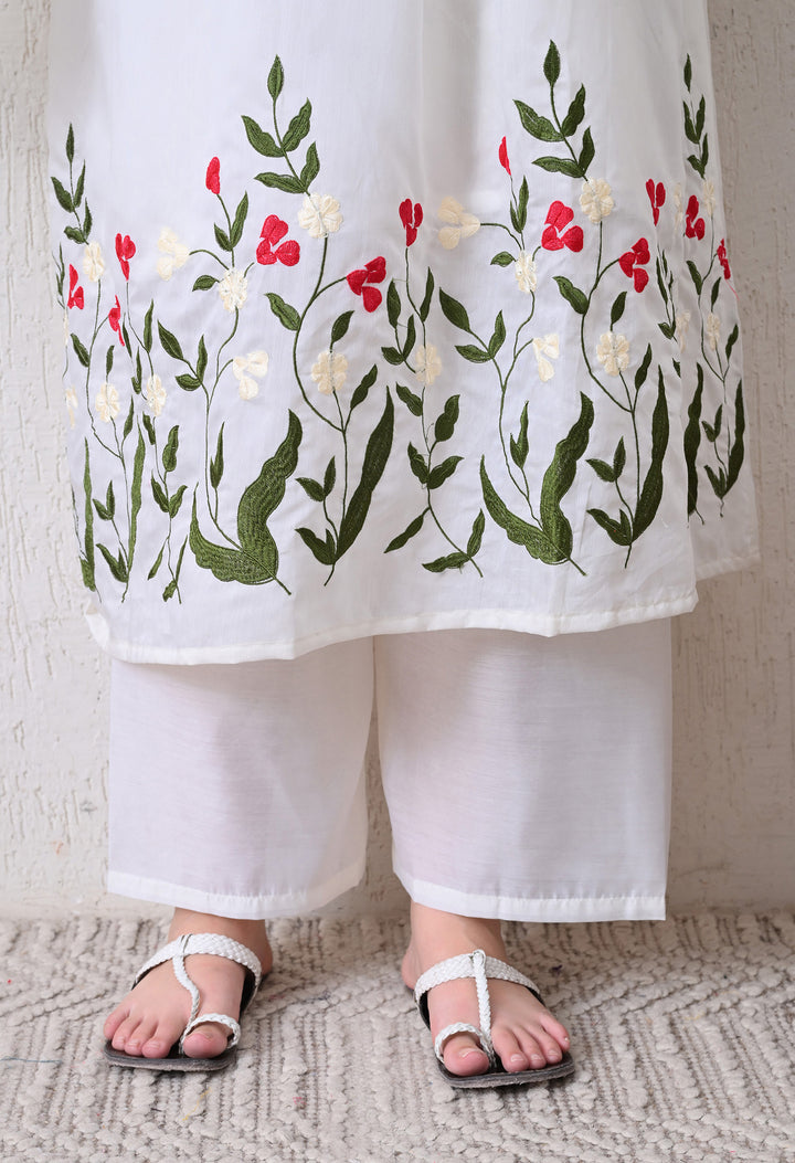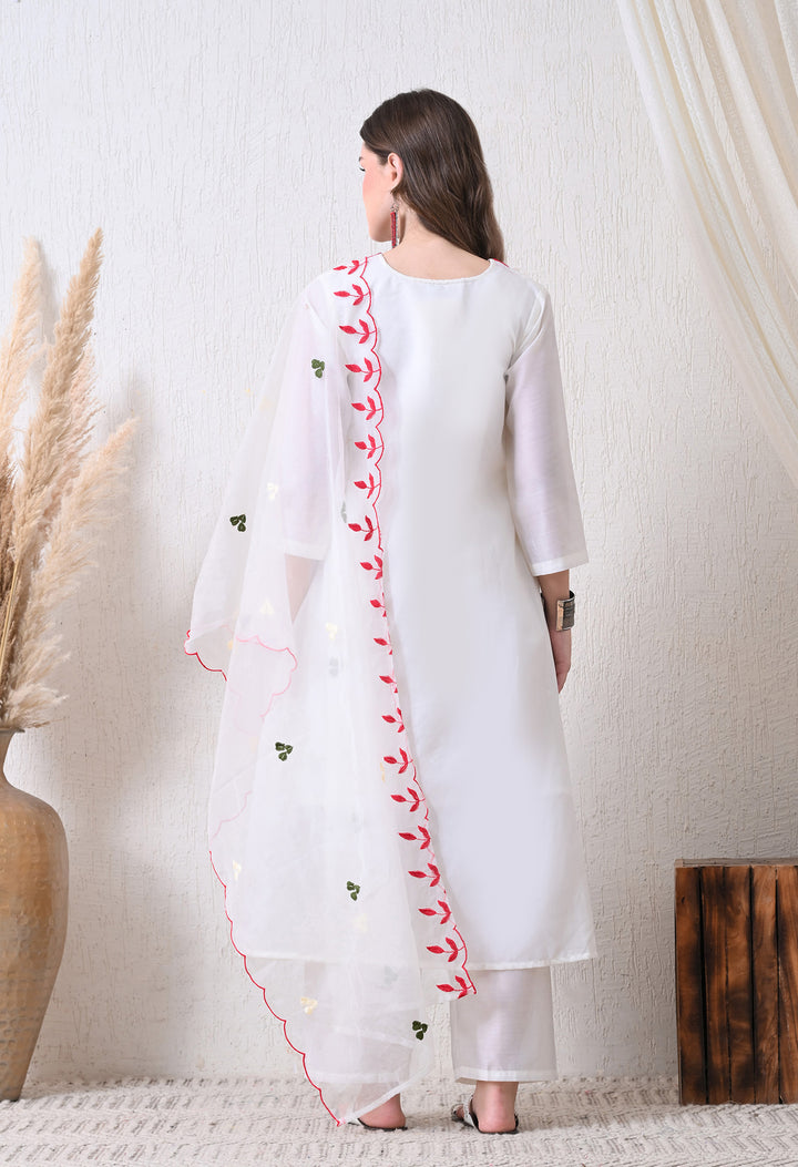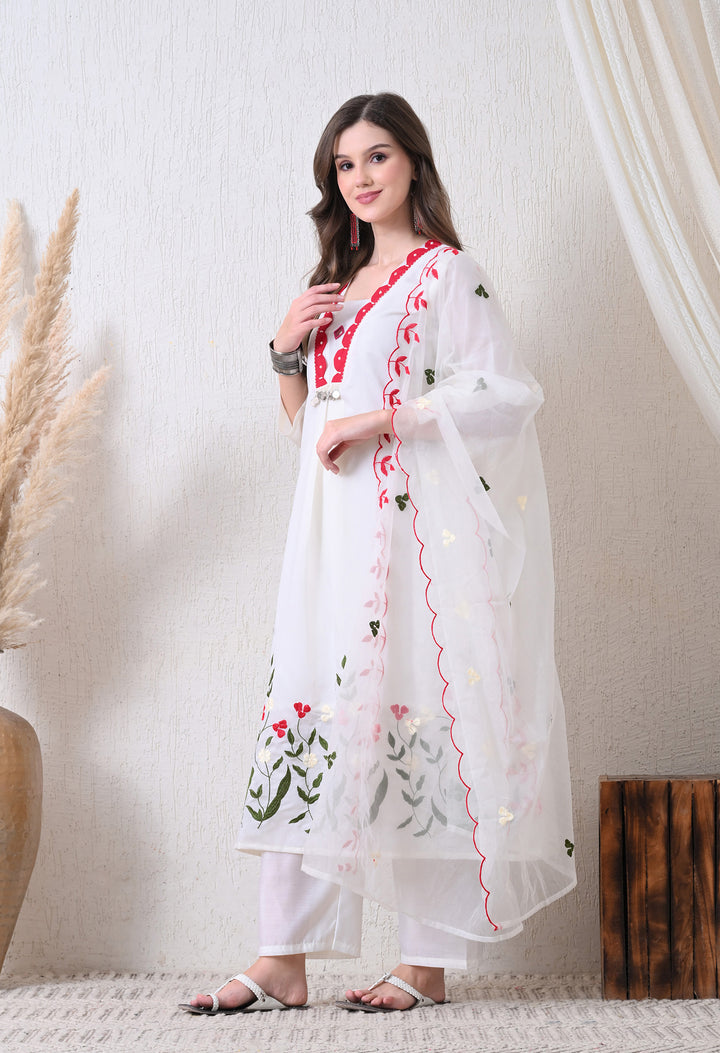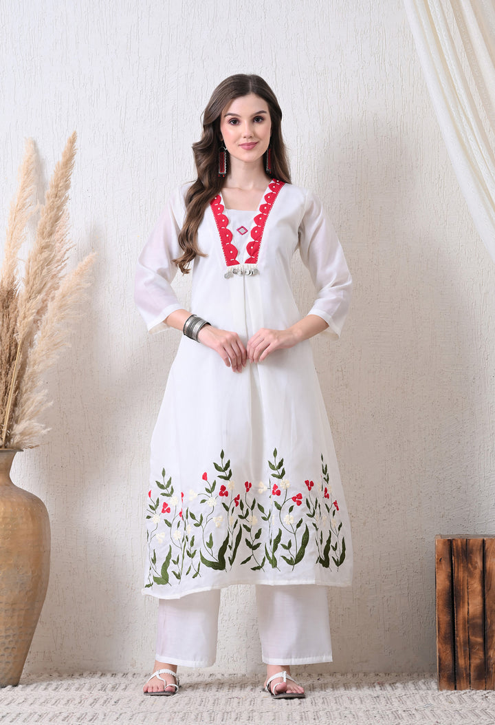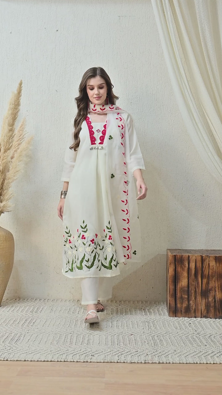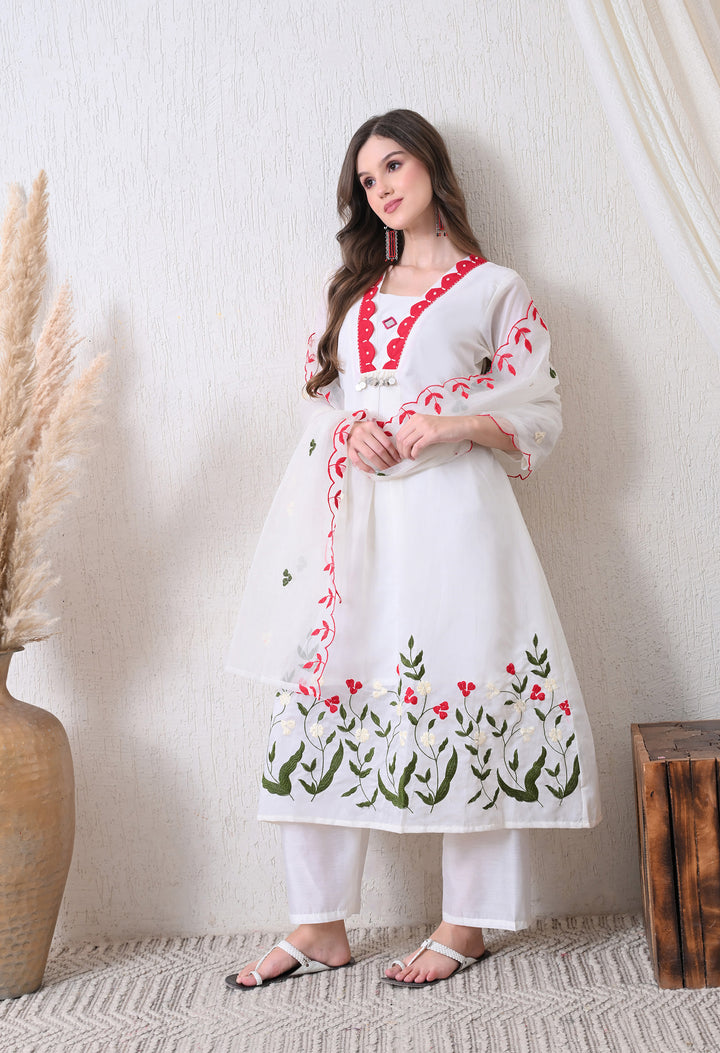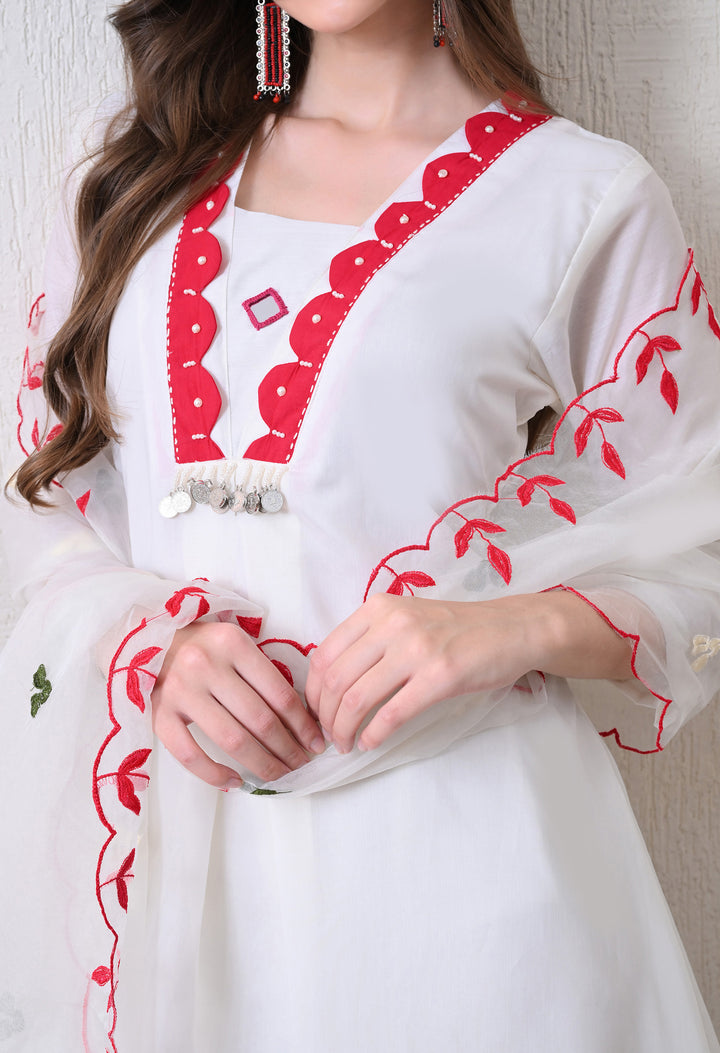 A beautiful A-line shirt with lace detailing on the neckline along with beautiful tassels with hand embroidered leaf and floral motif thread work done on the bottom of the shirt paired with pants. Along with beautiful dupatta with hand embroidered botties all over and cut work detailed hand embroidered thread work borders all over it .