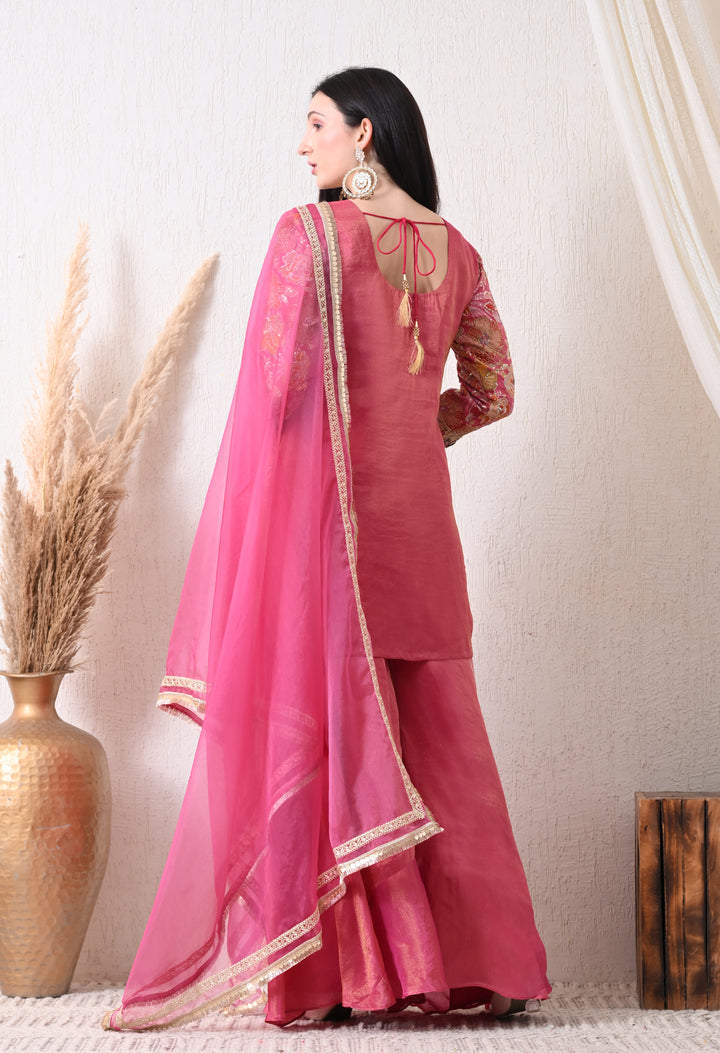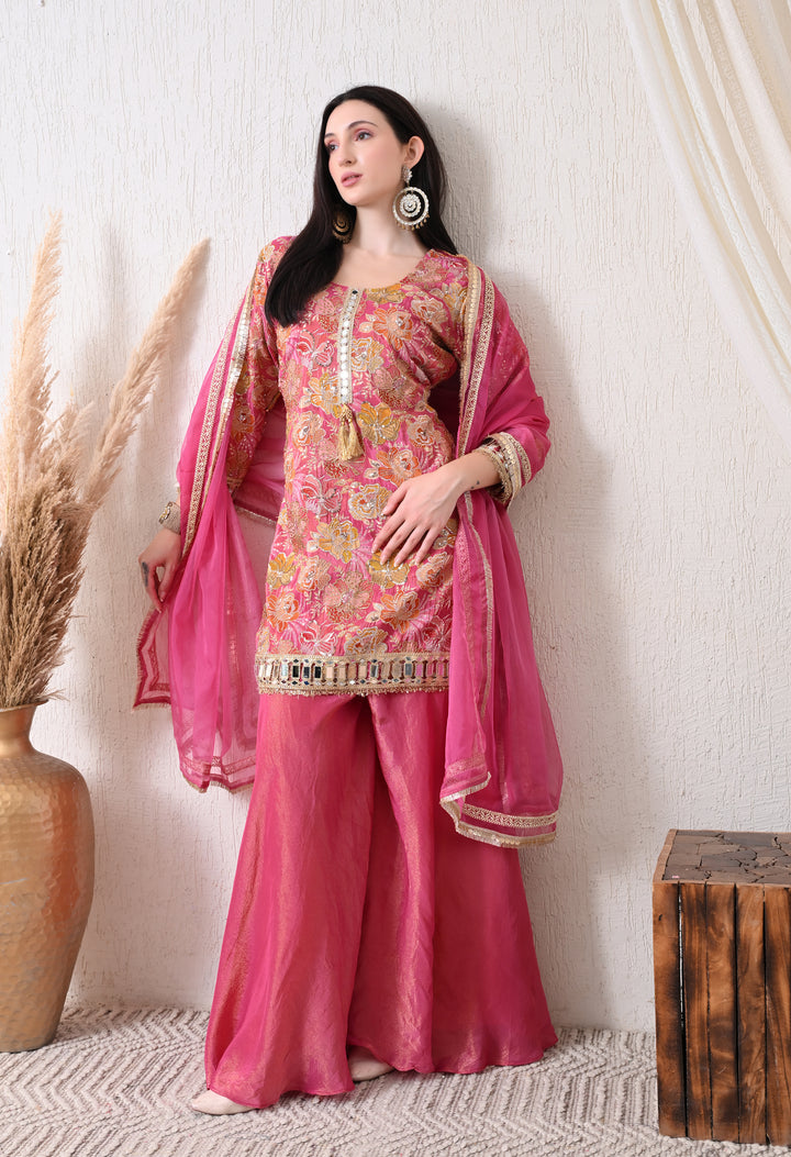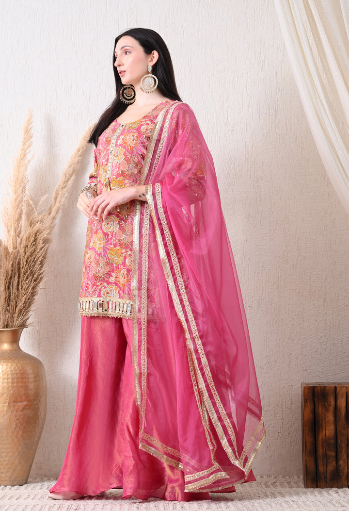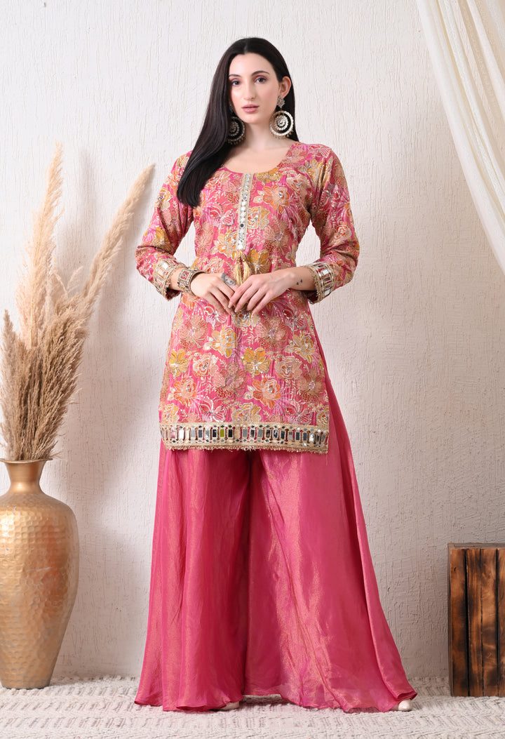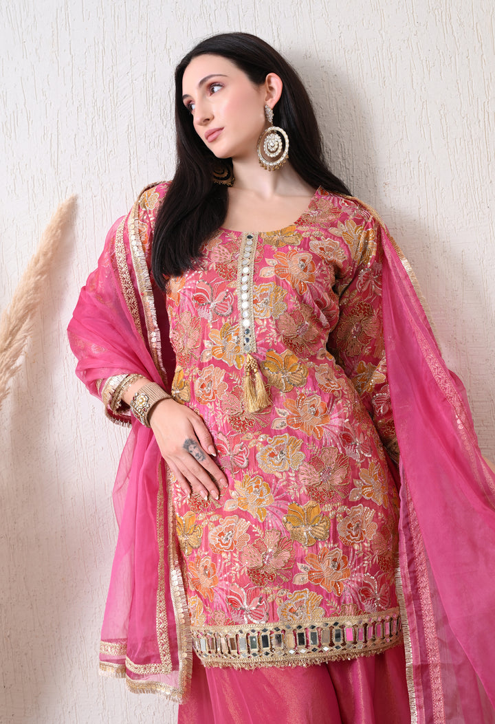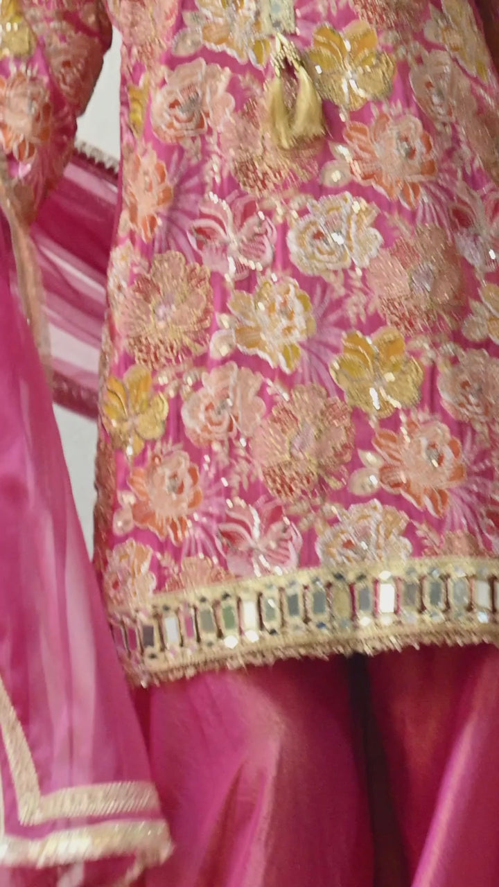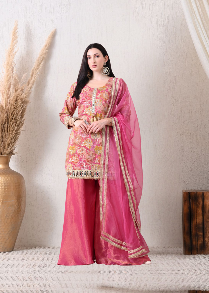 Description: Beautiful shirt with hand embroidered floral motifs with Moti work and thread work all over it with mirror detailing on the neckline ,sleeves and bottom of the shirt along with Sharara . Paired with dupatta with Kiran and border all over it .