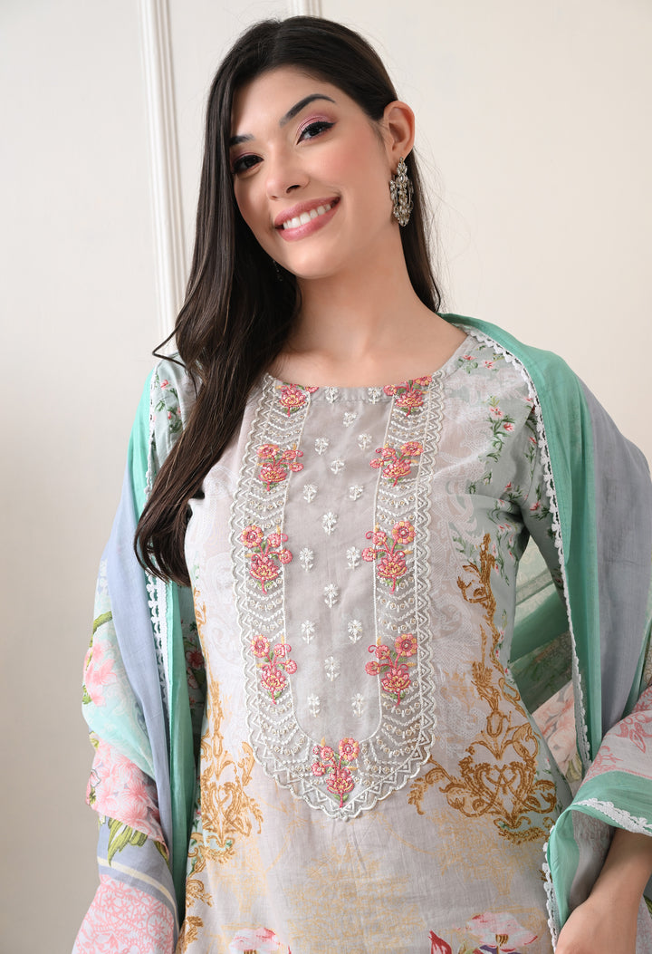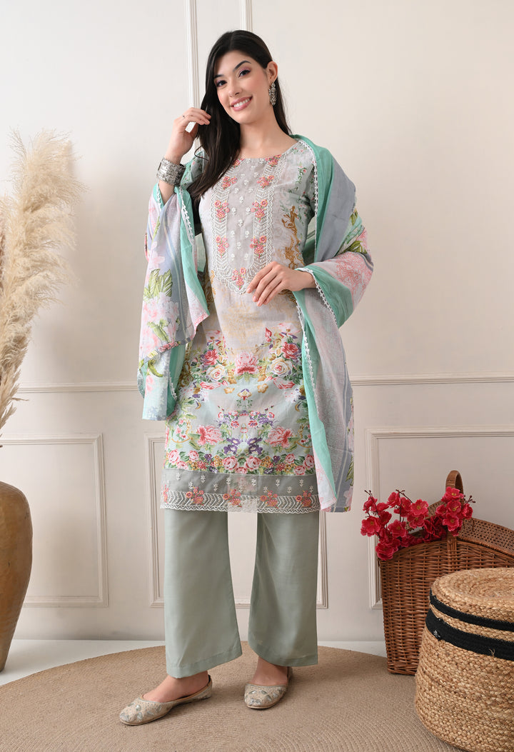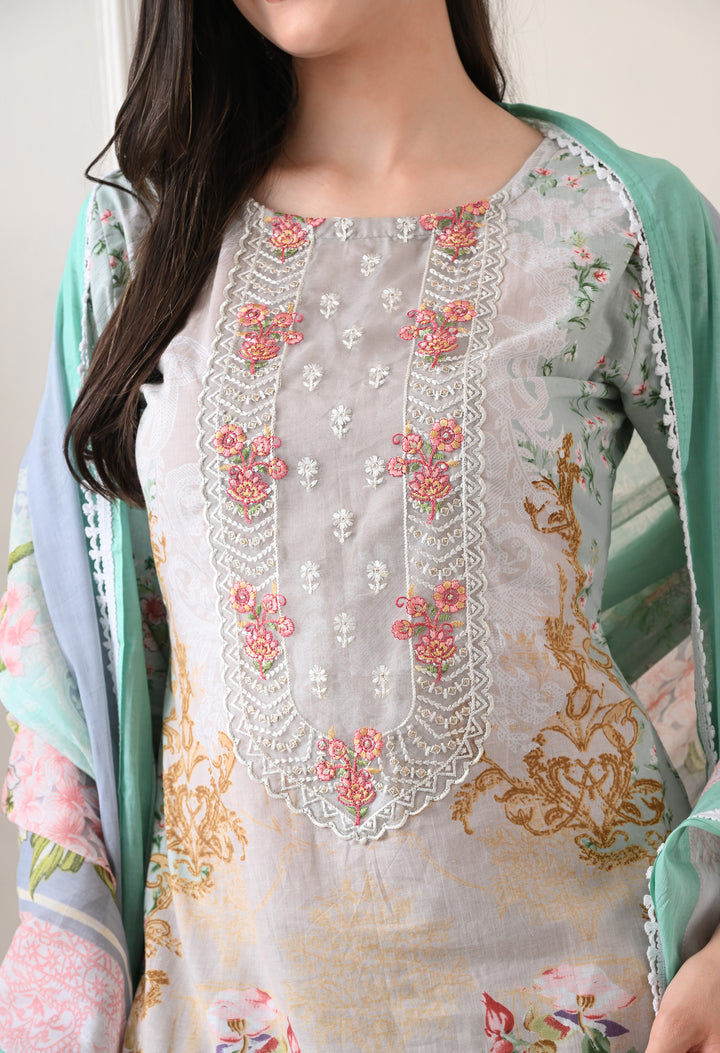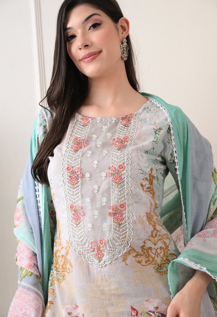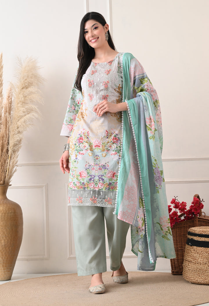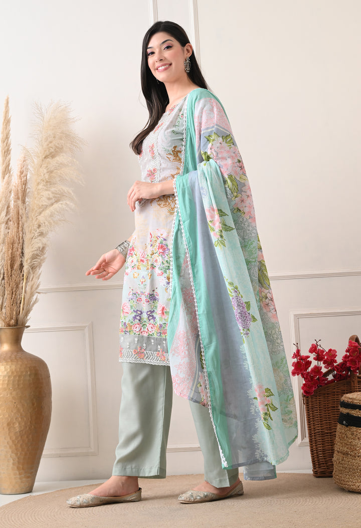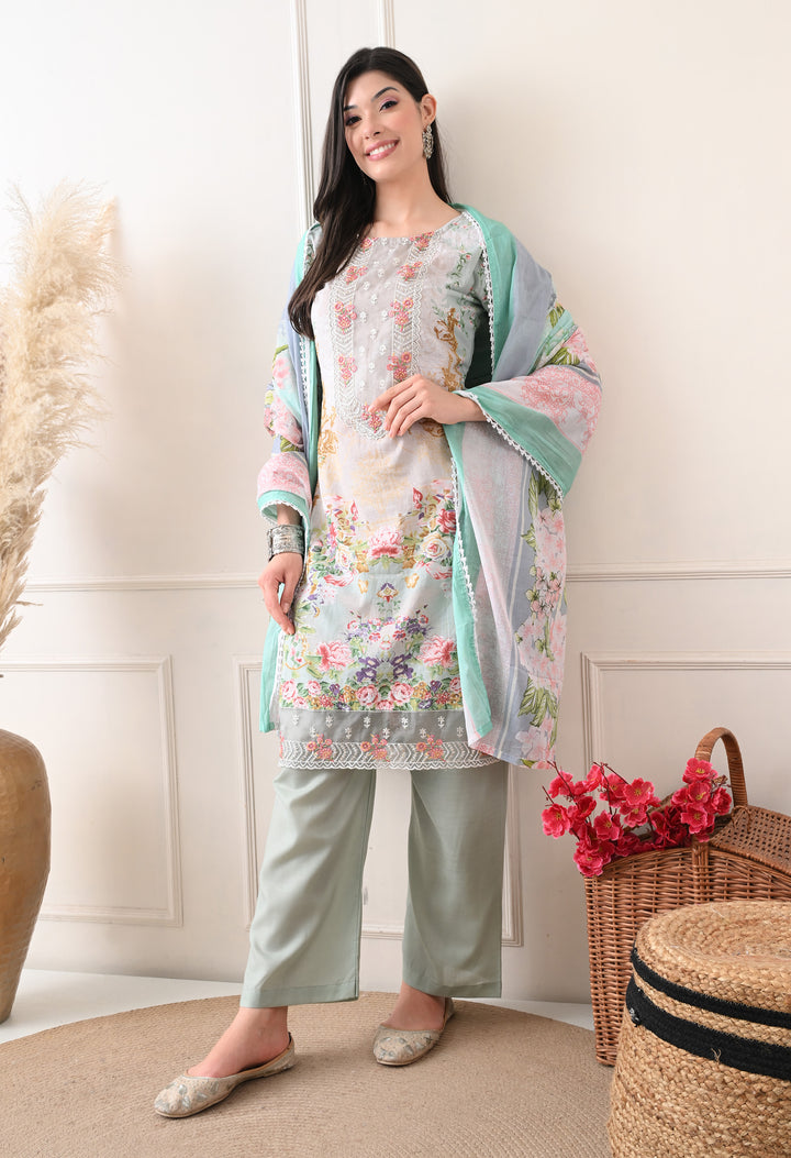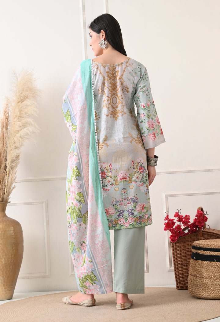 Pakistani Style suit with all over digital print and lacework on the shirt paired with trouser and digital printed dupatta