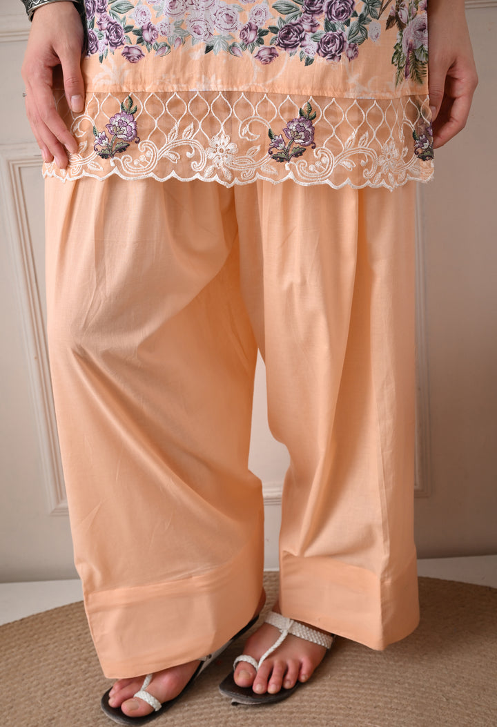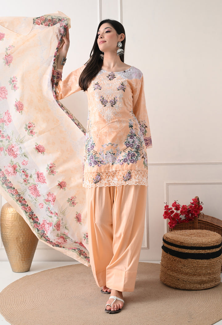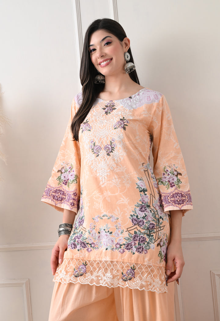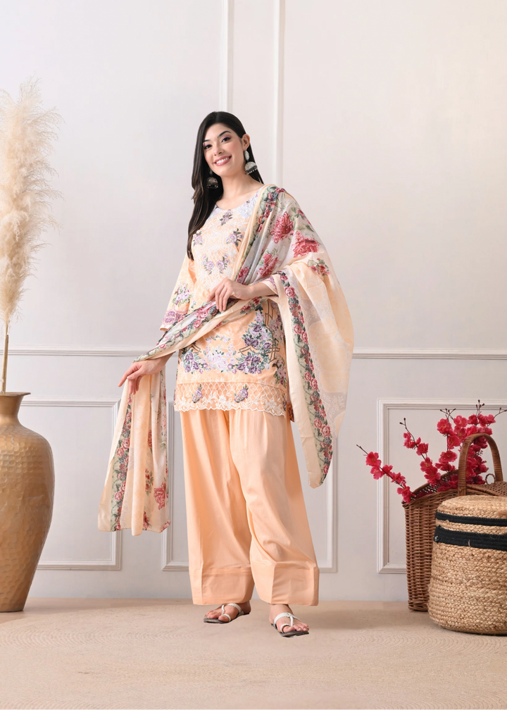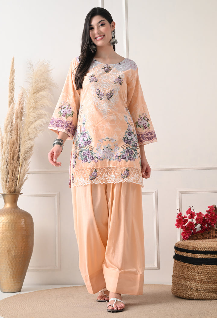 Pakistani Style Farshi suit with all over digital print and lacework on the shirt paired with farshi salwar and digital printed dupatta