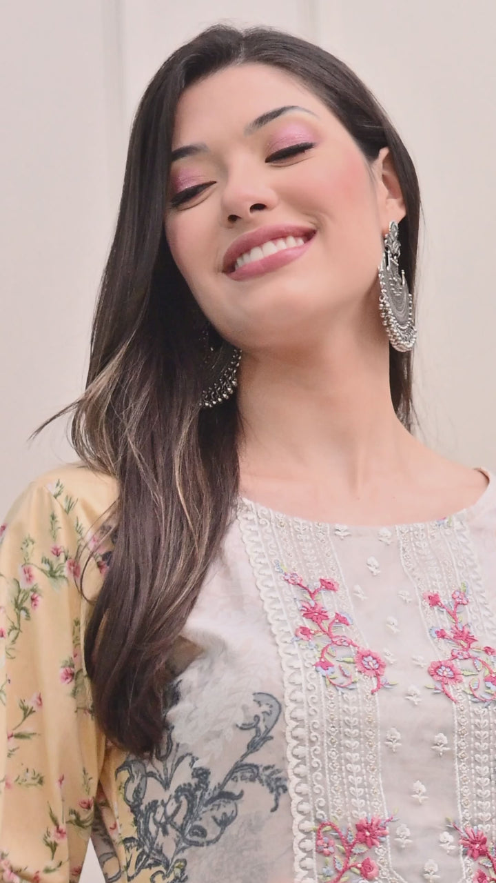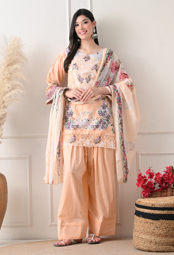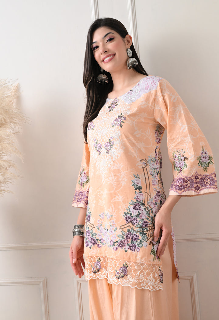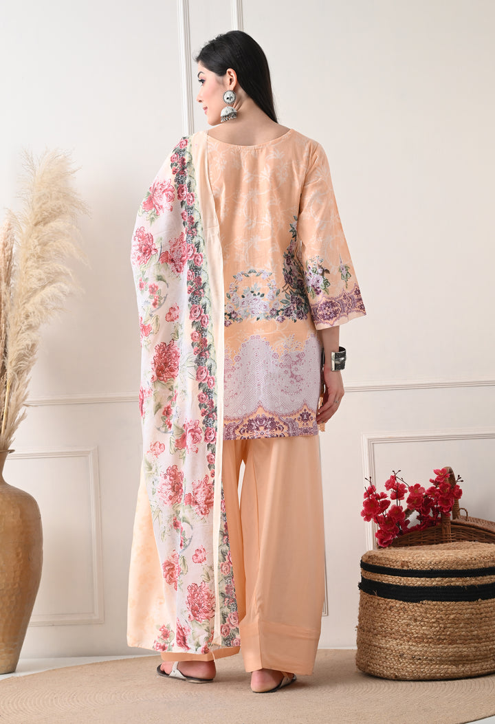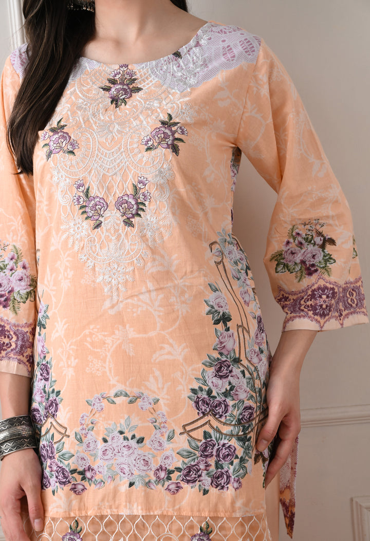 Pakistani Style Farshi suit with all over digital print and lacework on the shirt paired with farshi salwar and digital printed dupatta