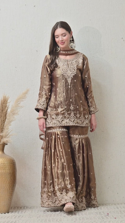 Description:Beautiful shirt with hand embroidered zari and zardozi work Moti work and mirror all over the shirt with contact rust color sharara with beautiful heavy embroidery all over it . Along with contrast dupatta with border and tassels all over .
