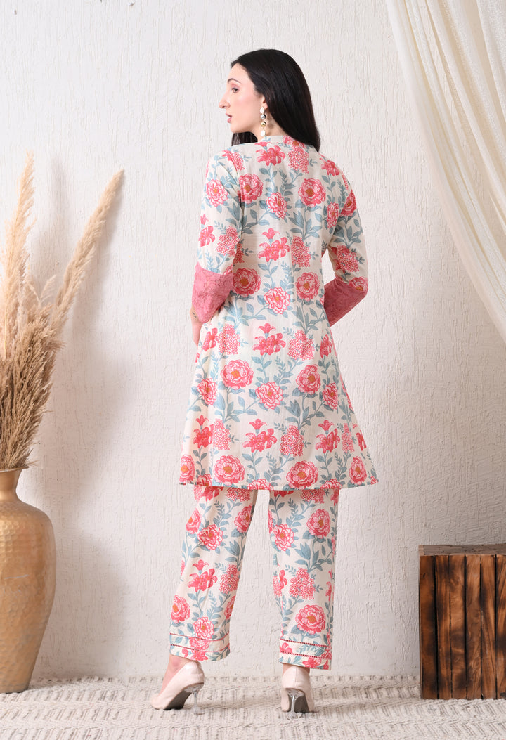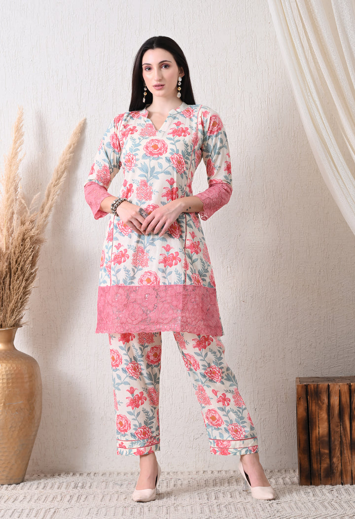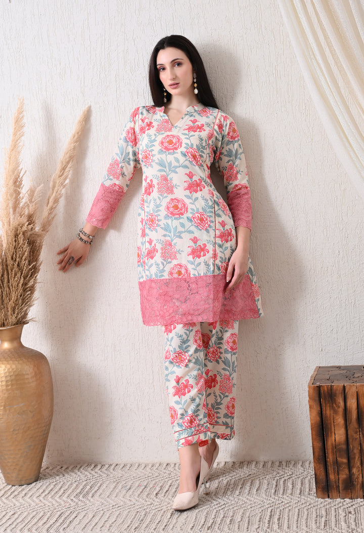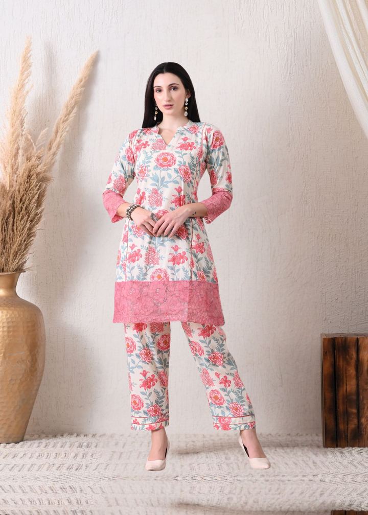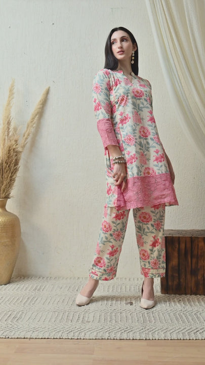 Description:Digitally printed co ord set with floral motifs all over the shirt and pants with beautiful lace work on the bottom of shirt and sleeves
