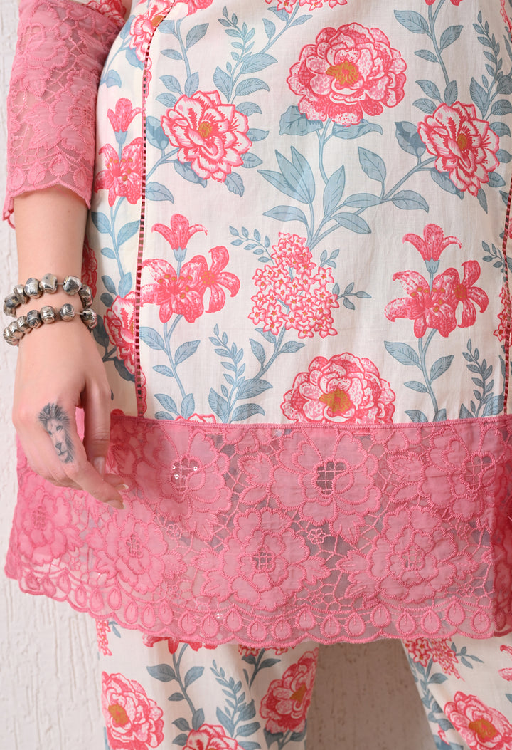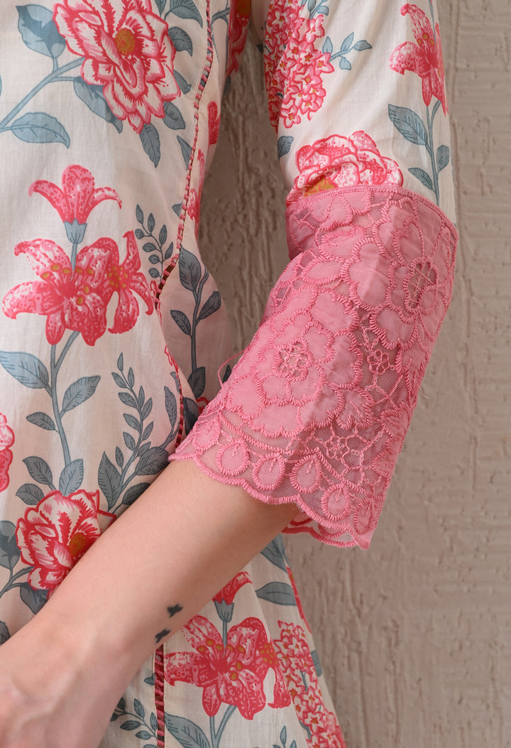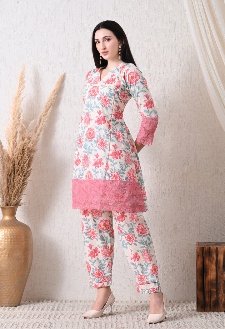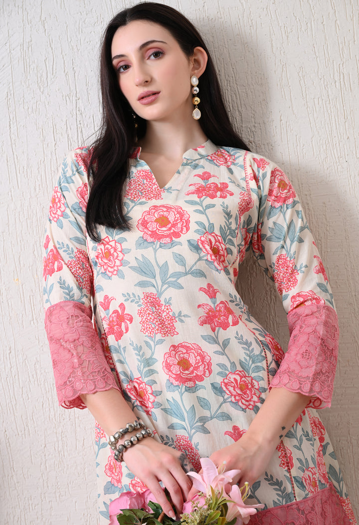 Description:Digitally printed co ord set with floral motifs all over the shirt and pants with beautiful lace work on the bottom of shirt and sleeves