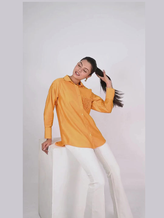This relaxed-fit shirt in a zesty orange shade. The crinkled patch pocket gives it a fun twist