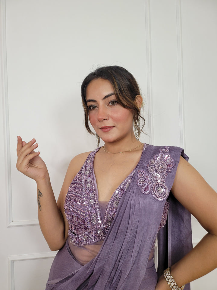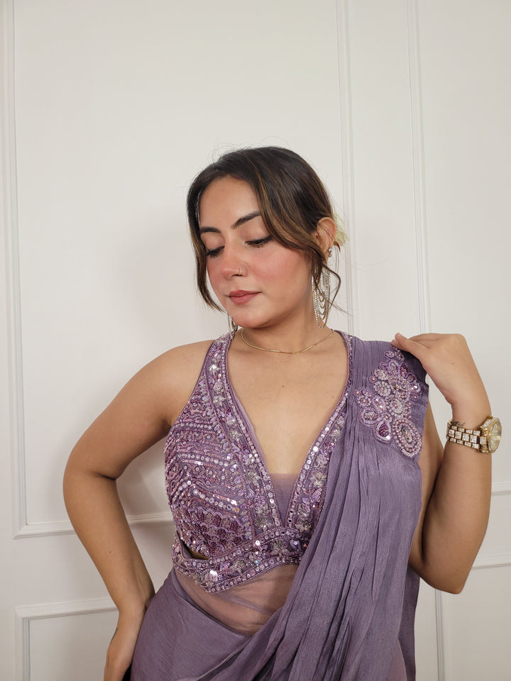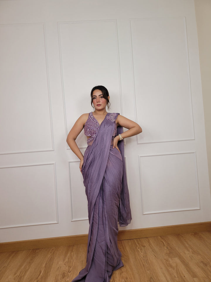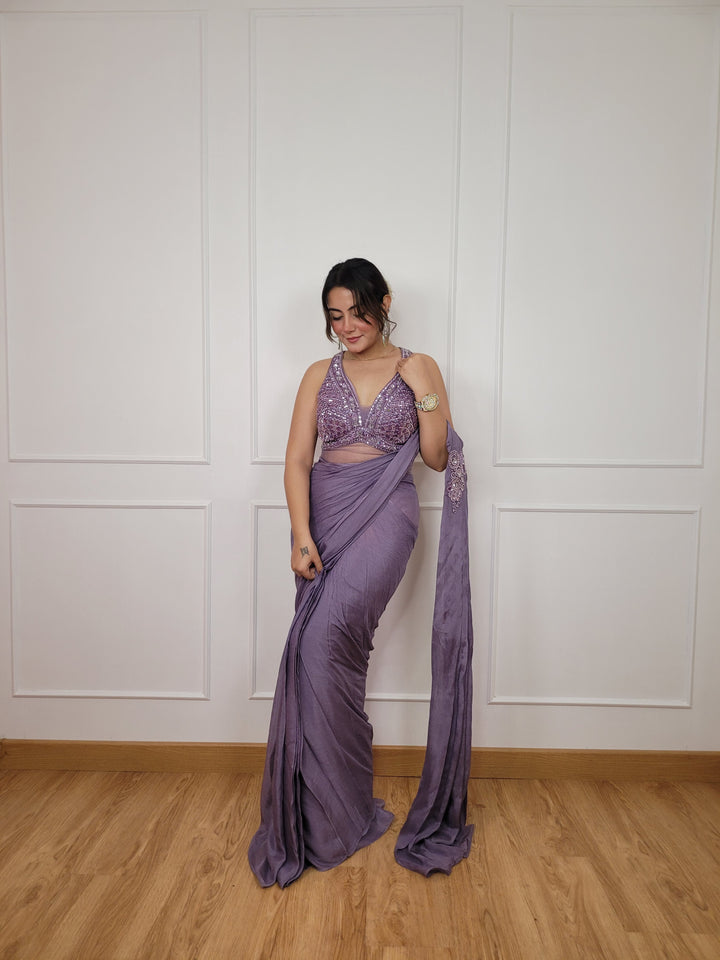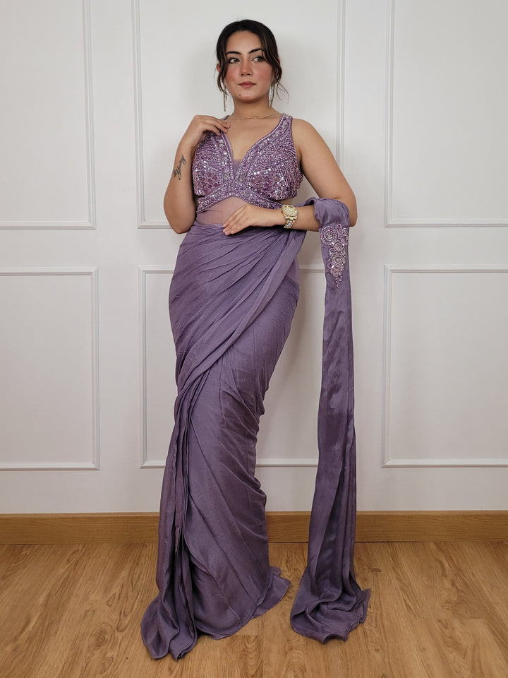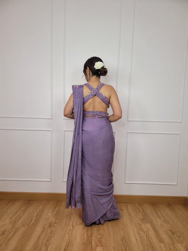 Pre-Draped saree with adjustable hooks in sarees ,blouse with handwork pearl work , Moti work , sippi work .Its a body suit cum drape saree and on saree at pally there is a handwork patch