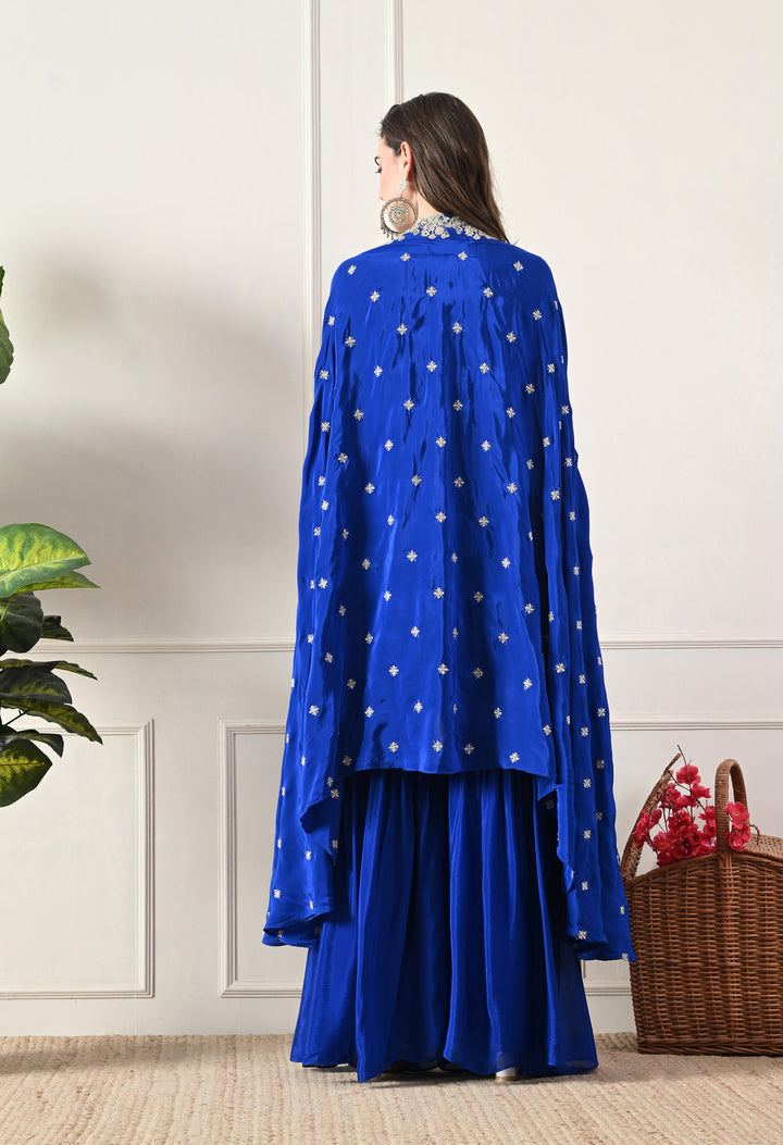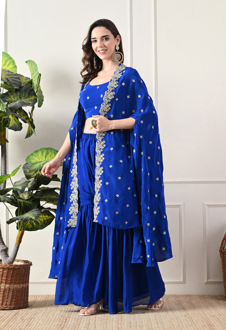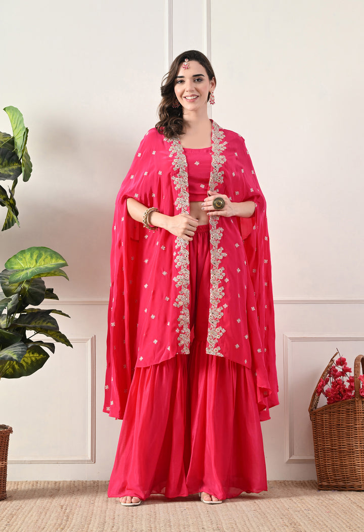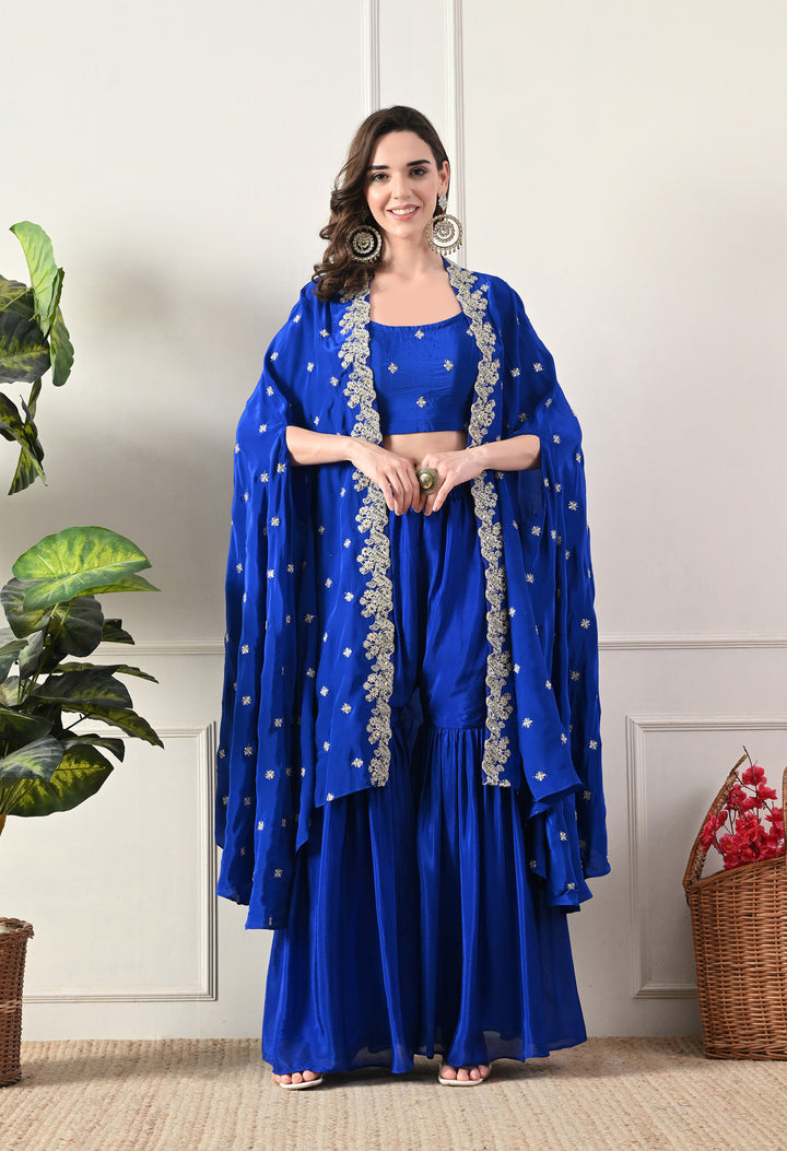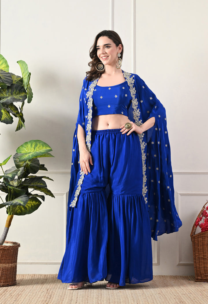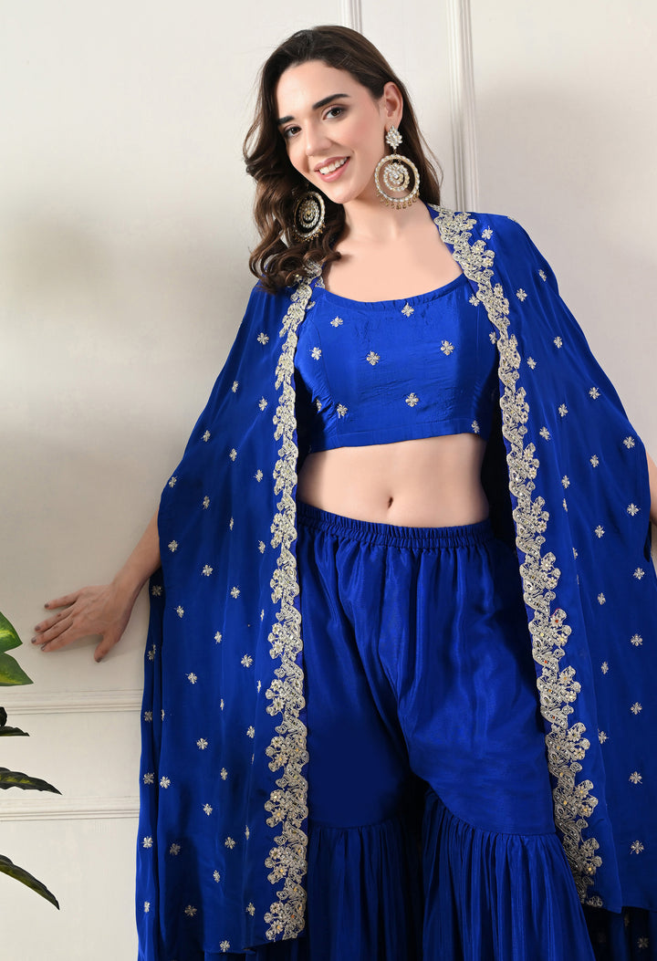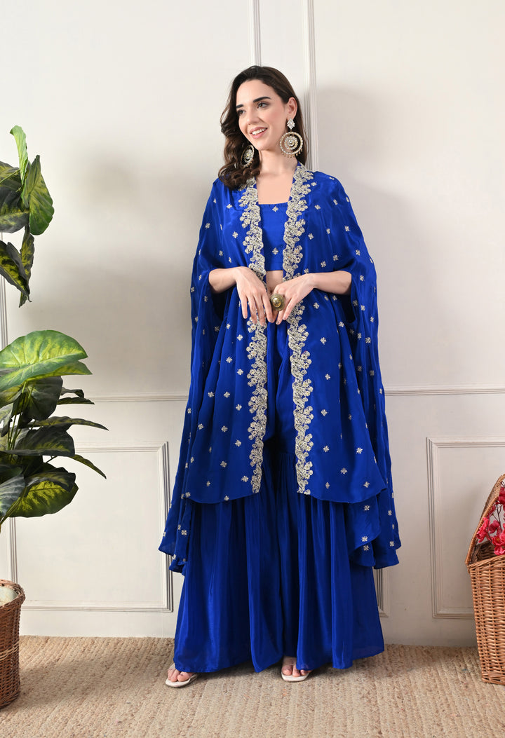 Description:3 Piece indo western set with beautiful hand embroidered cape with booties all over the cape and blouse along with Flowy gharara .