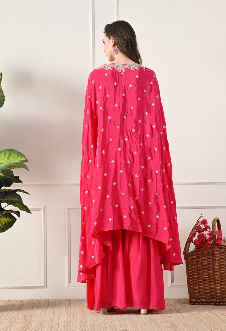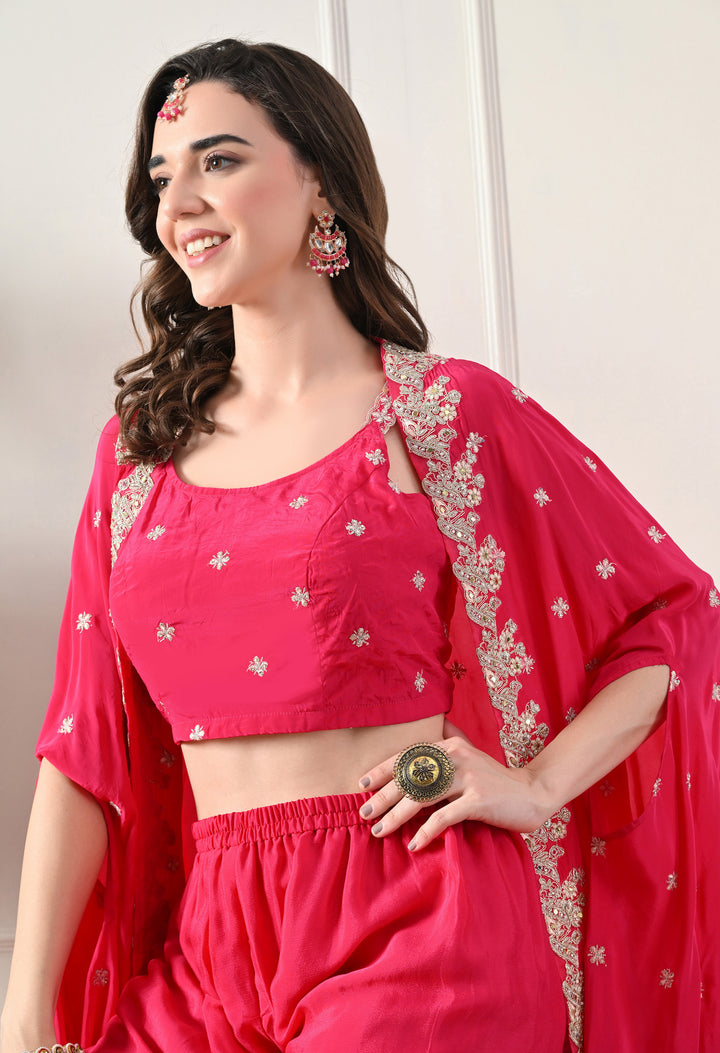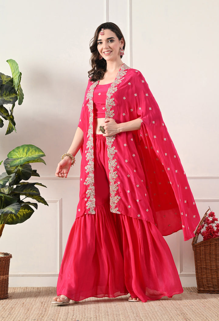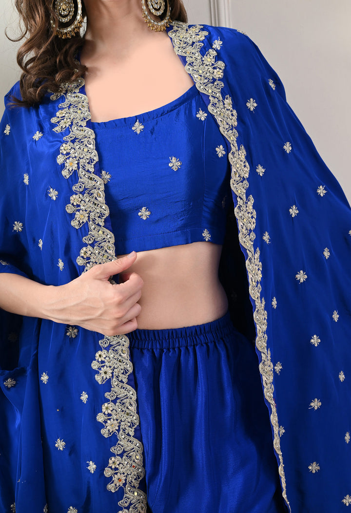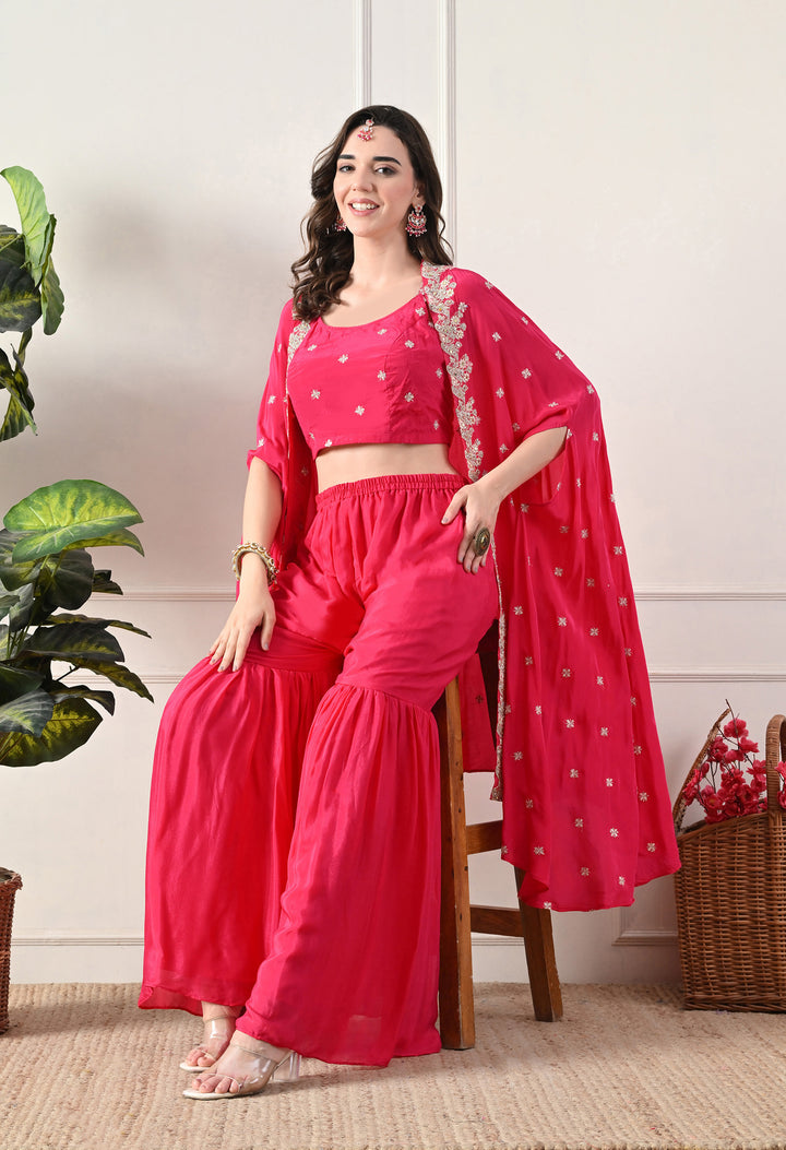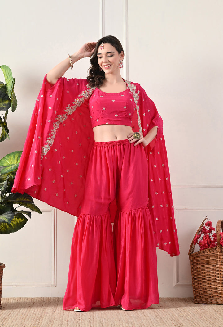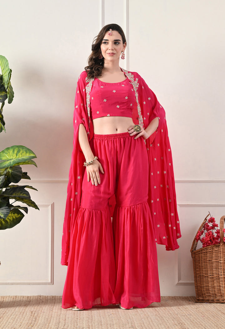 Description:3 Piece indo western set with beautiful hand embroidered cape with booties all over the cape and blouse along with Flowy gharara .