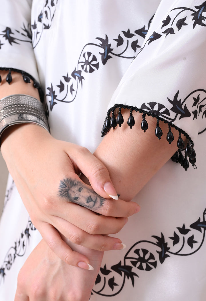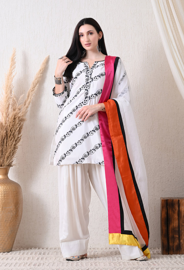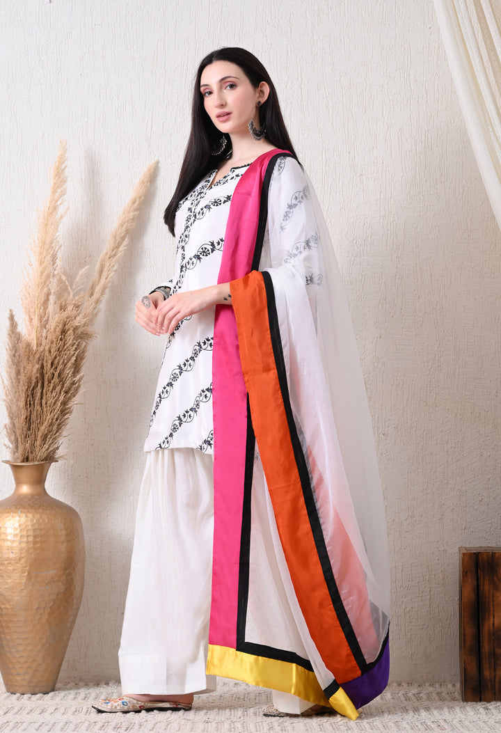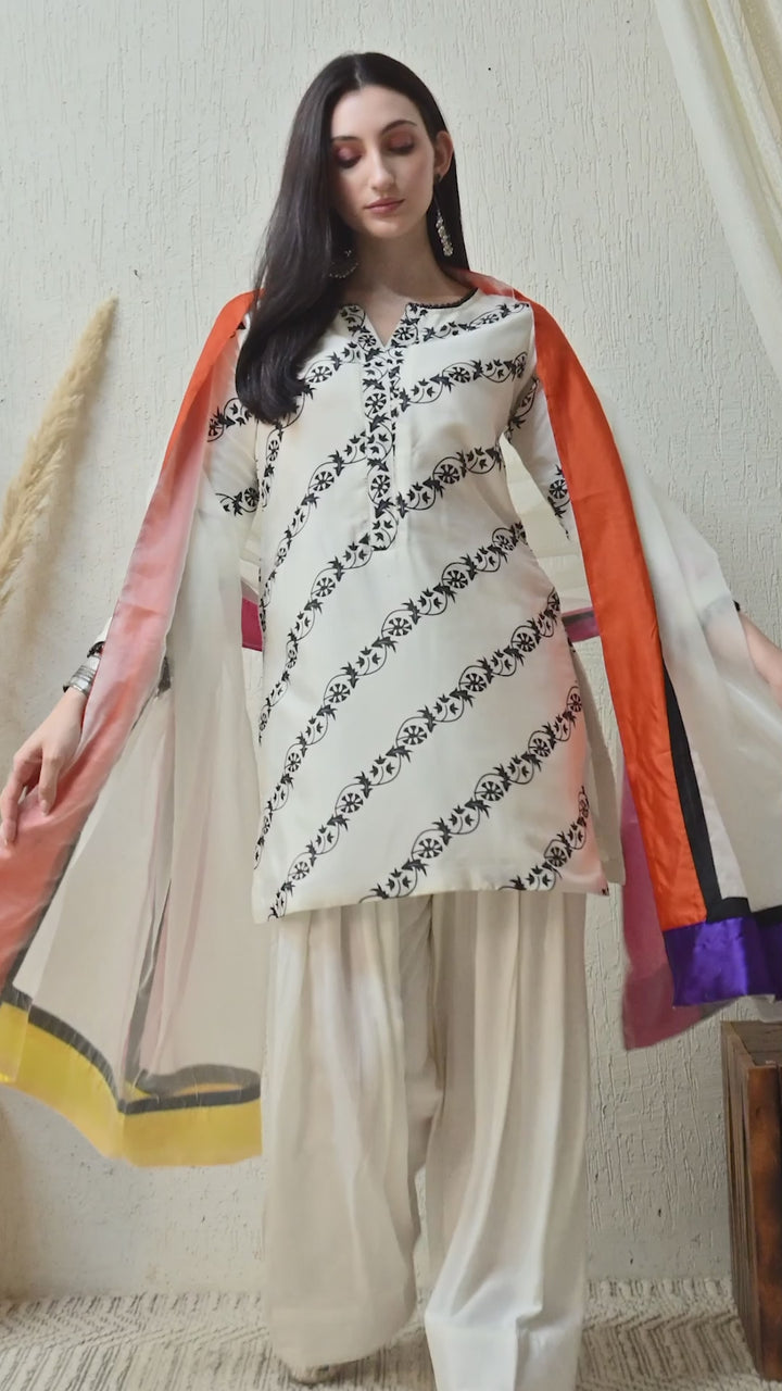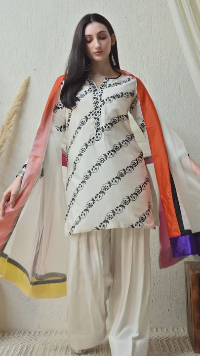 Description: Beautiful shirt with digital printing all over it with lace detailing on the neckline and beautiful tassels on the sleeves along with Farshi salwaar. Paired with dupatta with Mukti coloured border all over it.