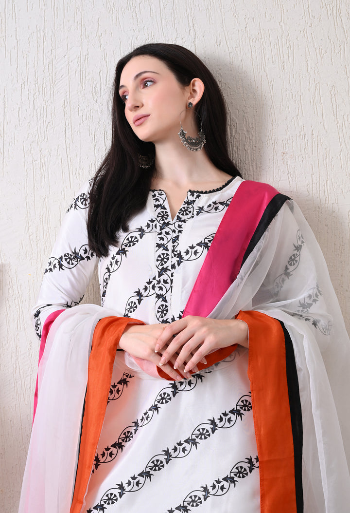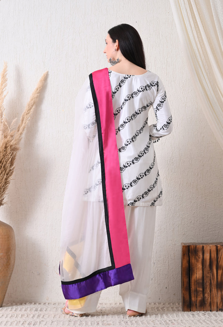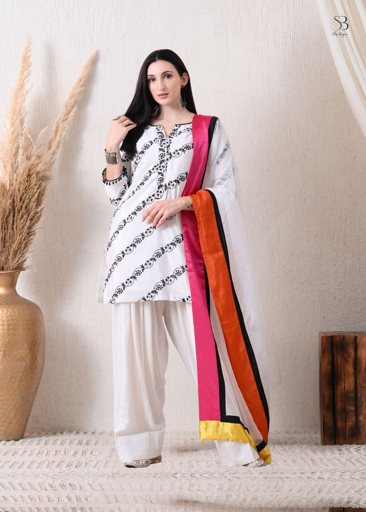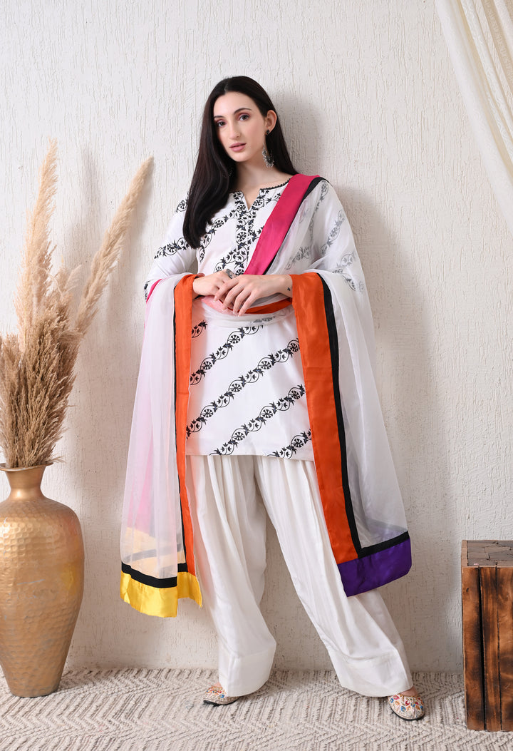 Description: Beautiful shirt with digital printing all over it with lace detailing on the neckline and beautiful tassels on the sleeves along with Farshi salwaar. Paired with dupatta with Mukti coloured border all over it.