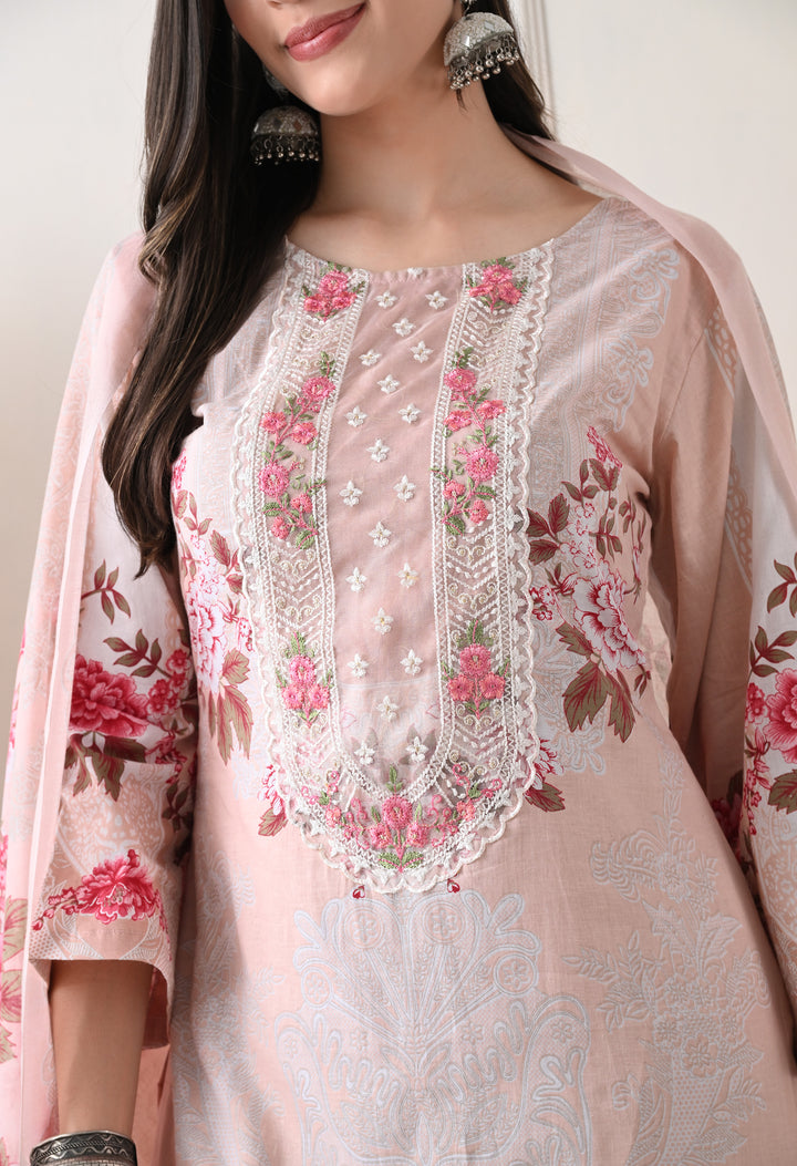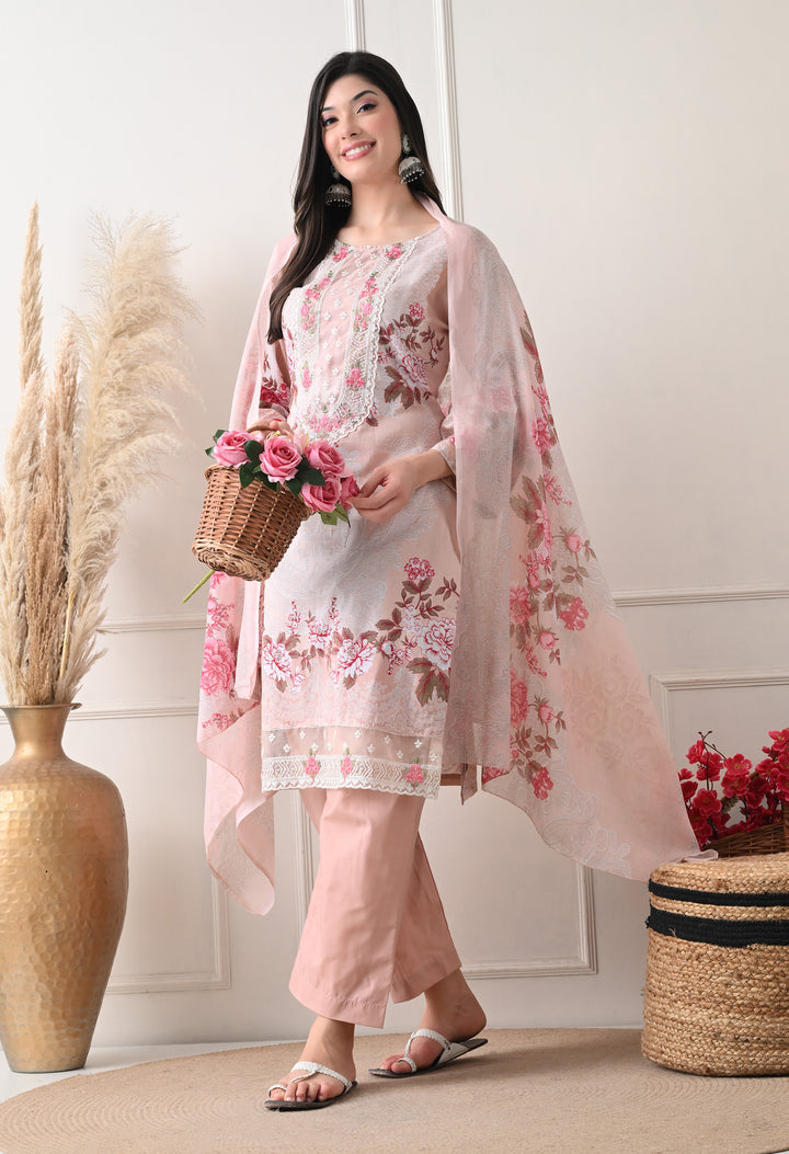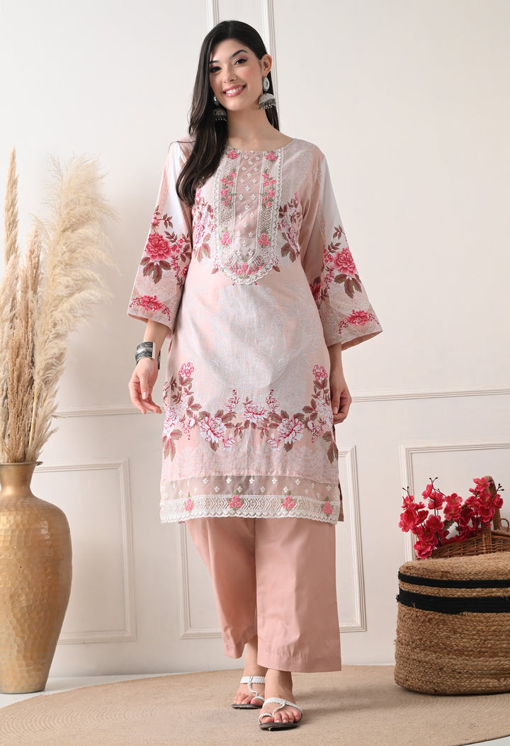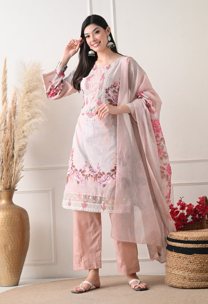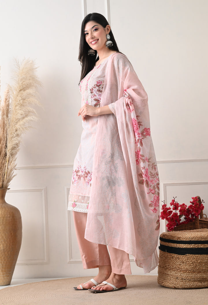 Pakistani Style suit with all over digital print and lacework on the shirt paired with trouser and digital printed dupatta