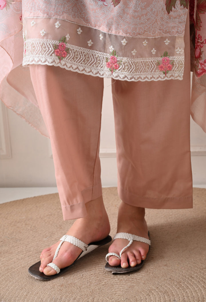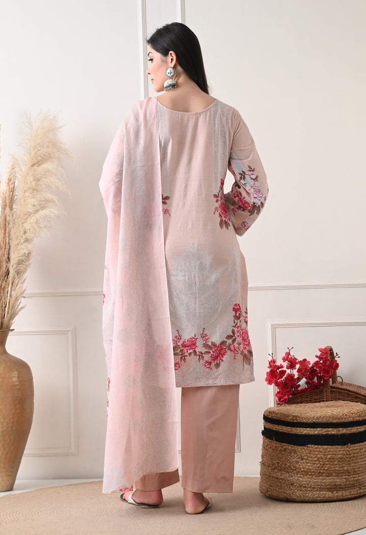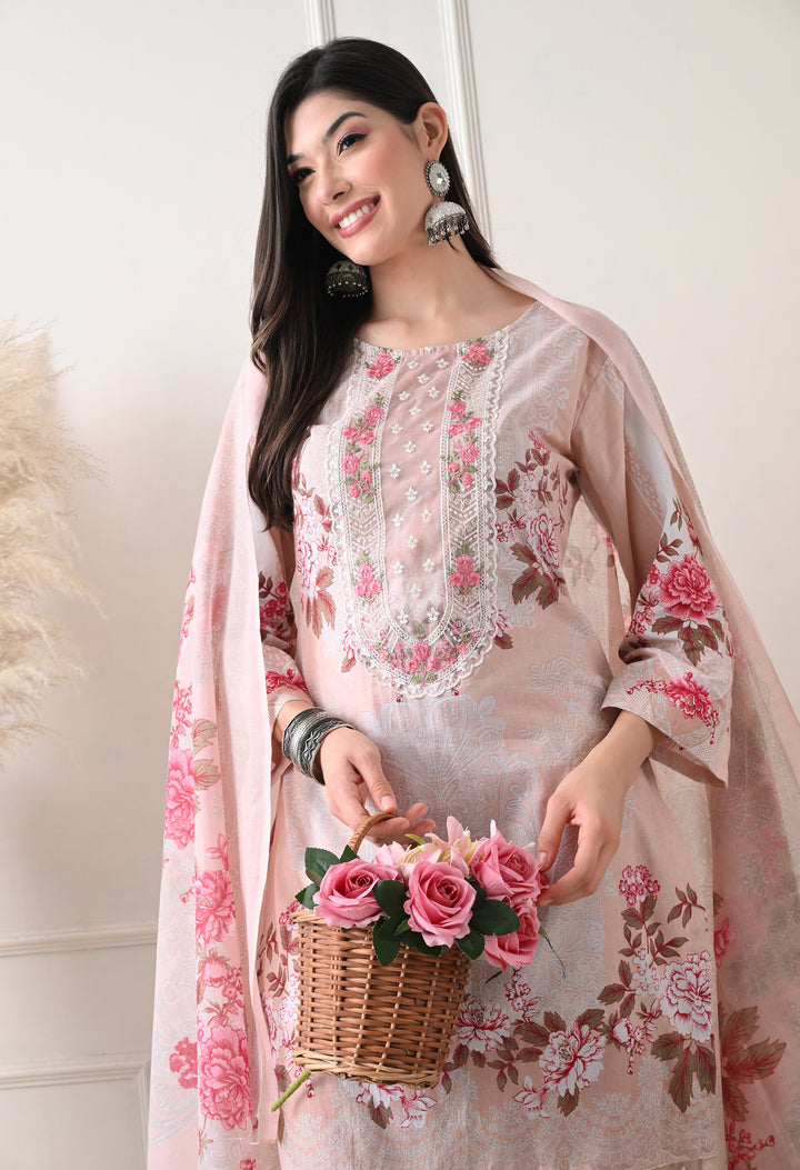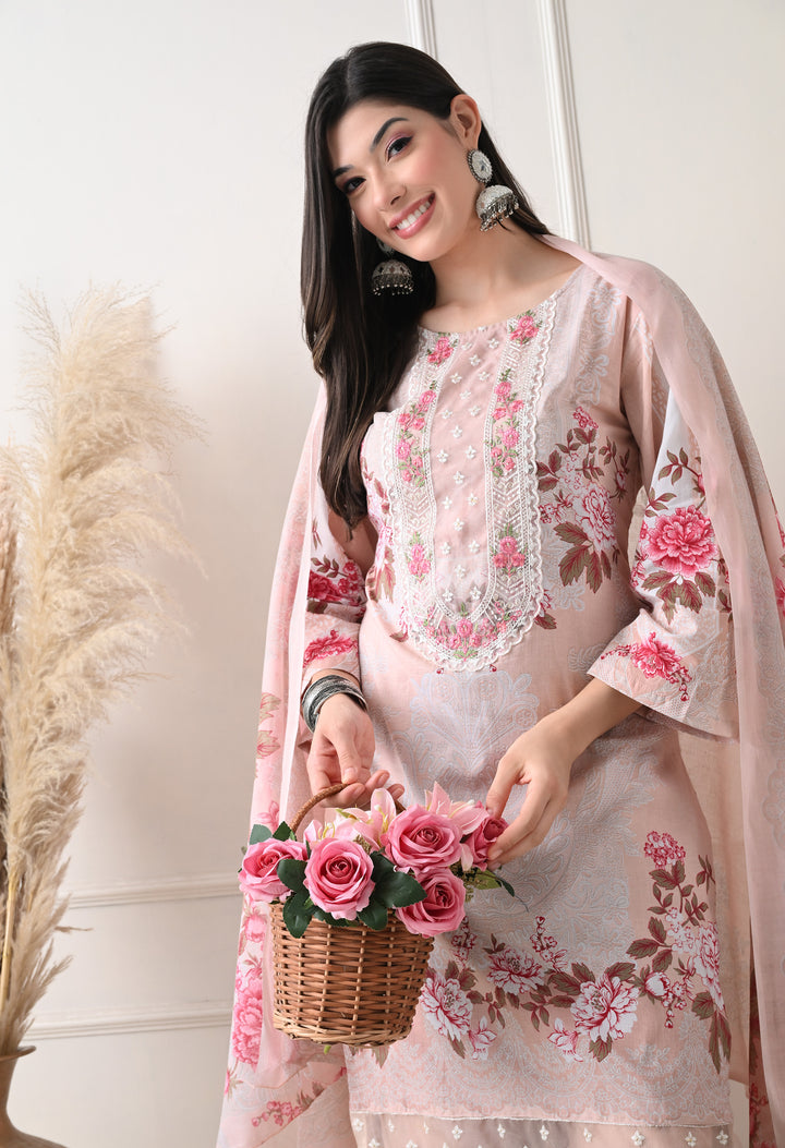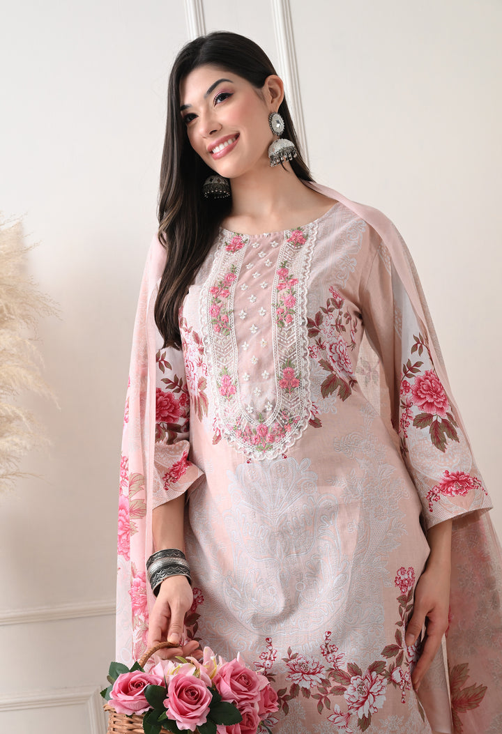 Pakistani Style suit with all over digital print and lacework on the shirt paired with trouser and digital printed dupatta