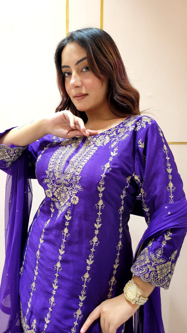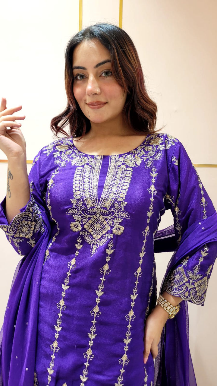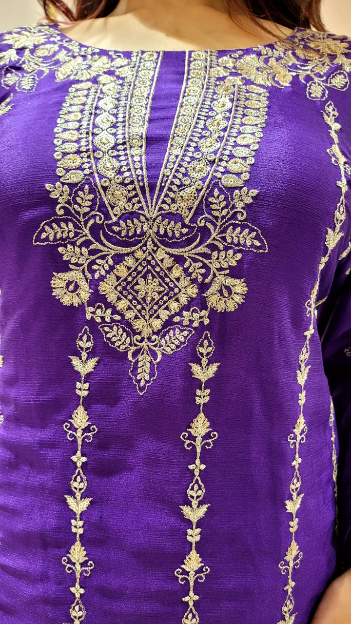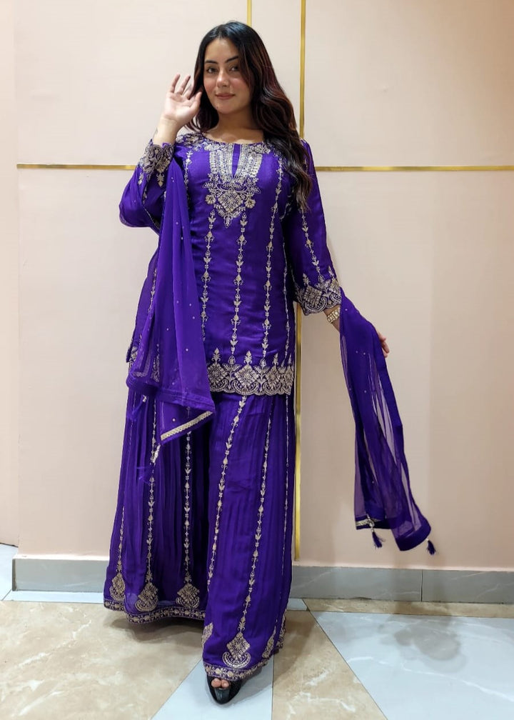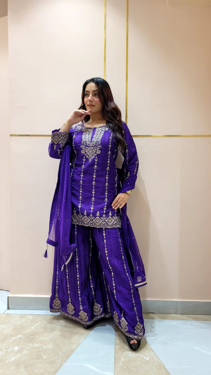 Sharara suit with all over weaving, moti work and handwork on the Shirt and Sharara with tassels and moti work on dupatta