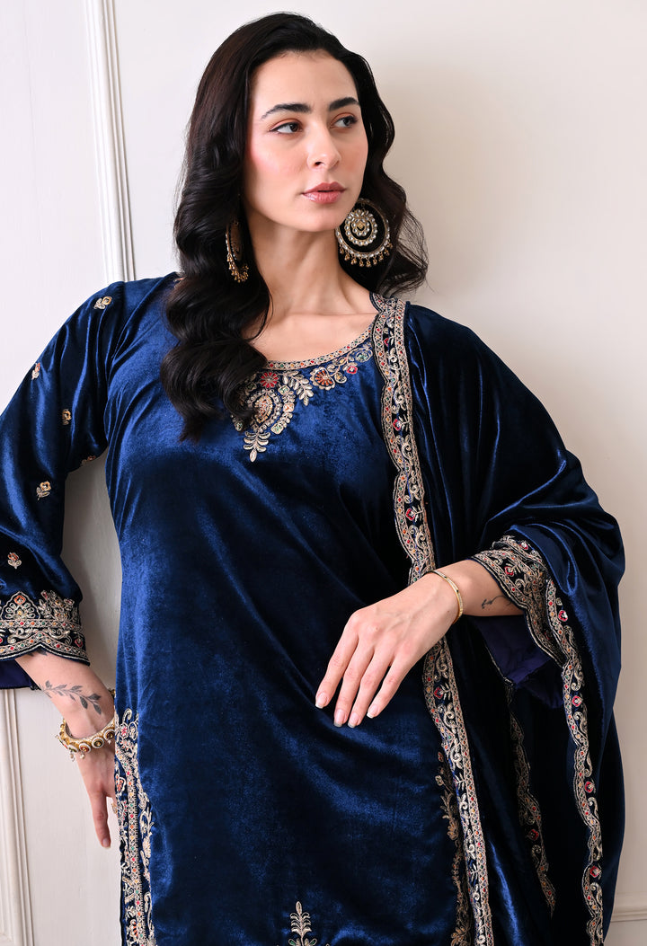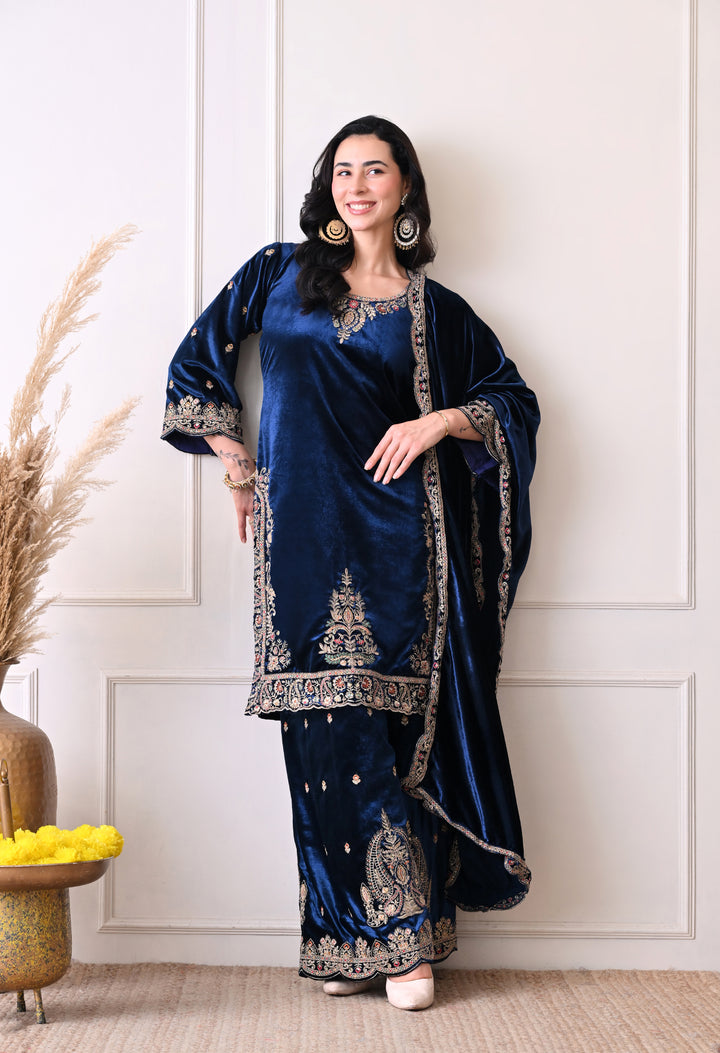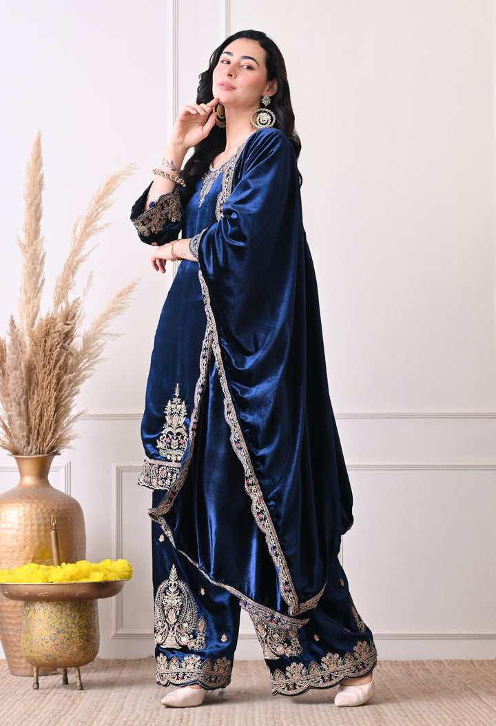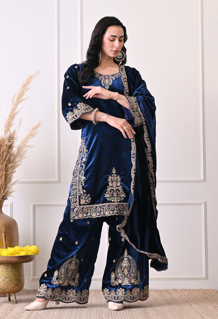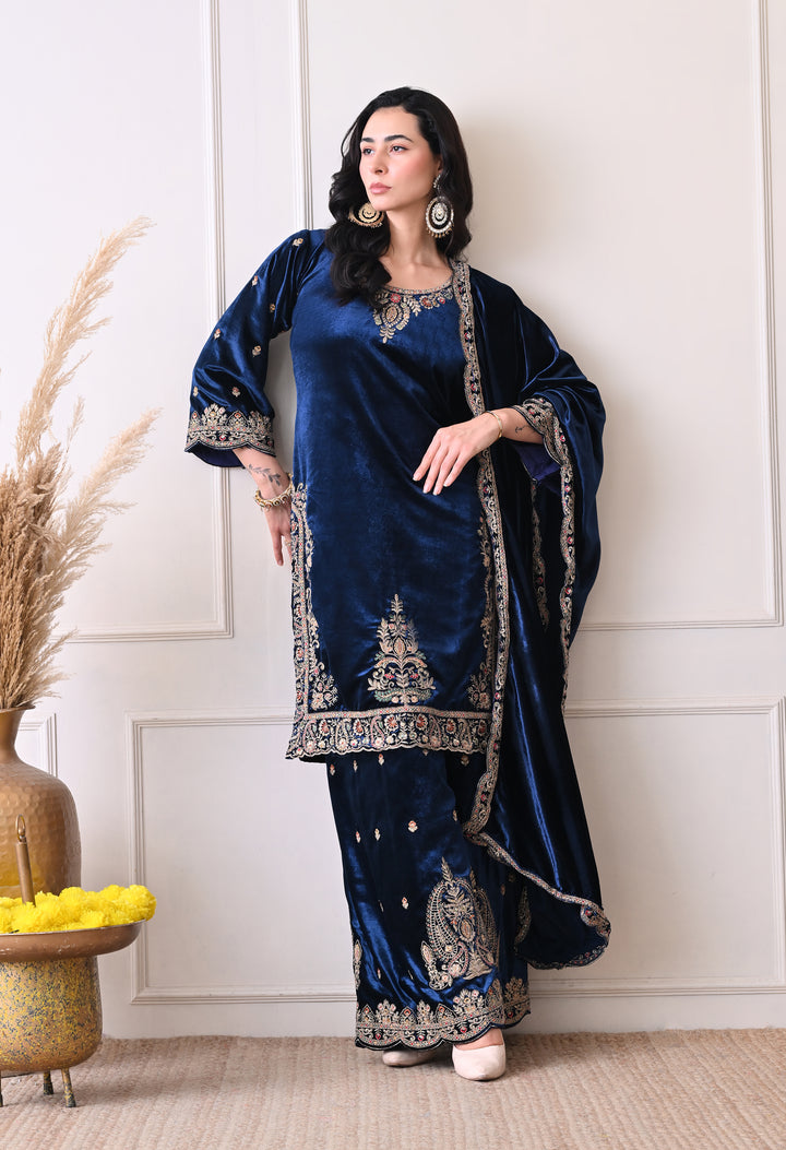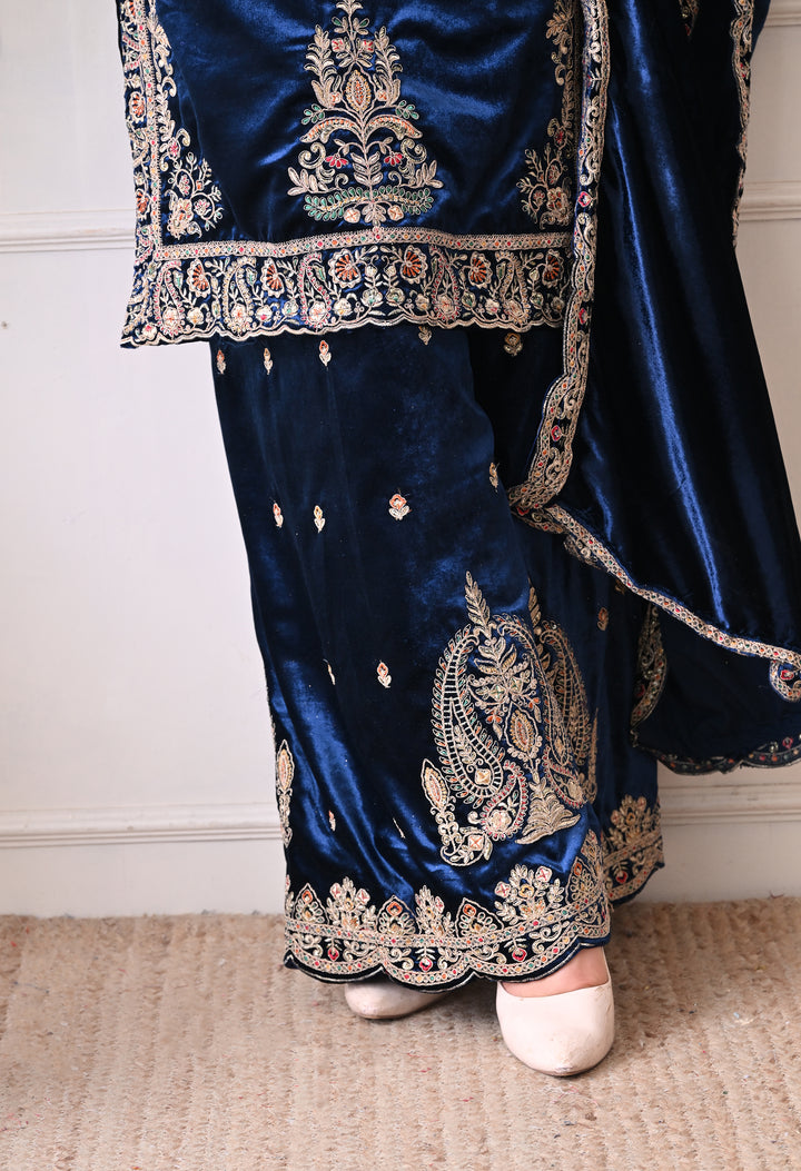 Description:- Pure velvet suit with beautiful hand embroidery done all over the shirt with moti work , tilla work and Sippi work along with Hand embroidered with cutwork detailing palazzo. Paired with beautiful hand embroidered dupatta with cutwork detailing all around tha dupatta.