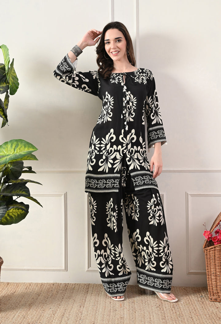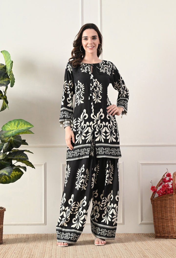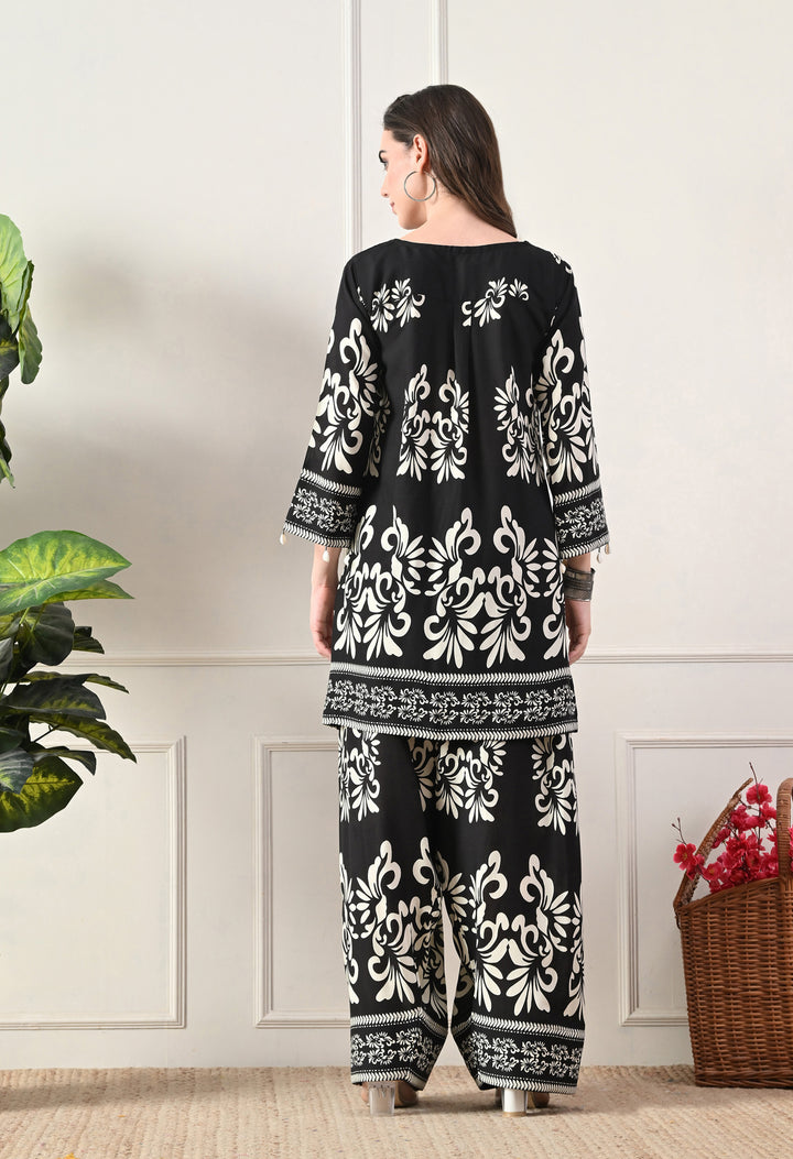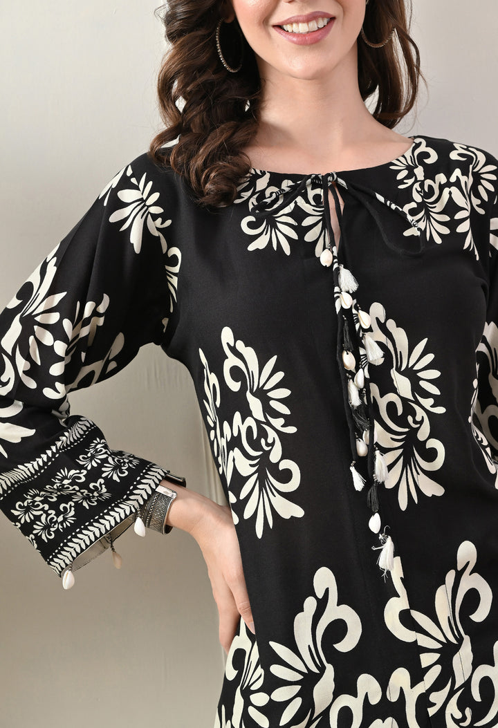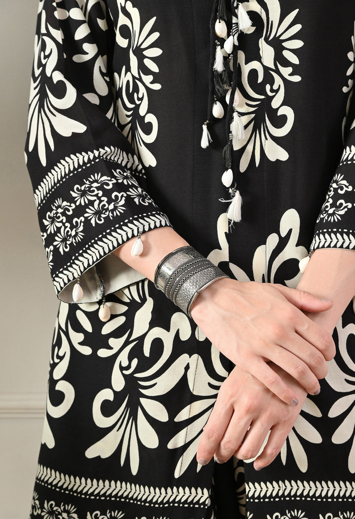 Description:Digitally printed shirt and farshi salwar with beautiful shell tassels on the neckline and sleeves.