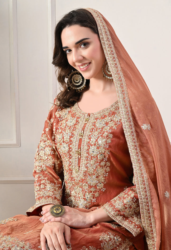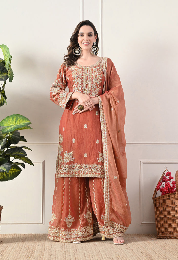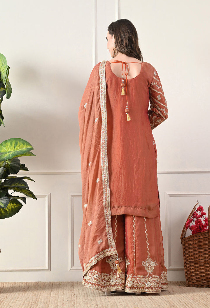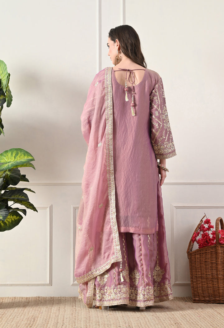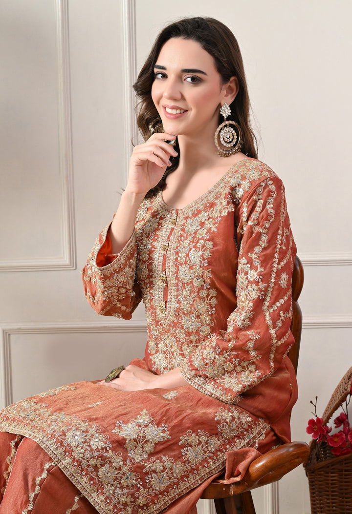 Description:Beautiful shirt with hand embroidered zari and zardozi work Moti work and mirror all over the shirt with Sharara with beautiful embroidery all over it . Along with dupatta with border and tassels all over .