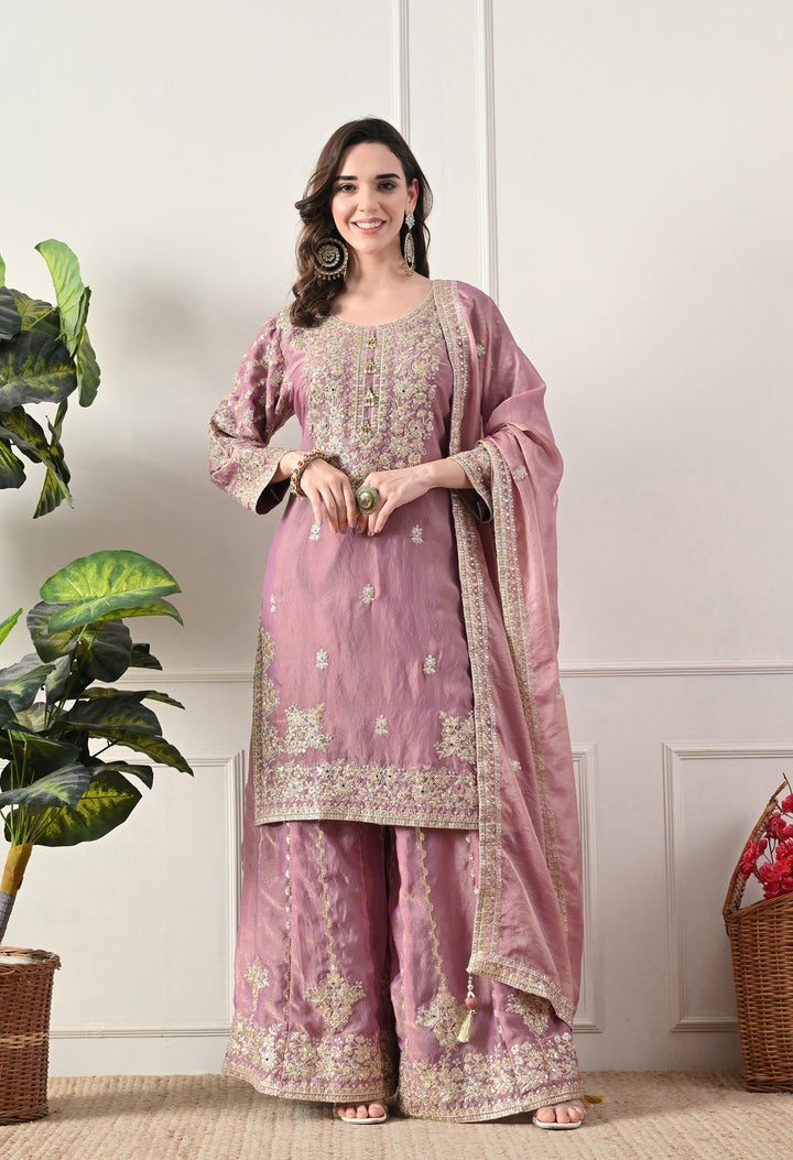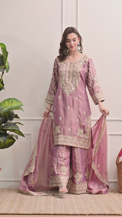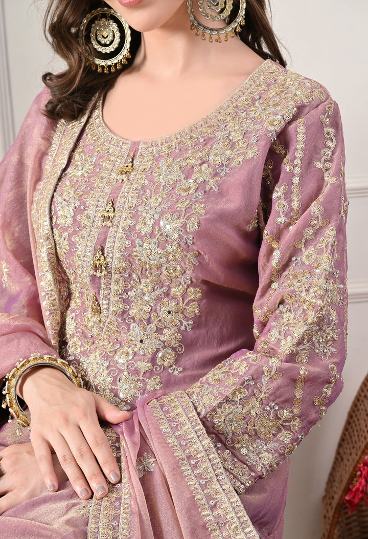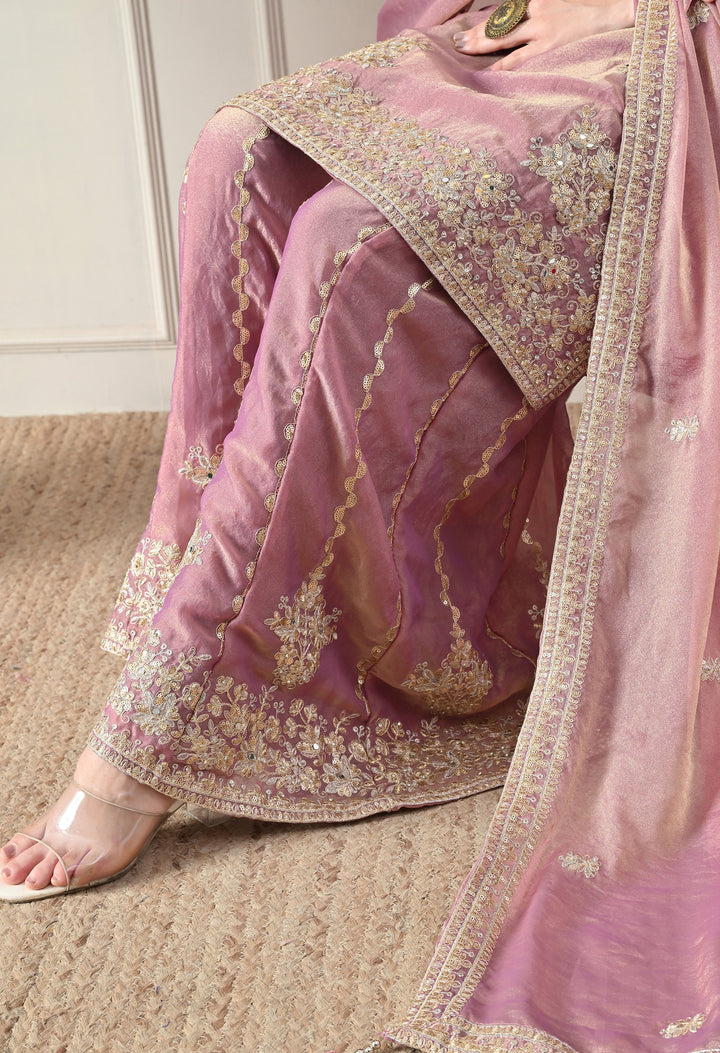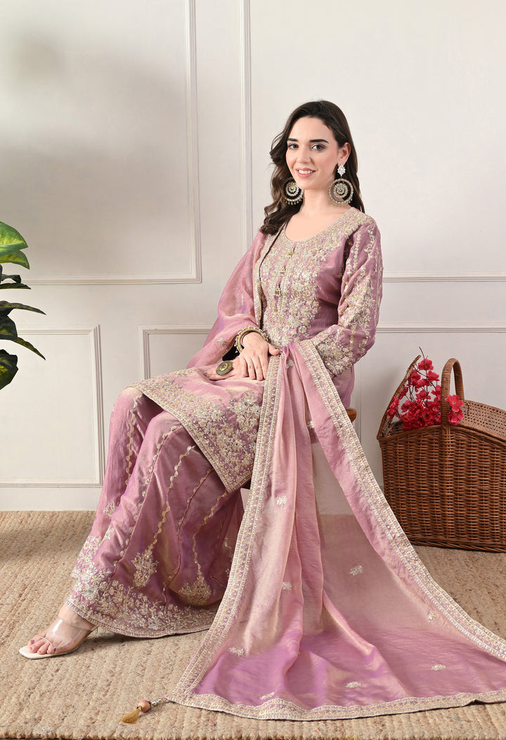 Description:Beautiful shirt with hand embroidered zari and zardozi work Moti work and mirror all over the shirt with Sharara with beautiful embroidery all over it . Along with dupatta with border and tassels all over .