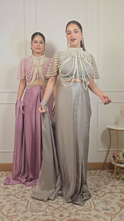 Pre-Draped ready to wear saree with adjustable hooks in saree and blouse totally with handwork with pearl work chains and sleeves beautifully designed with pearl chains