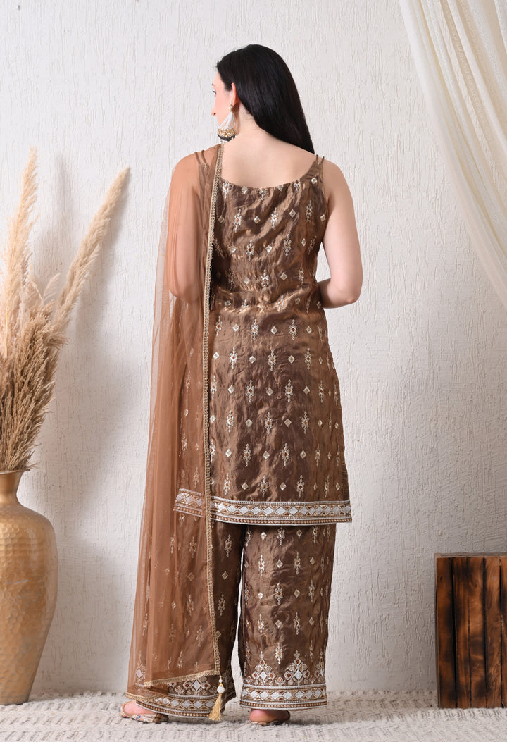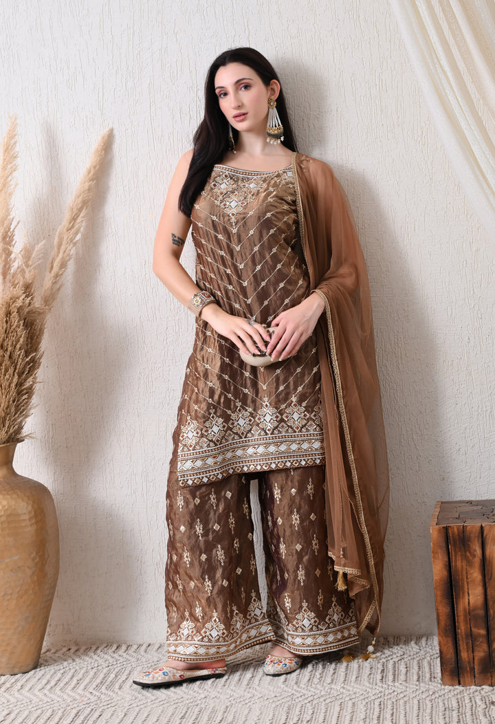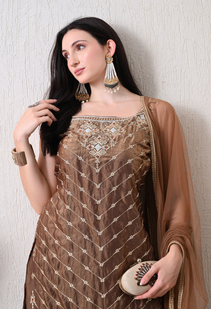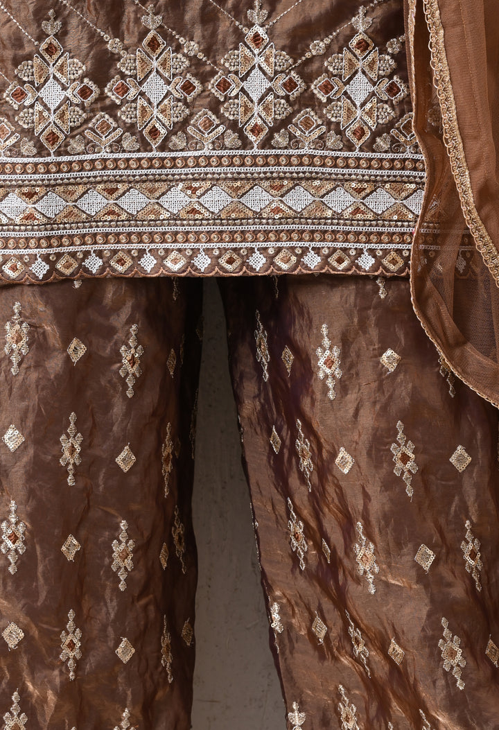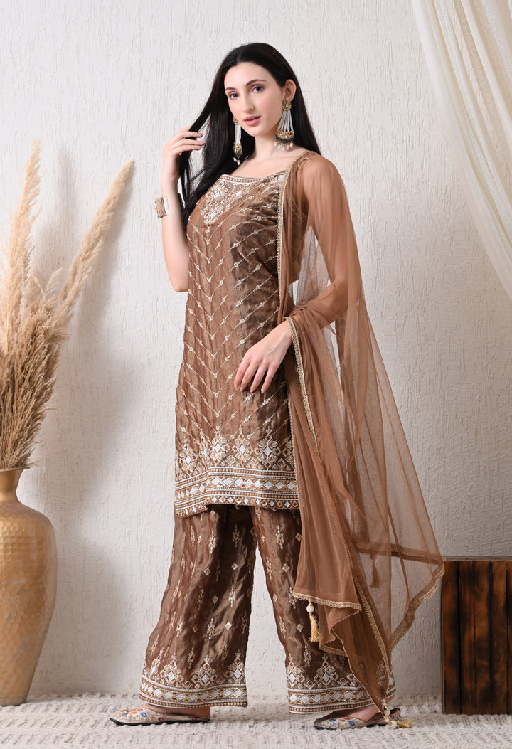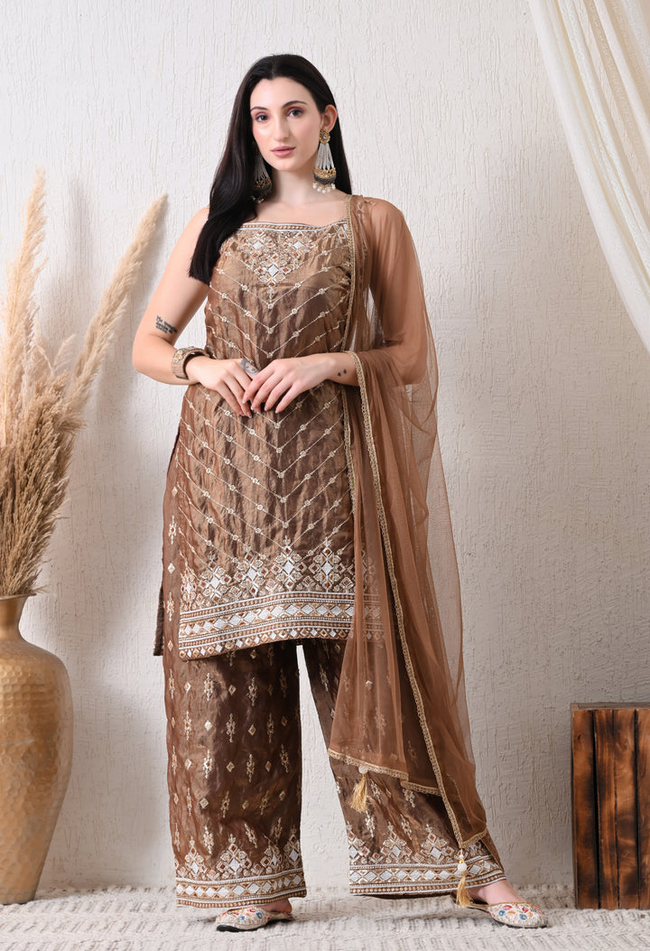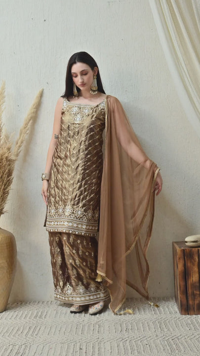 Description:Pakistani style suit Suit with all over Zari work, mirror work, moti work and handwork on the shirt and Sharara with beautiful dupatta with border all over.