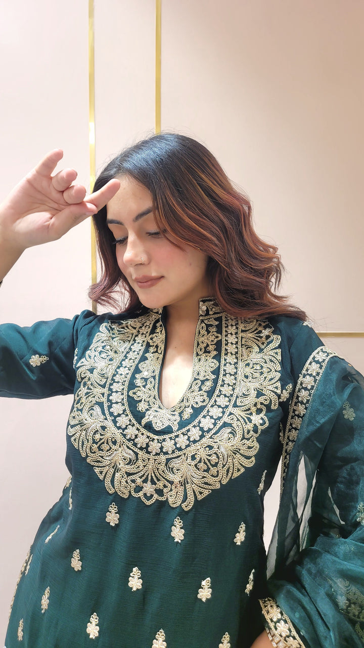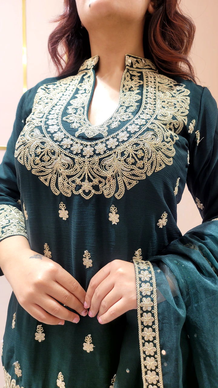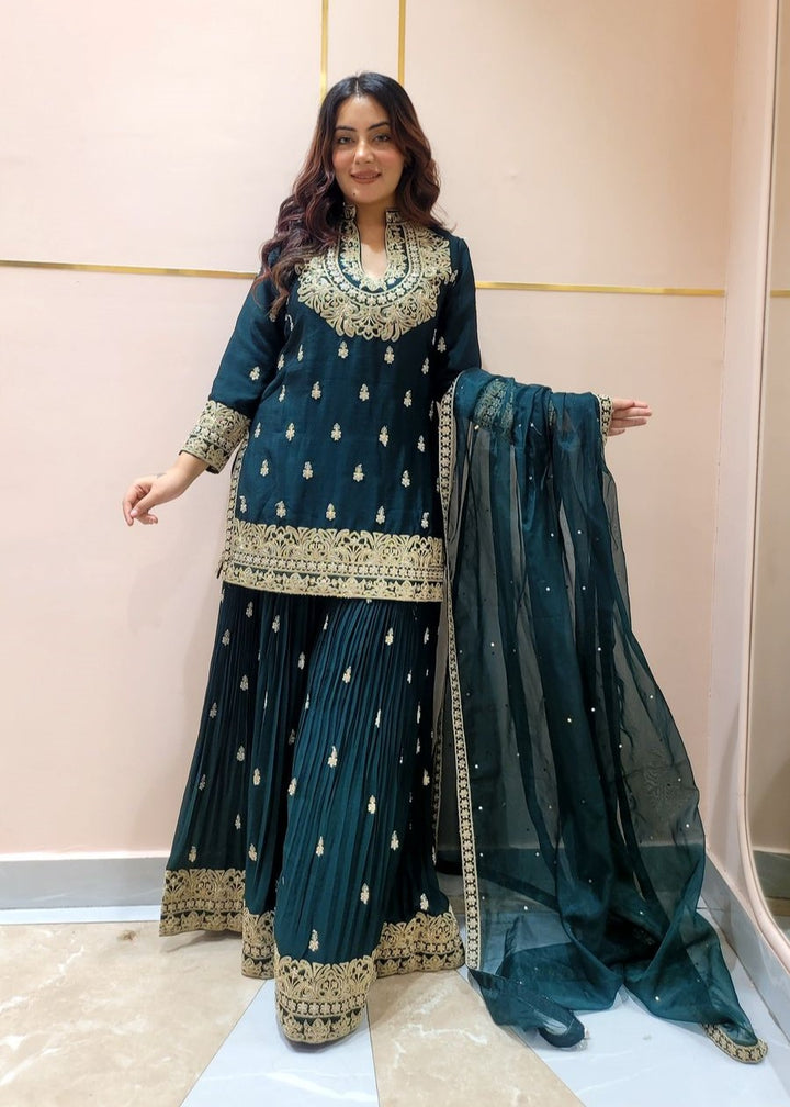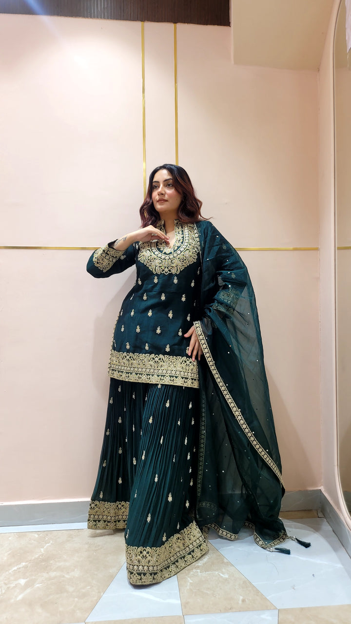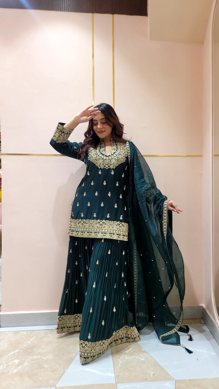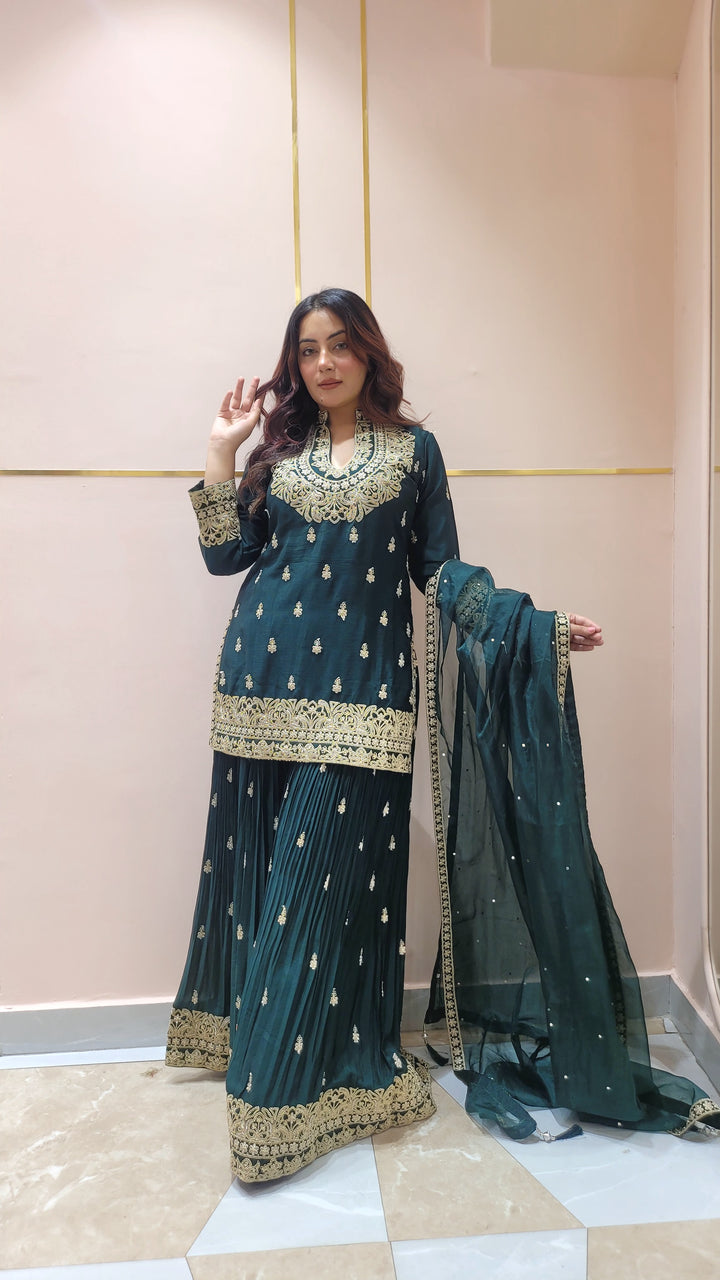 Sharara suit with all over zari work, moti work and handwork on the Shirt and Sharara with work all over beautiful dupatta