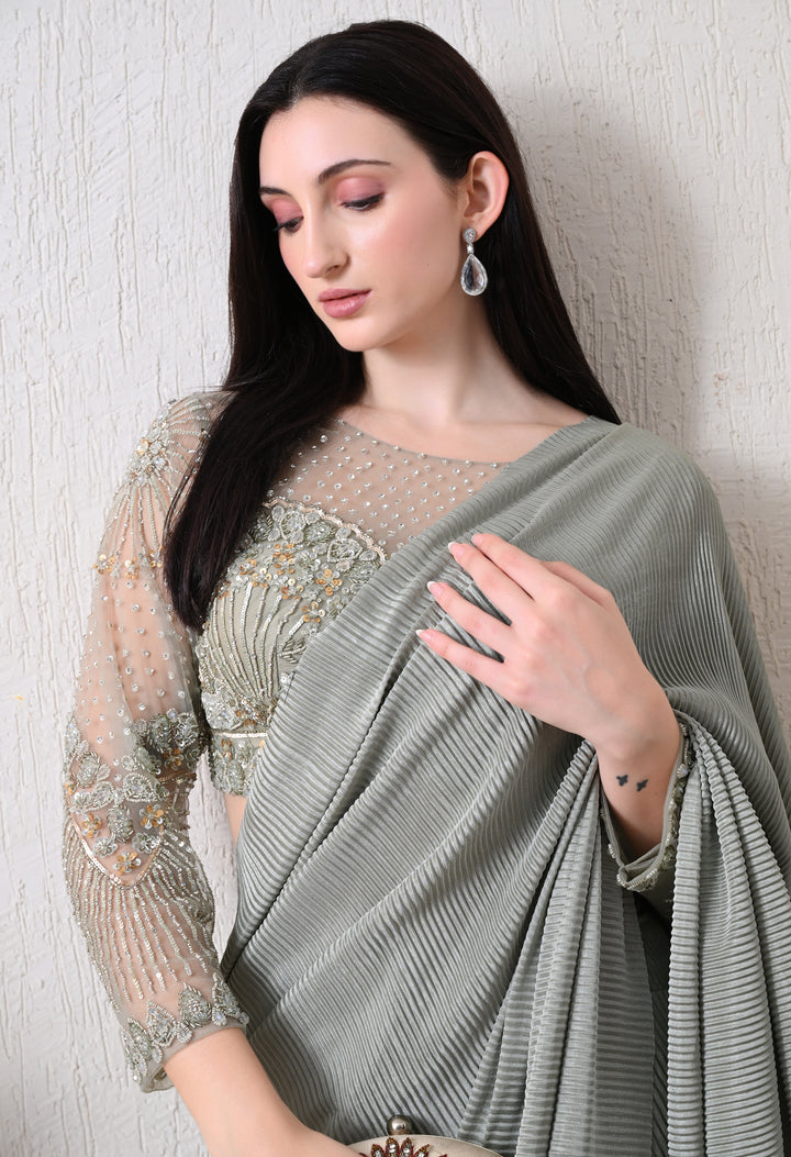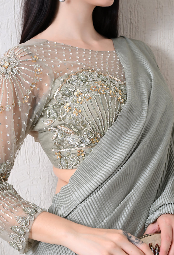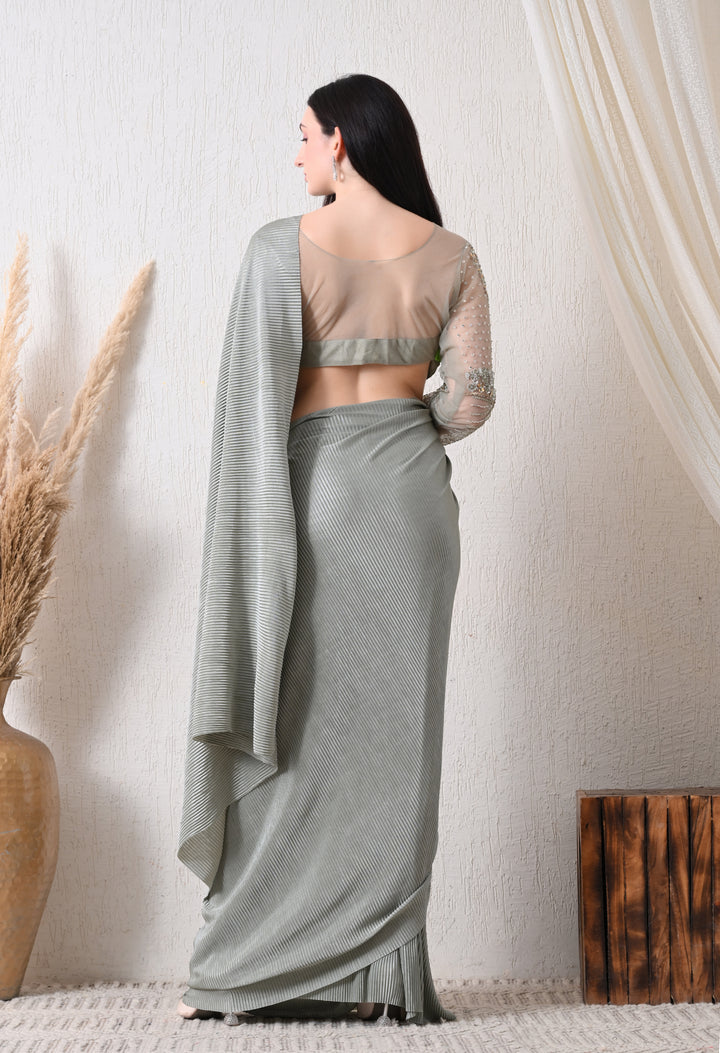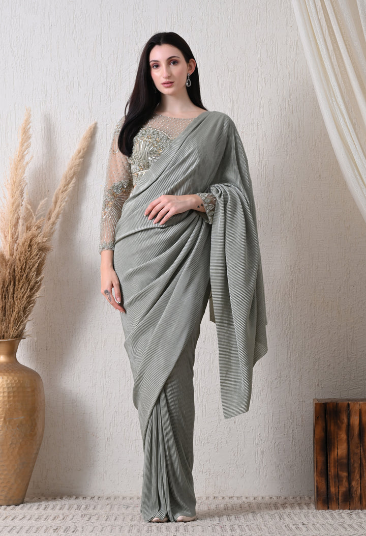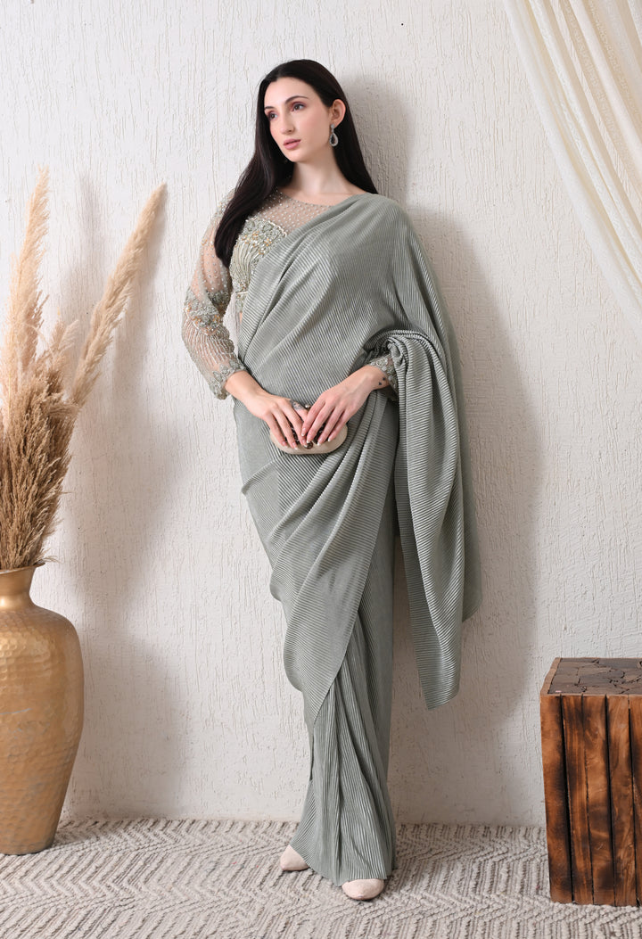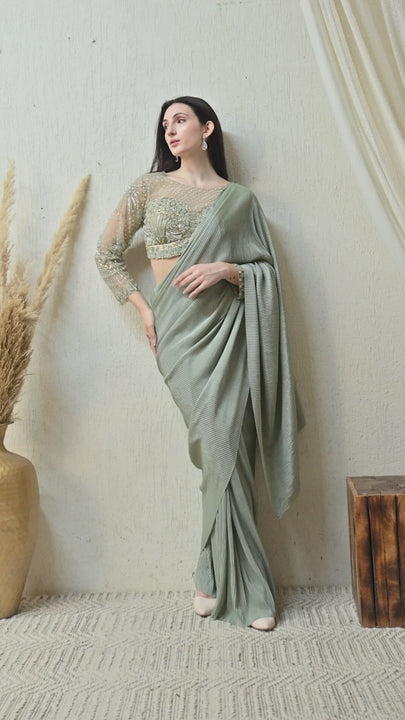 Description: Beautiful heavily embellished blouse with moti work , thread work and Sippi work with Predraped ready to wear saree in beautiful crushed fabric .