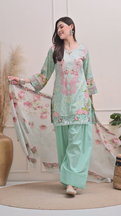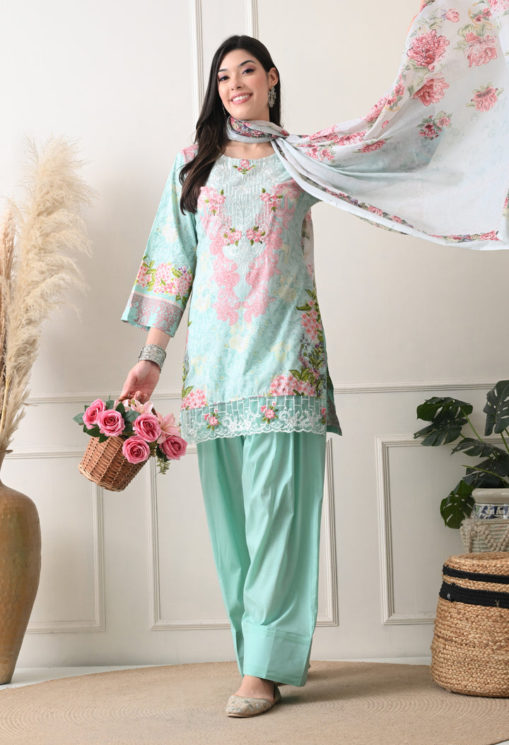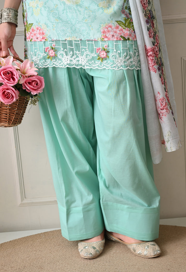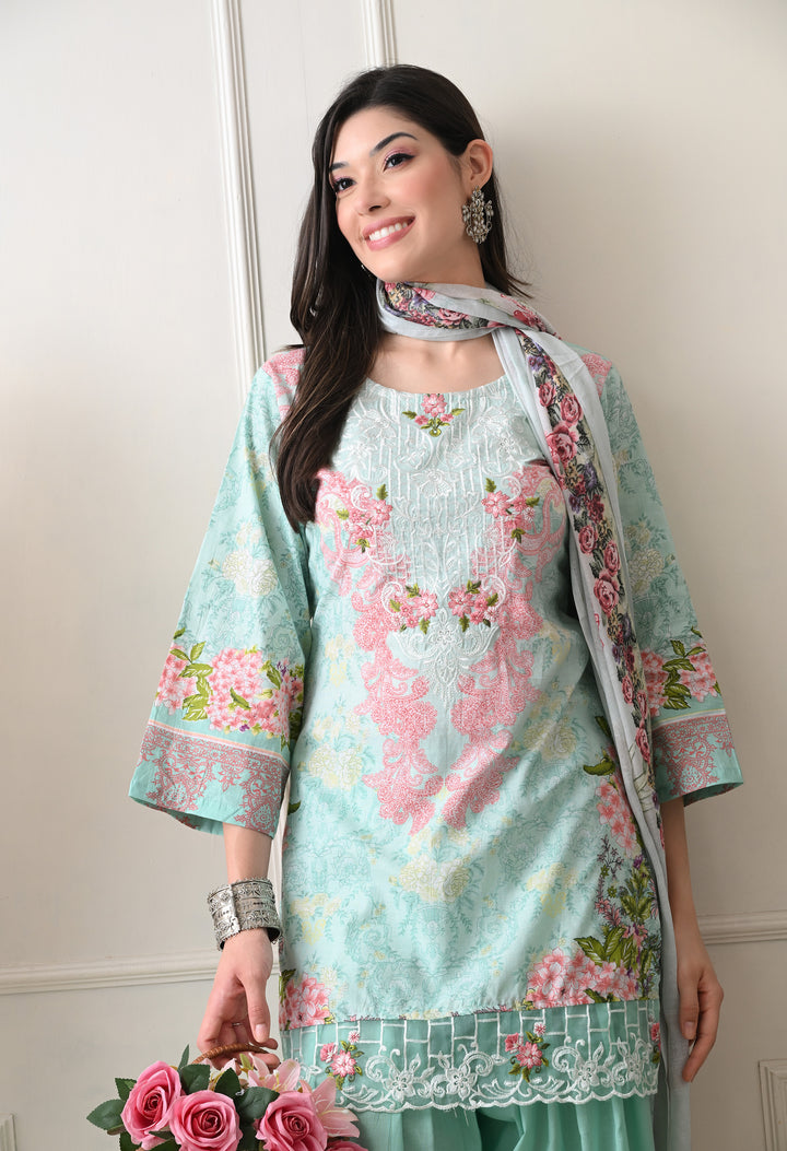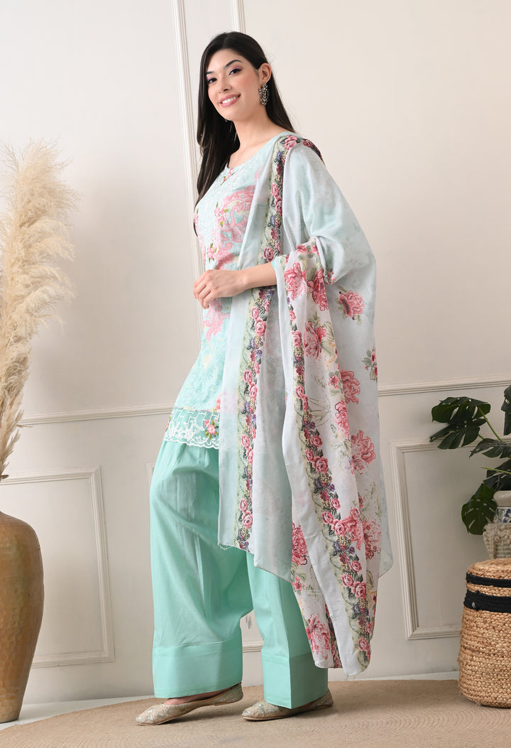 Pakistani Style Farshi suit with all over digital print and lacework on the shirt paired with farshi salwar and digital printed dupatta