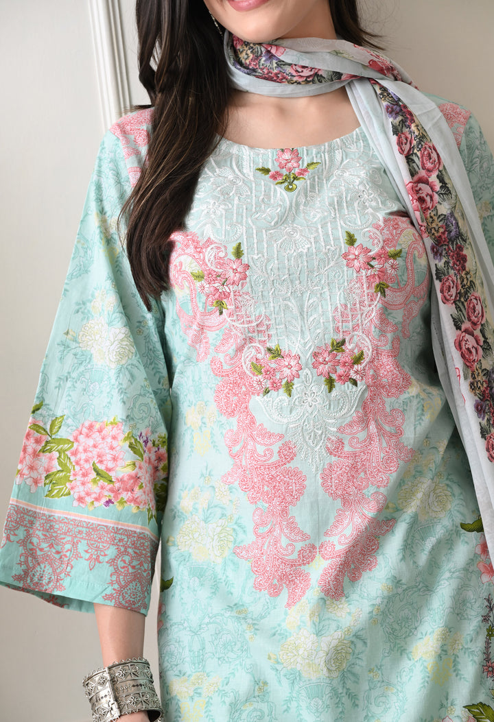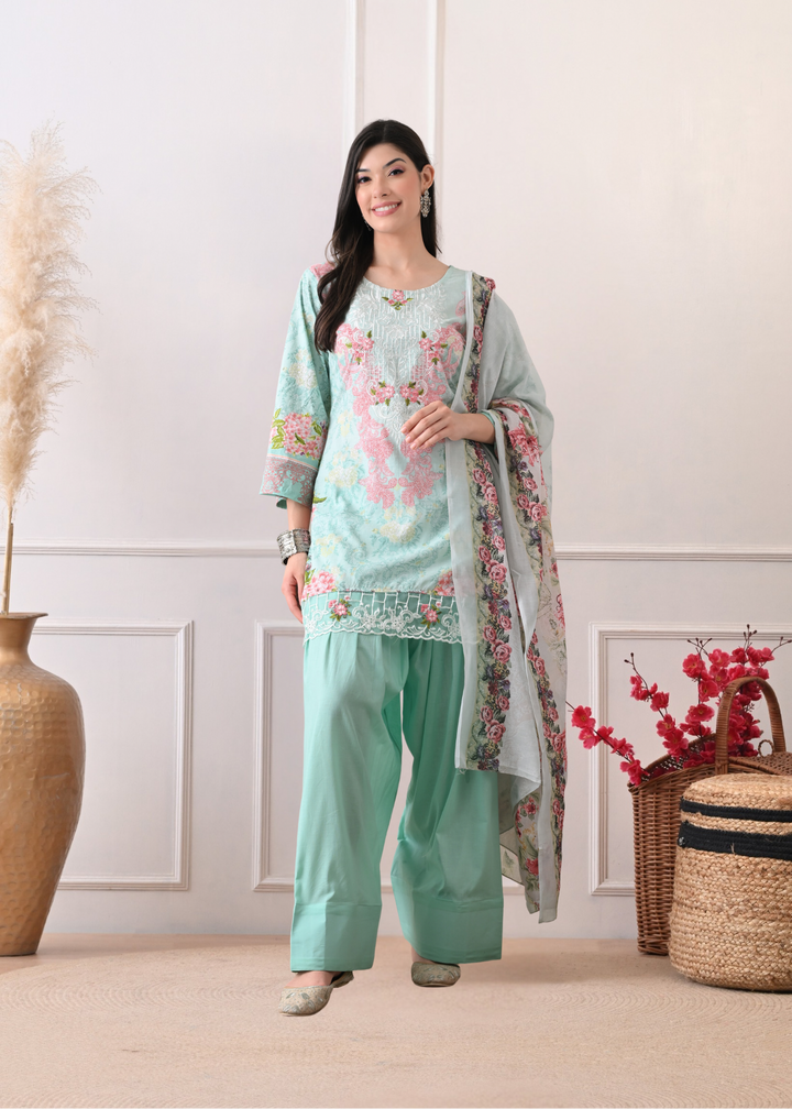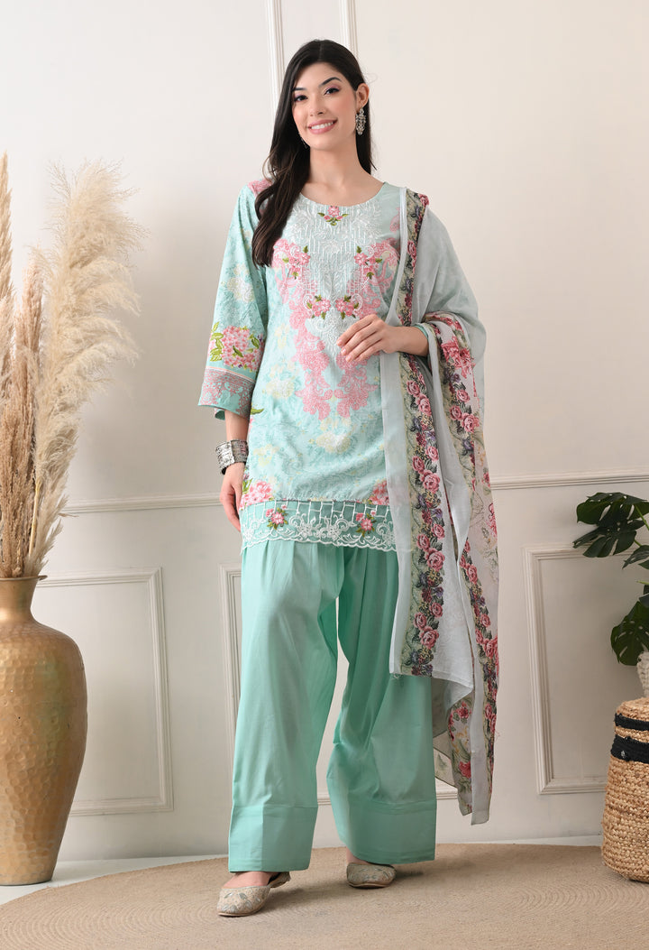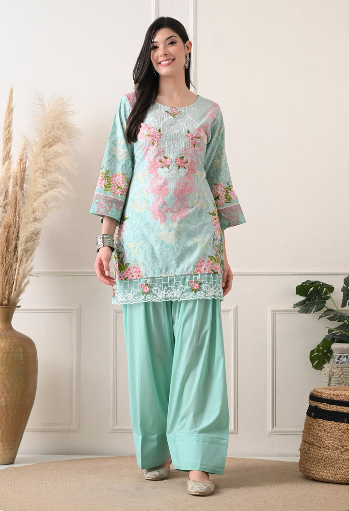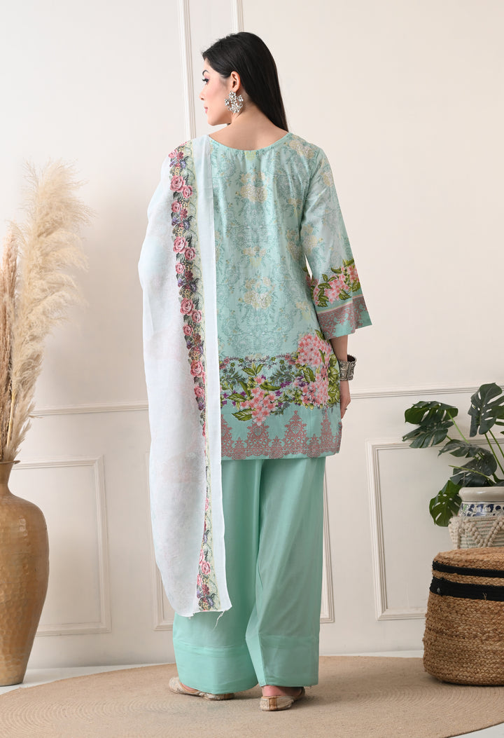 Pakistani Style Farshi suit with all over digital print and lacework on the shirt paired with farshi salwar and digital printed dupatta