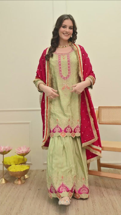 Description:Beautiful shirt with hand embroidered zari and zardozi work Moti work and mirror all over the shirt with gharara with beautiful embroidery all over it and cutwork at the bottom of shirt and gharara . Along with contrast dupatta with border and tassels all over .