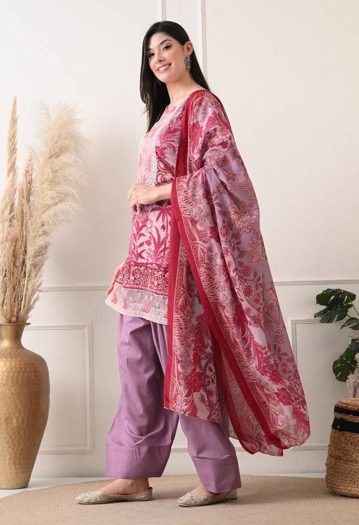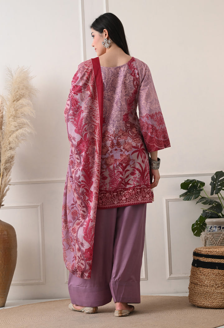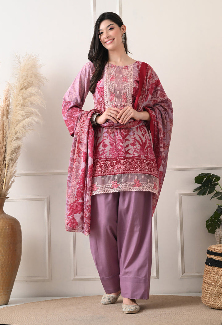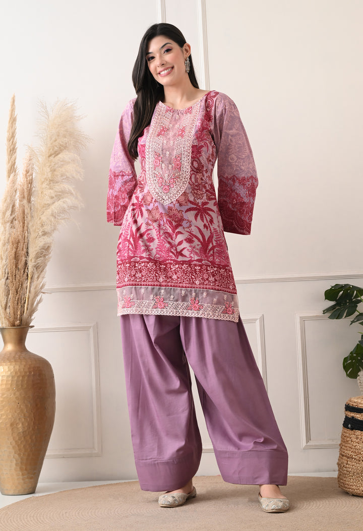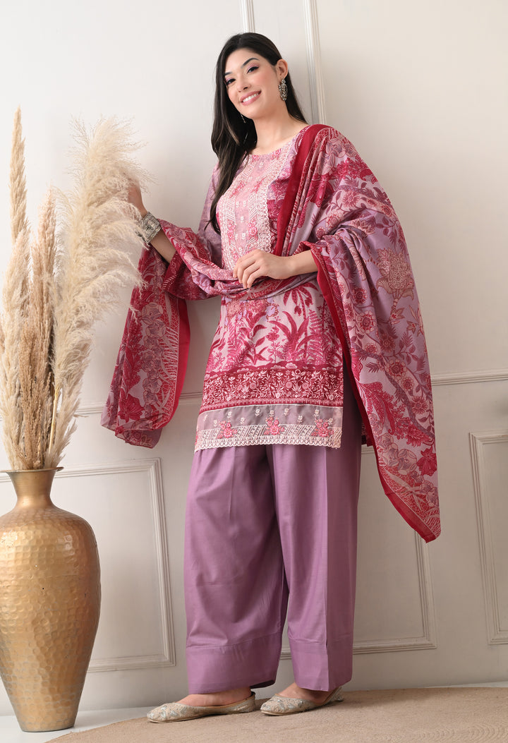 Pakistani Style Farshi suit with all over digital print and lacework on the shirt paired with farshi salwar and digital printed dupatta