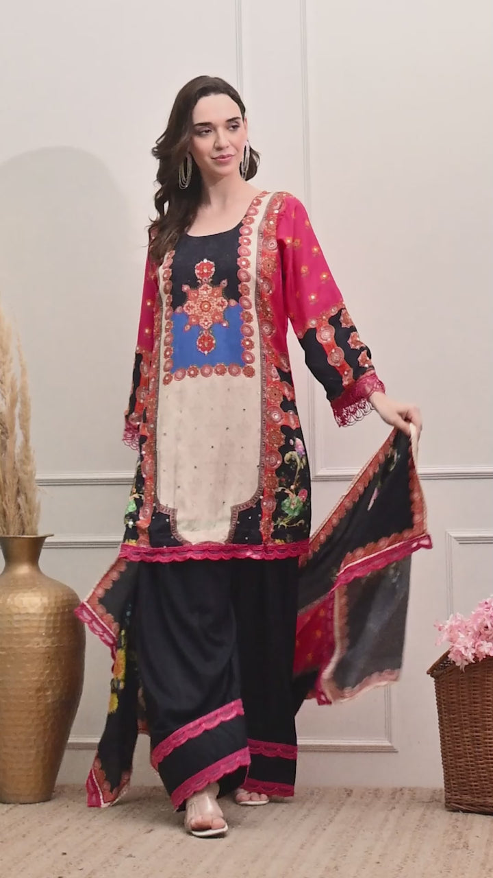 Suit with all over digital print and mirror work on the shirt with lacework on hemline, sleeves paired with beautiful farshi salwar and lacework on beautiful digital printed dupatta
