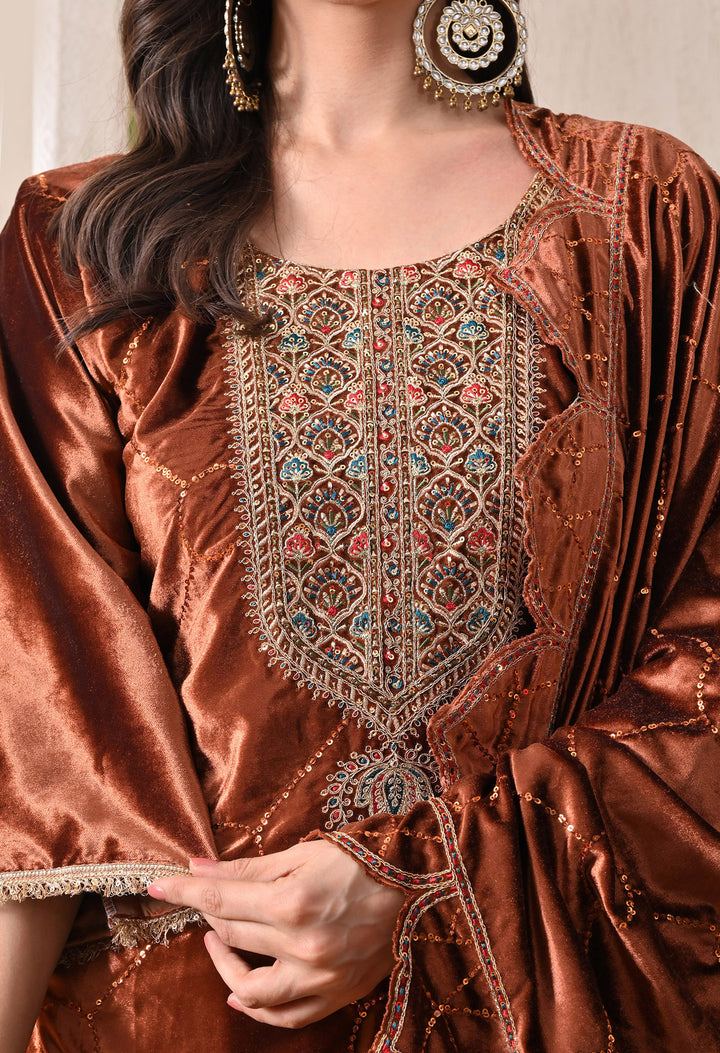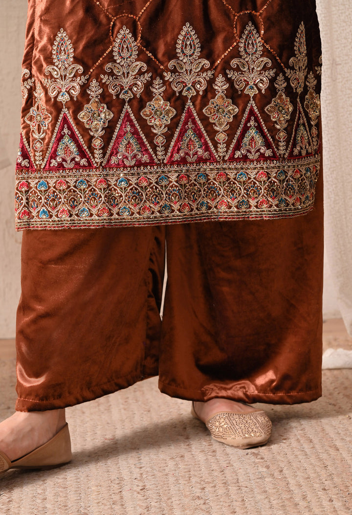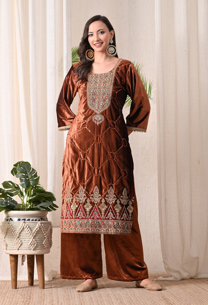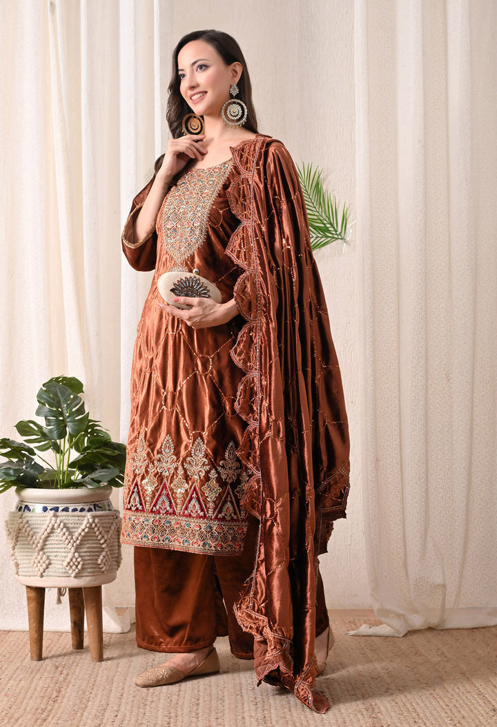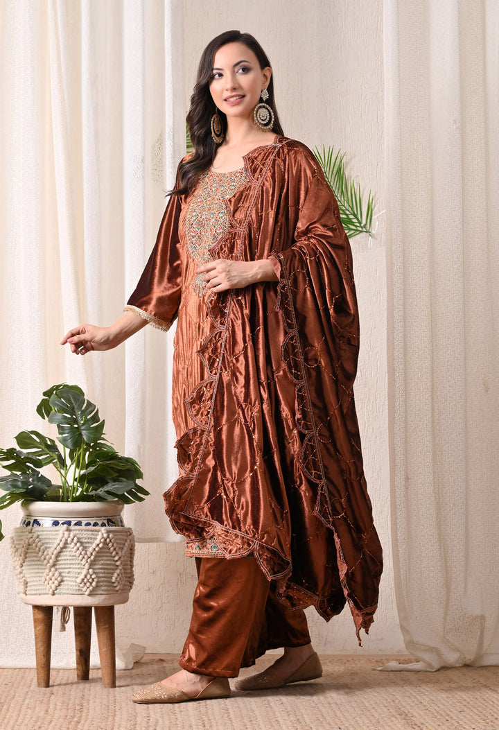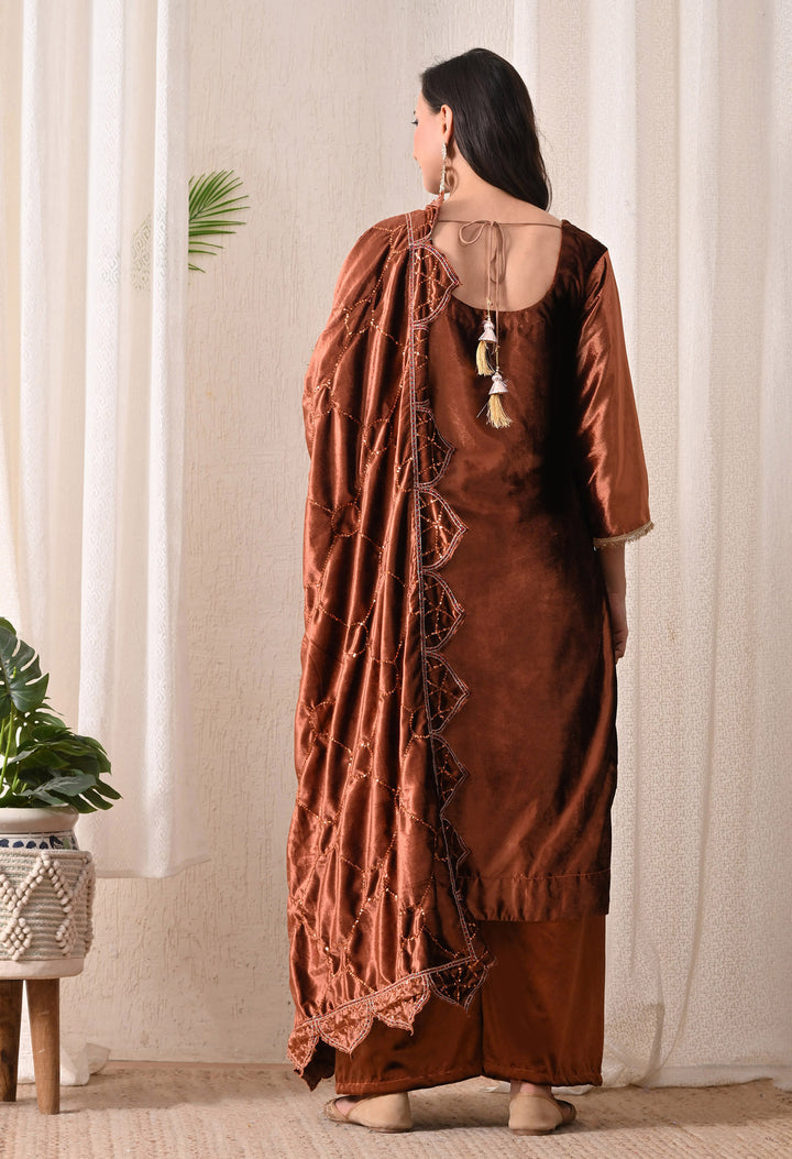Description:- Pure velvet suit with beautiful hand embroidery done all over the shirt with moti work and Sippi work along with monochrome palazzo. Paired with beautiful hand embroidered dupatta with cutwork detailing all around tha dupatta.