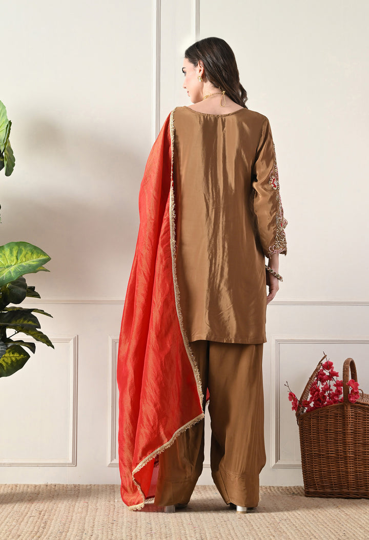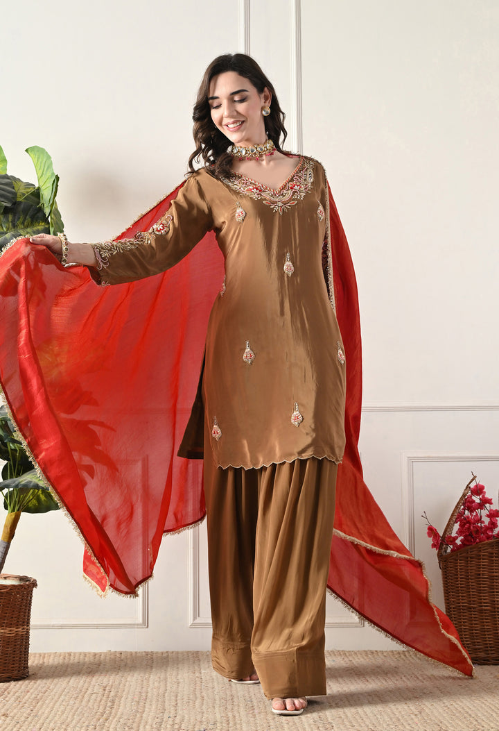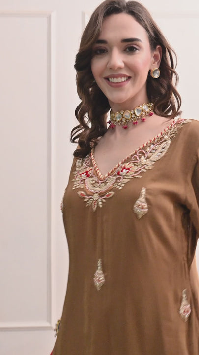 Description:Shirt with beautiful hand embroidered neckline with cuttdana work, moti work , thread work and Sippi work along with beautiful hand embroidered booties all over the shirt and sleeves with cutwork detailing at the bottom of the shirt paired with farshi salwaar and contract dupatta with Kiran all over it .
