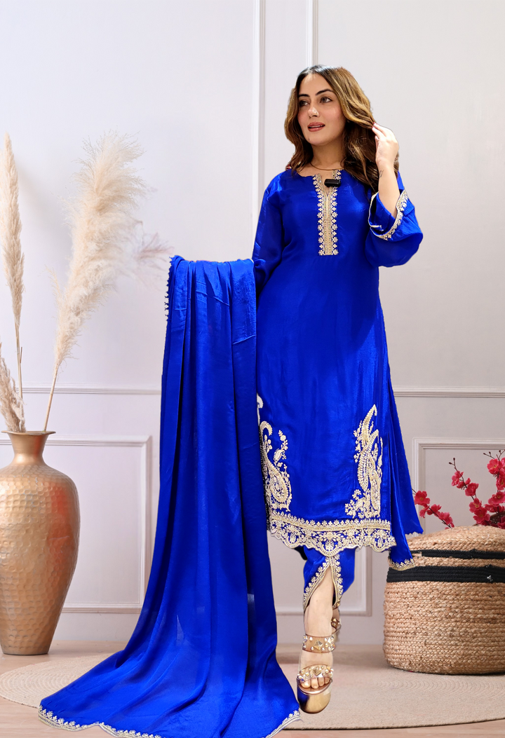 A vibrant kurta set adorned with delicate golden embroidery on the neckline, hemline and pakistani sleeves, paired with tulip pants and beautiful dupatta with work