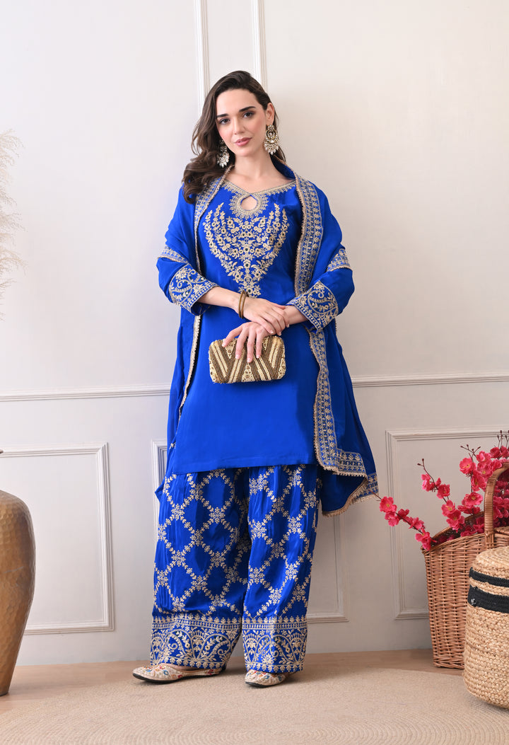 Shirt with Full hand embroidered neckline and hand embroidered details on the sleeves with dabka work Paired with beautiful heavily embroidered Farshi salwaar along with dupatta with border all over it.